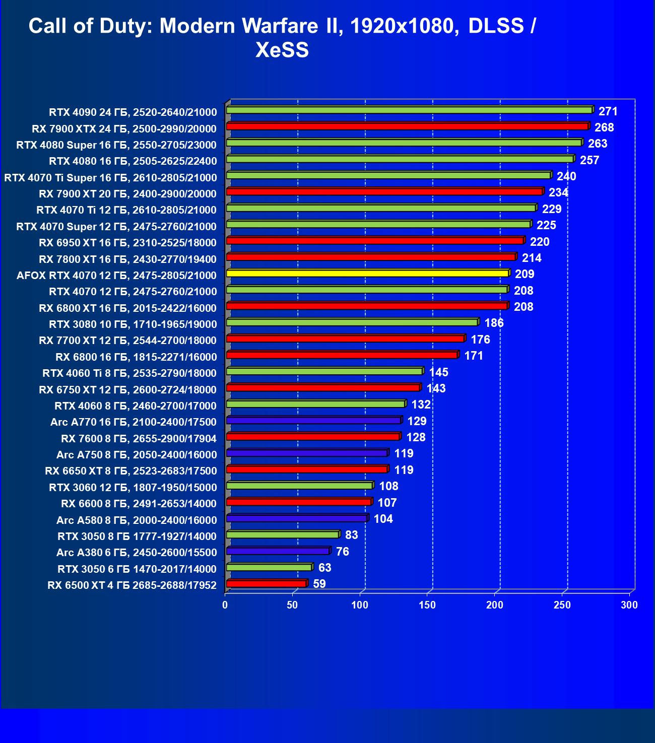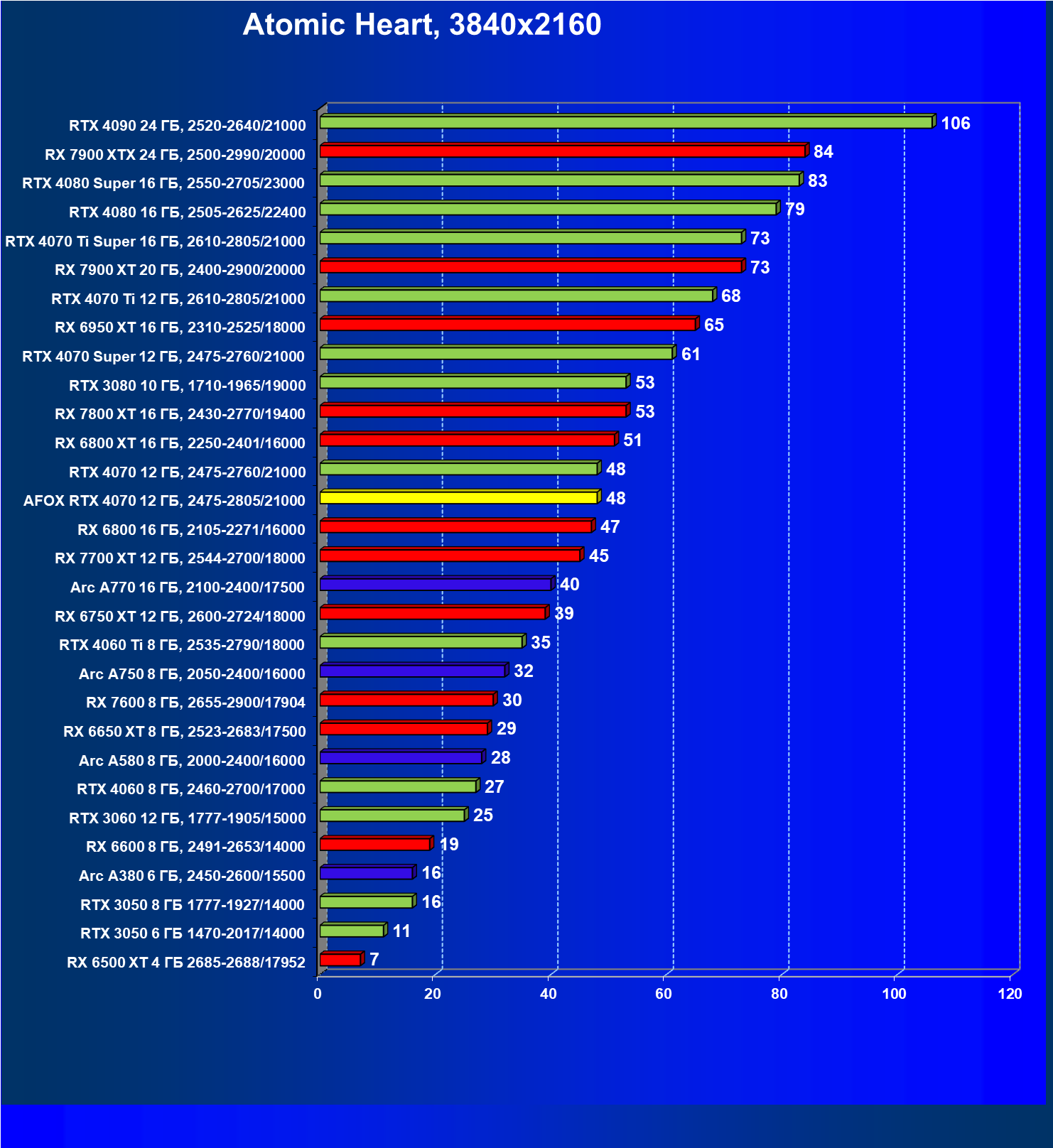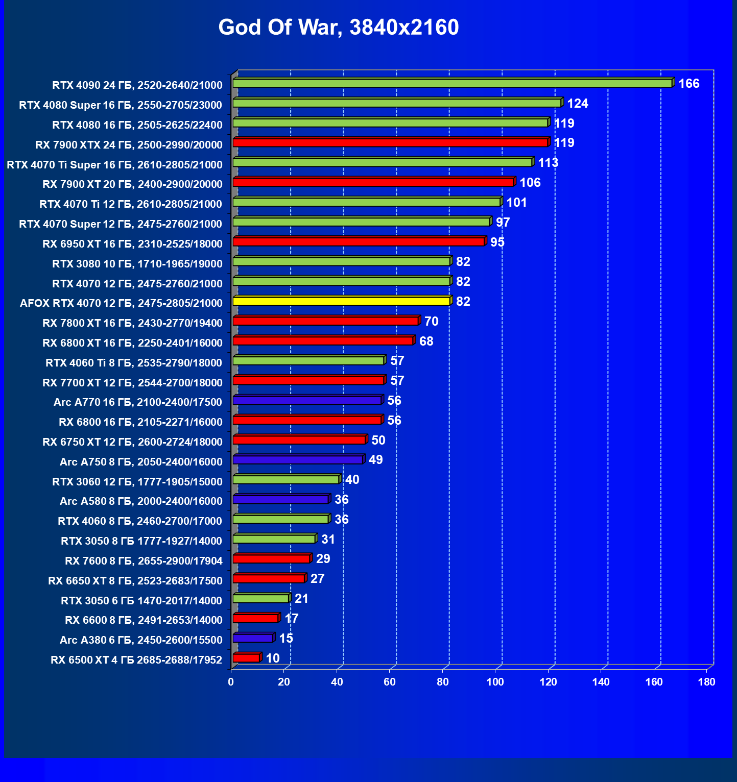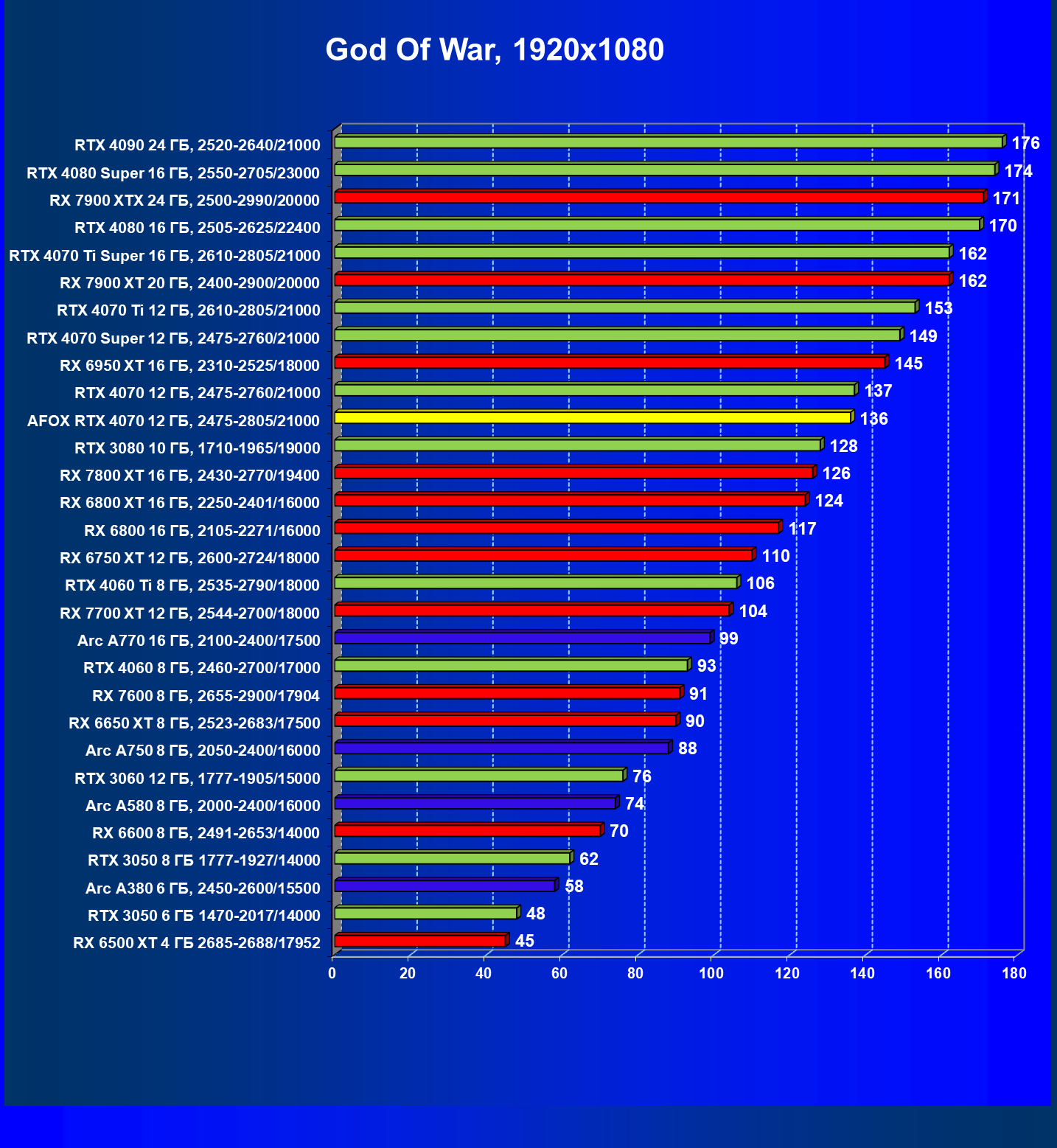 | 09 | Afox RTX 4070 12 ГБ, 2475—2805/21000 | 1322 | 228 | 58 000 |