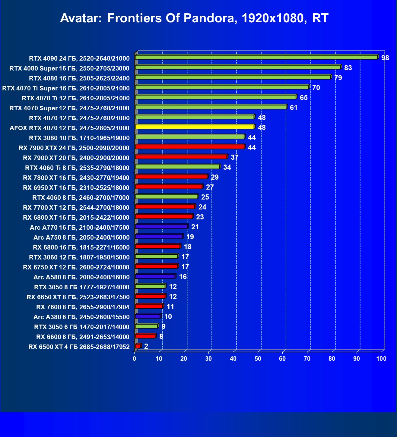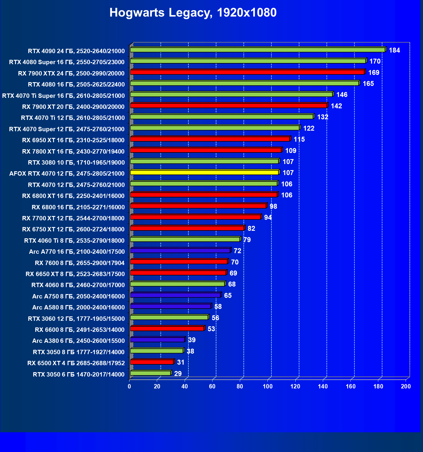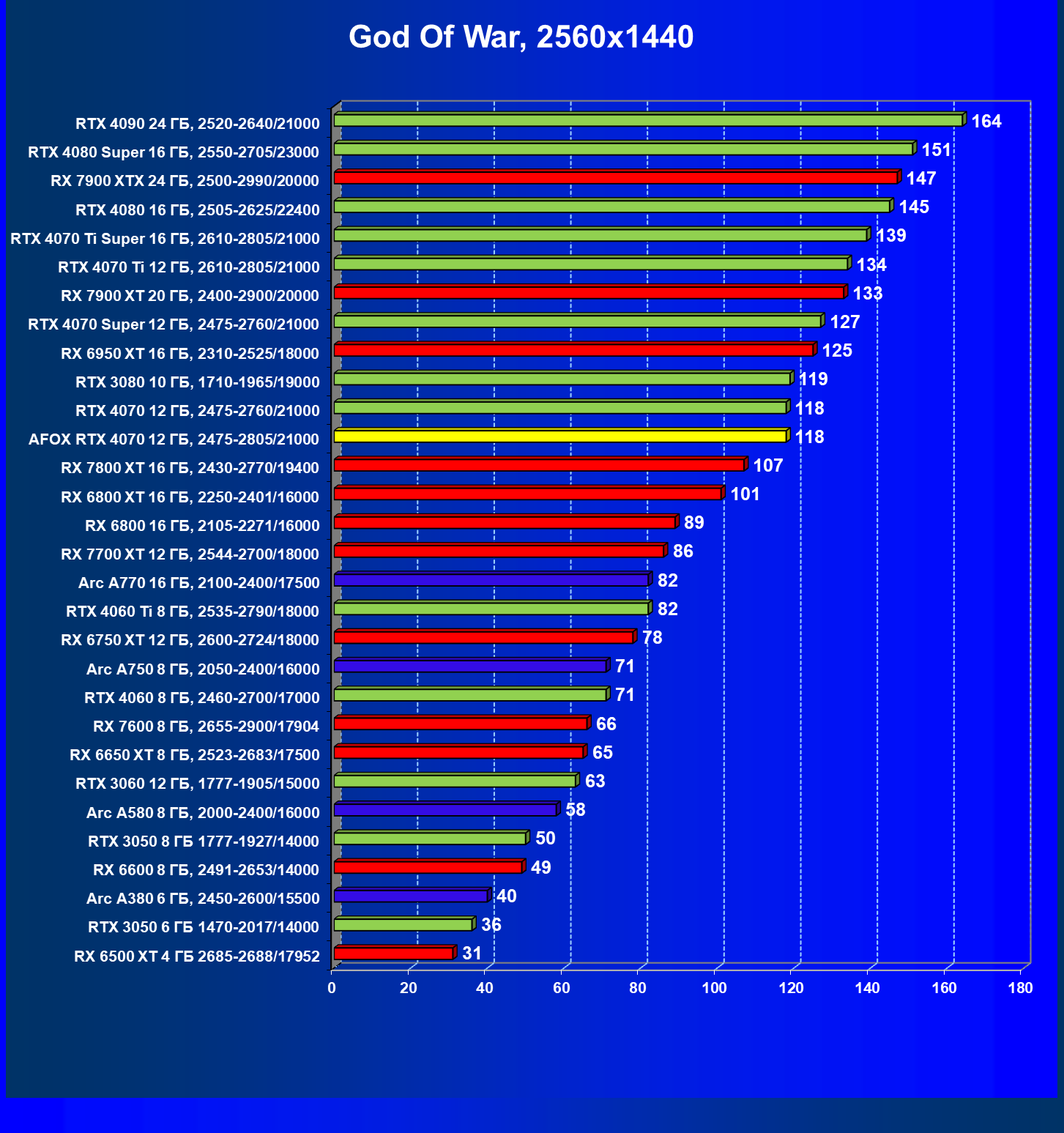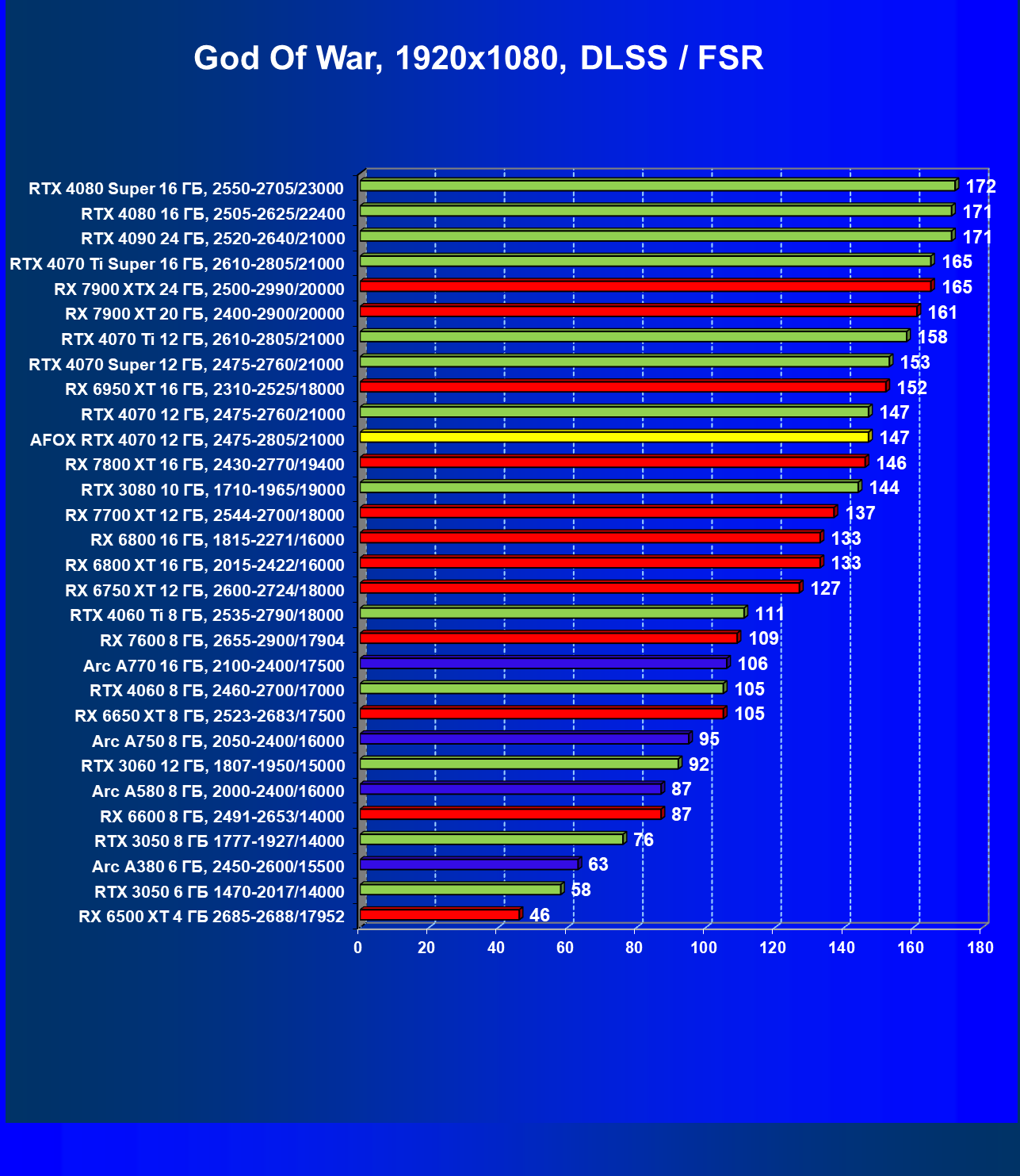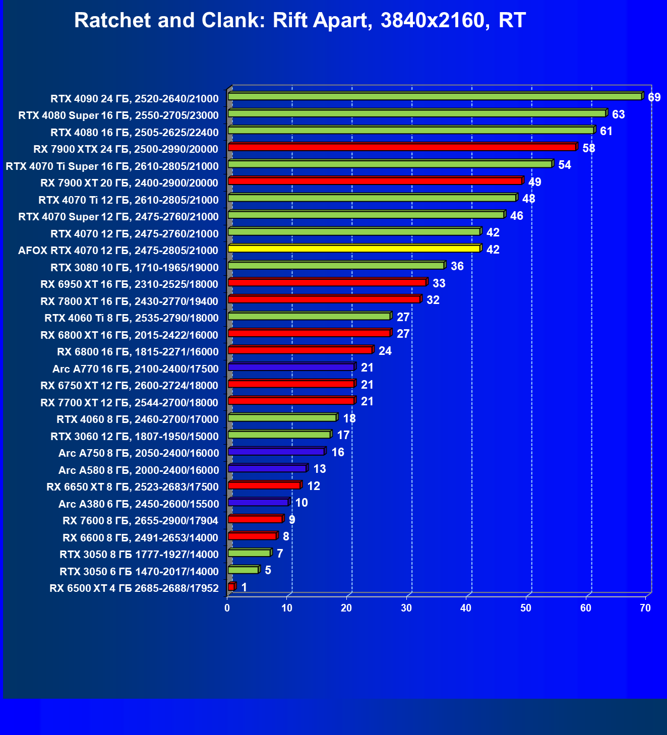 | 09 | Afox RTX 4070 12 ГБ, 2475—2805/21000 | 1322 | 228 | 58 000 |