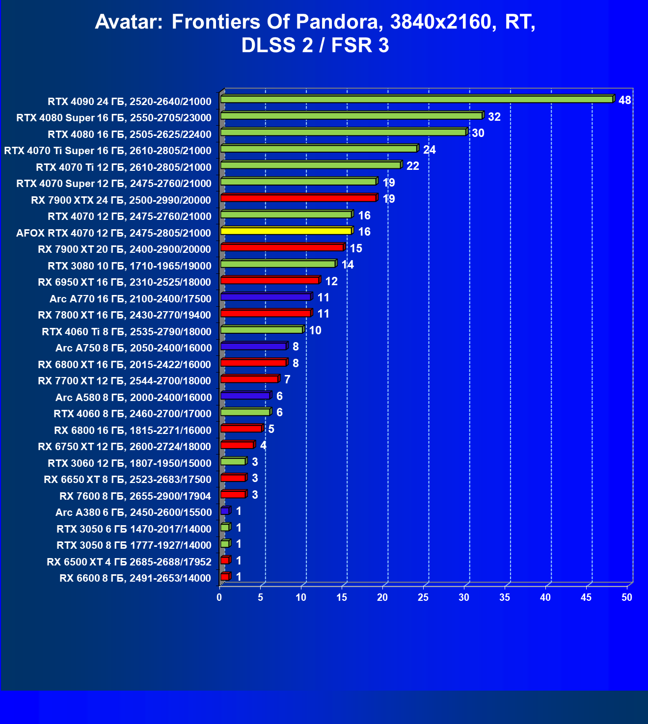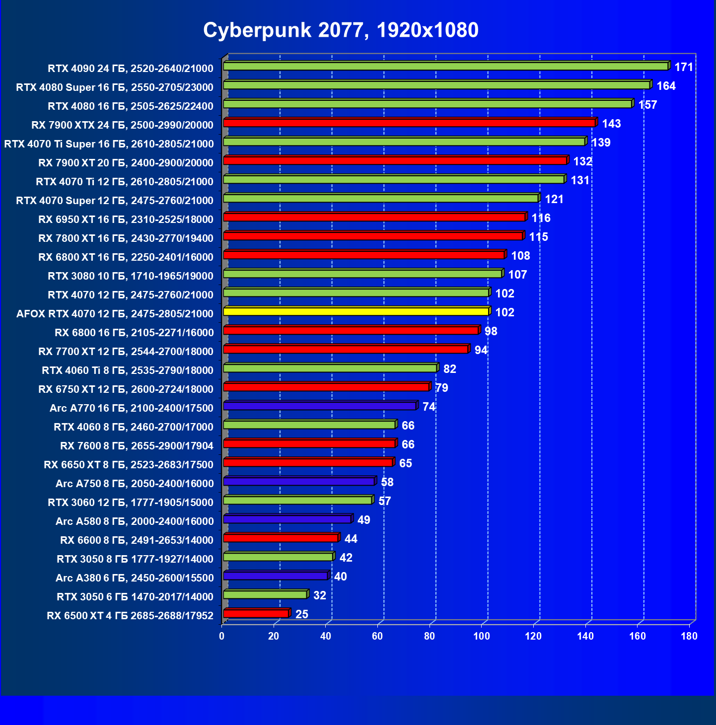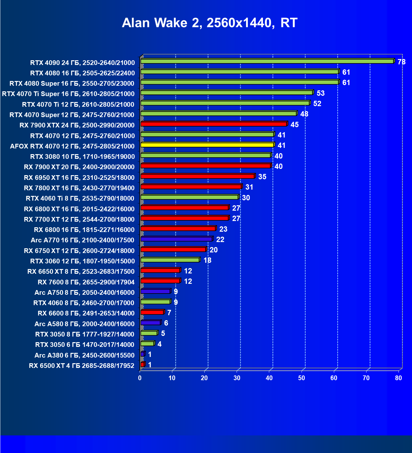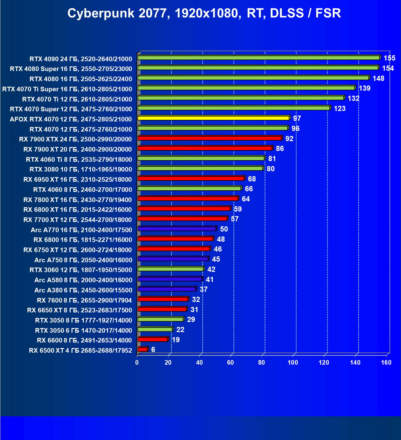 Более драматичное падение FPS от включения RT в играх, которое немного сгладило включение технологии масштабирования FSR, привело к тому, что GeForce RTX 4070 в целом и карта Afox в частности вышли на первые позиции в своей группе. А более дорогой GeForce RTX 3080 отстал из-за отсутствия поддержки DLSS 3, которой обладают карты семейства GeForce RTX 40 (в наших тестах уже есть несколько игр с поддержкой DLSS 3). Также очевидно, что и более дорогой ускоритель Radeon RX 7800 XT здесь сильно отстает от GeForce RTX 4070.