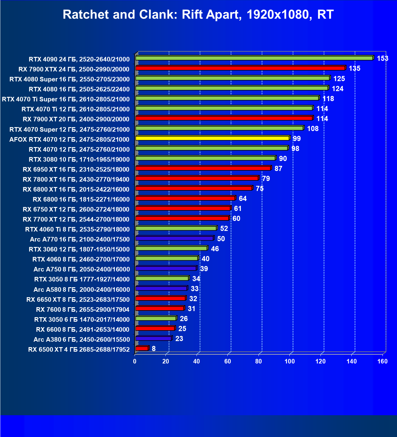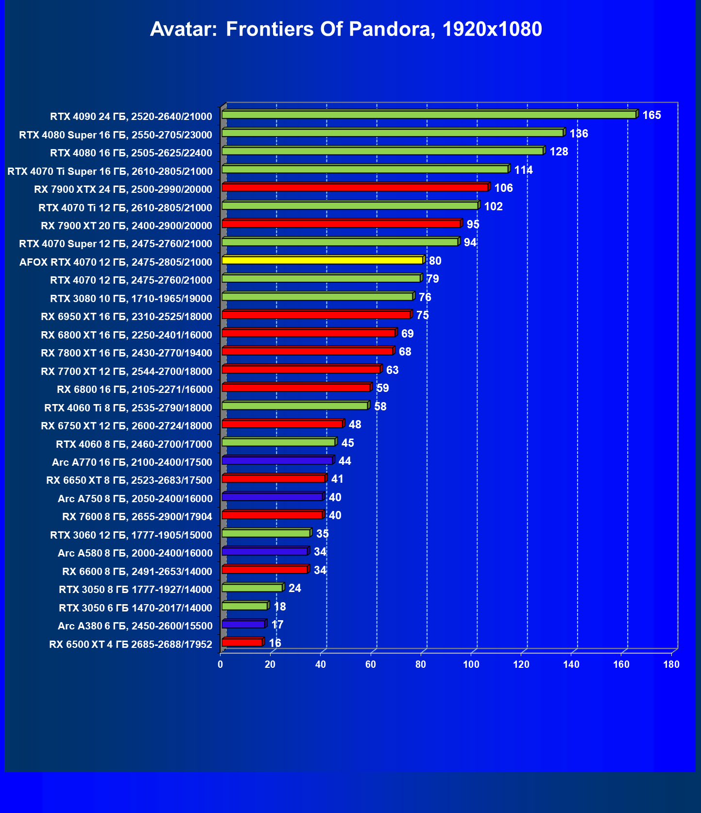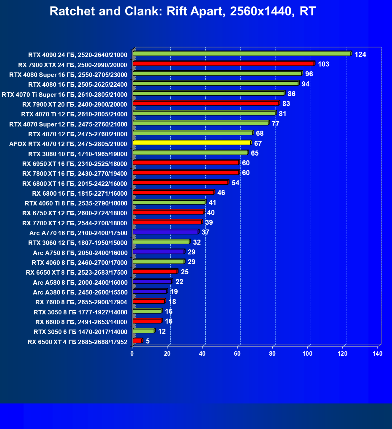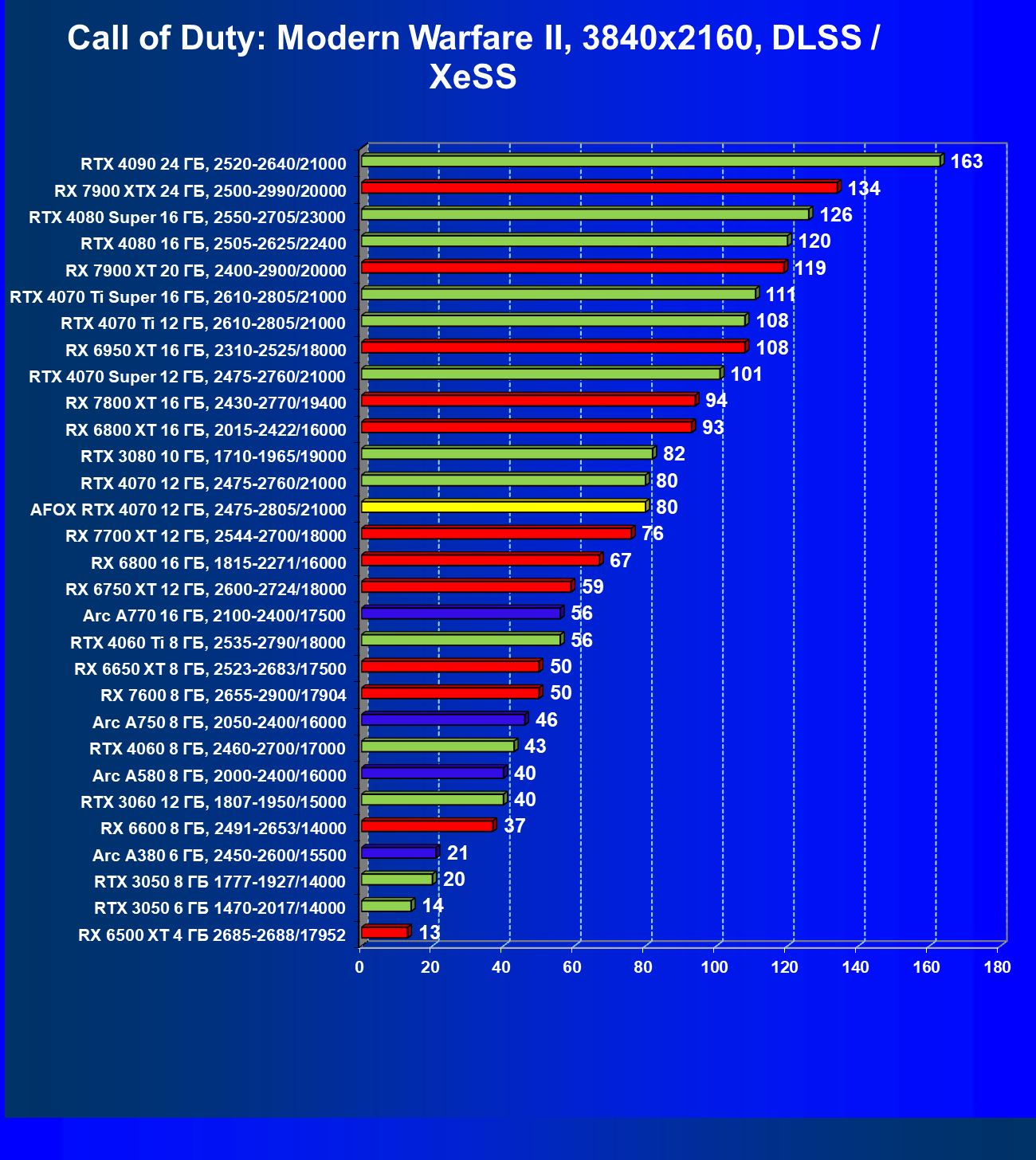 Более драматичное падение FPS от включения RT в играх, которое немного сгладило включение технологии масштабирования FSR, привело к тому, что GeForce RTX 4070 в целом и карта Afox в частности вышли на первые позиции в своей группе. А более дорогой GeForce RTX 3080 отстал из-за отсутствия поддержки DLSS 3, которой обладают карты семейства GeForce RTX 40 (в наших тестах уже есть несколько игр с поддержкой DLSS 3). Также очевидно, что и более дорогой ускоритель Radeon RX 7800 XT здесь сильно отстает от GeForce RTX 4070.