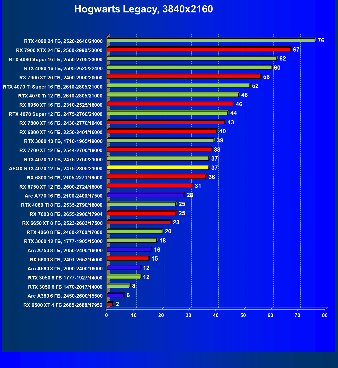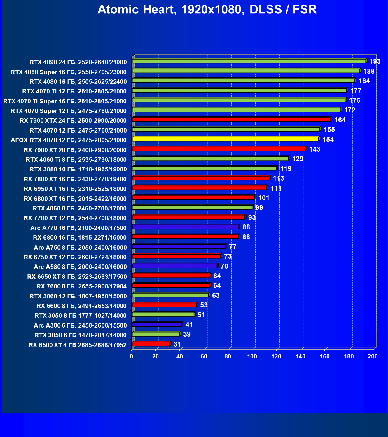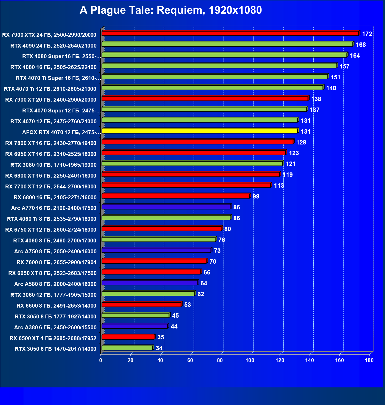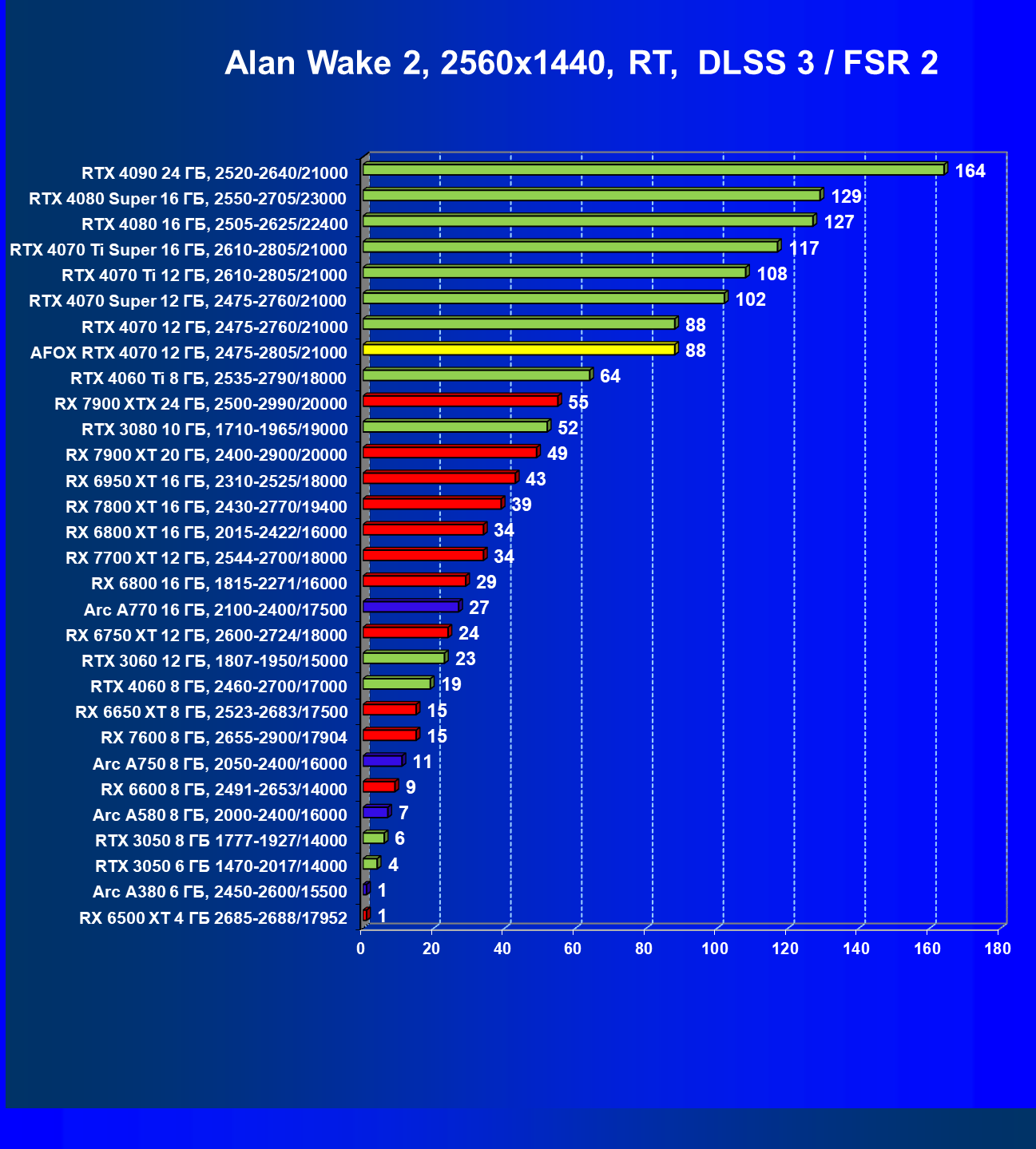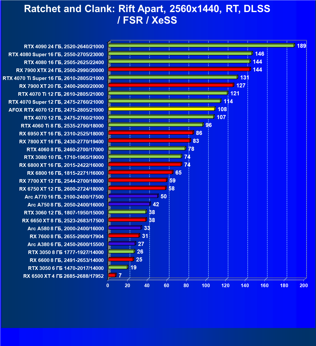 Более драматичное падение FPS от включения RT в играх, которое немного сгладило включение технологии масштабирования FSR, привело к тому, что GeForce RTX 4070 в целом и карта Afox в частности вышли на первые позиции в своей группе. А более дорогой GeForce RTX 3080 отстал из-за отсутствия поддержки DLSS 3, которой обладают карты семейства GeForce RTX 40 (в наших тестах уже есть несколько игр с поддержкой DLSS 3). Также очевидно, что и более дорогой ускоритель Radeon RX 7800 XT здесь сильно отстает от GeForce RTX 4070.