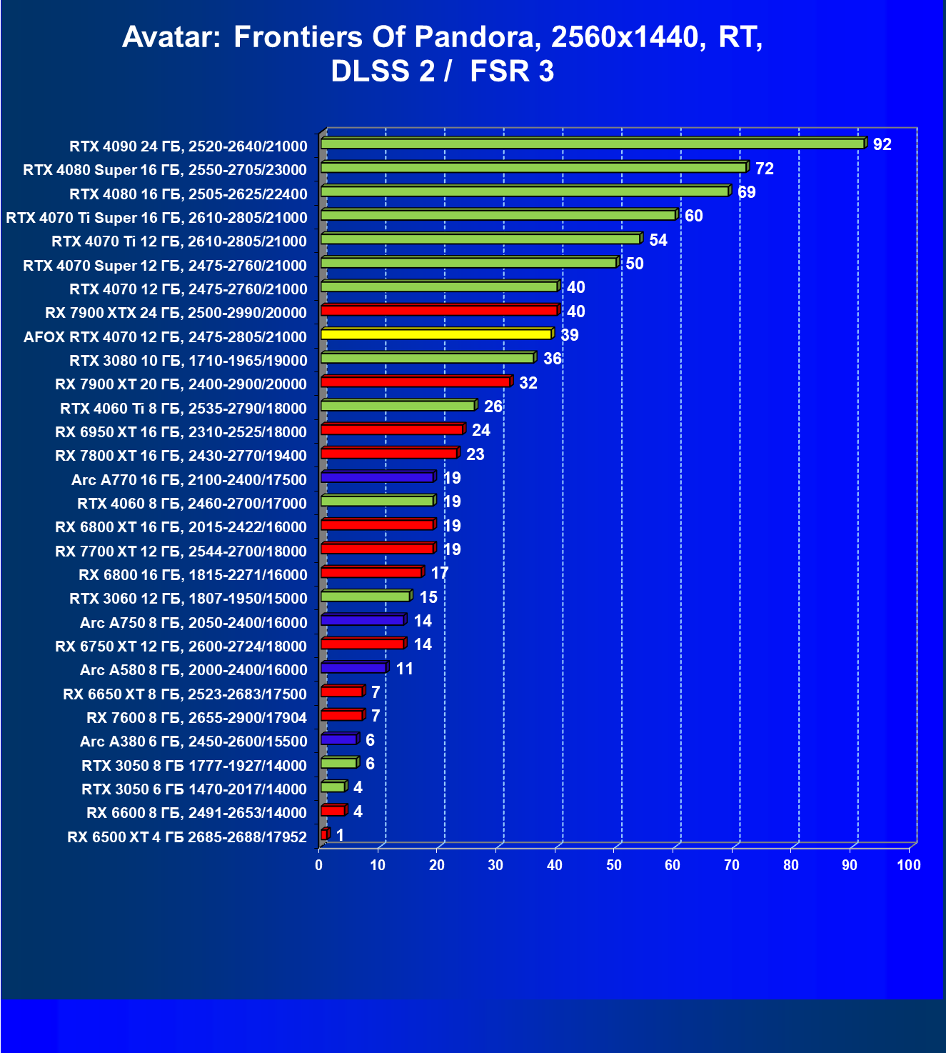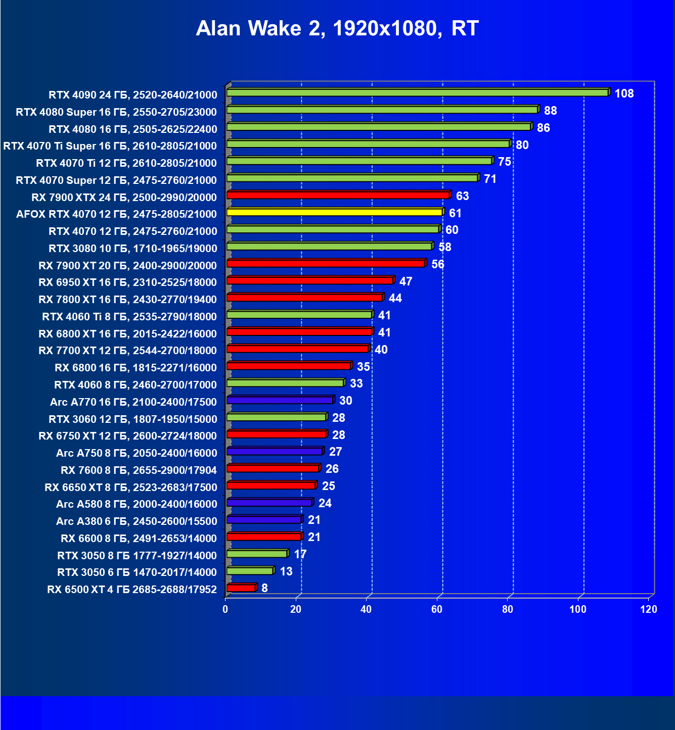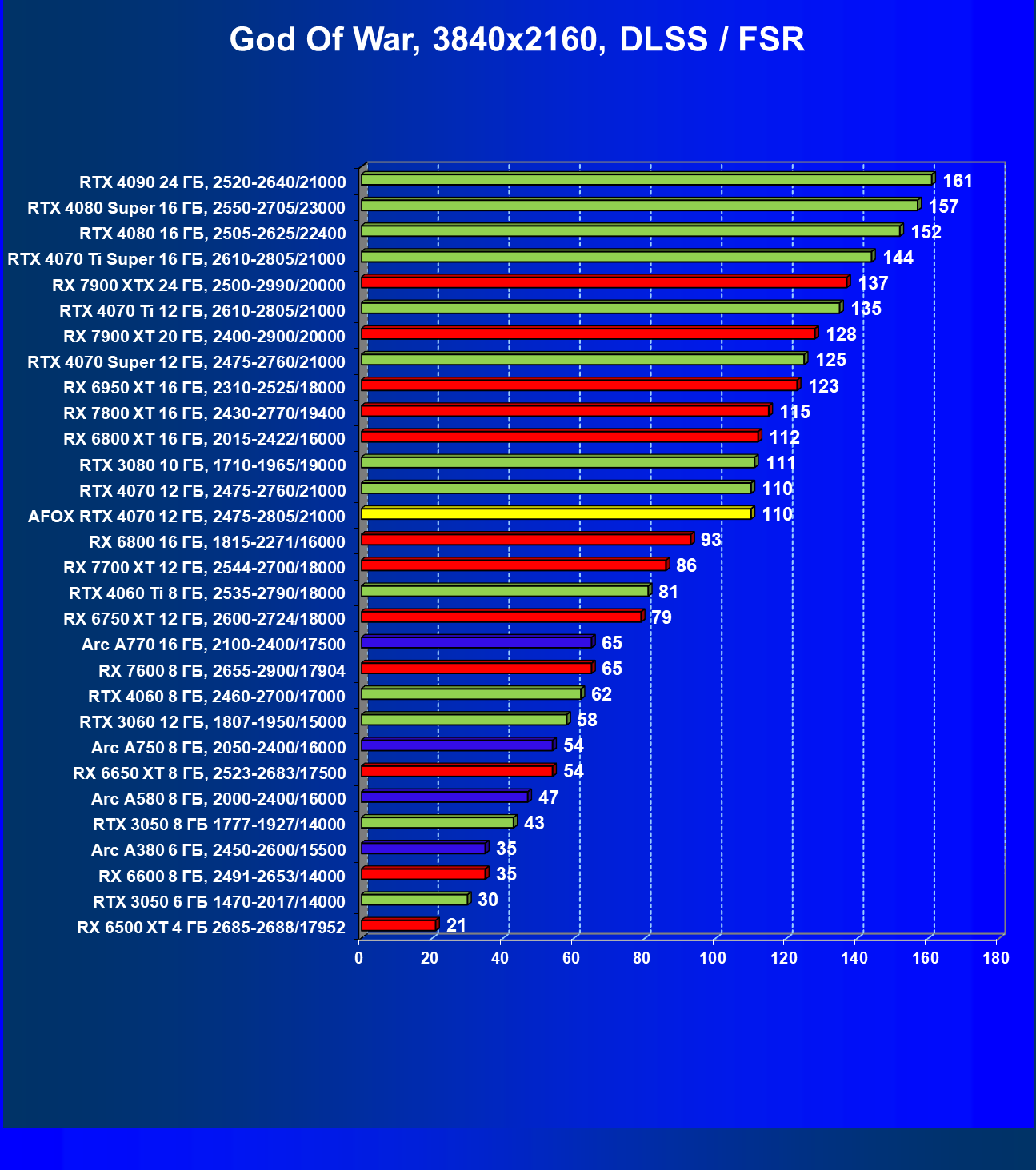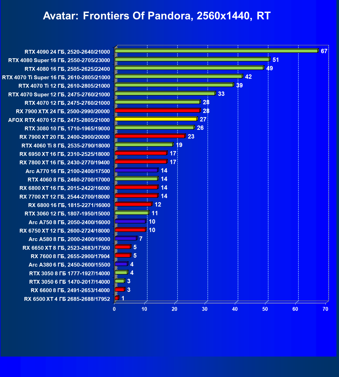 Более драматичное падение FPS от включения RT в играх, которое немного сгладило включение технологии масштабирования FSR, привело к тому, что GeForce RTX 4070 в целом и карта Afox в частности вышли на первые позиции в своей группе. А более дорогой GeForce RTX 3080 отстал из-за отсутствия поддержки DLSS 3, которой обладают карты семейства GeForce RTX 40 (в наших тестах уже есть несколько игр с поддержкой DLSS 3). Также очевидно, что и более дорогой ускоритель Radeon RX 7800 XT здесь сильно отстает от GeForce RTX 4070.