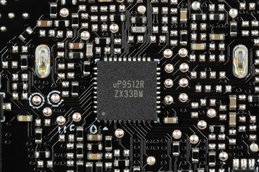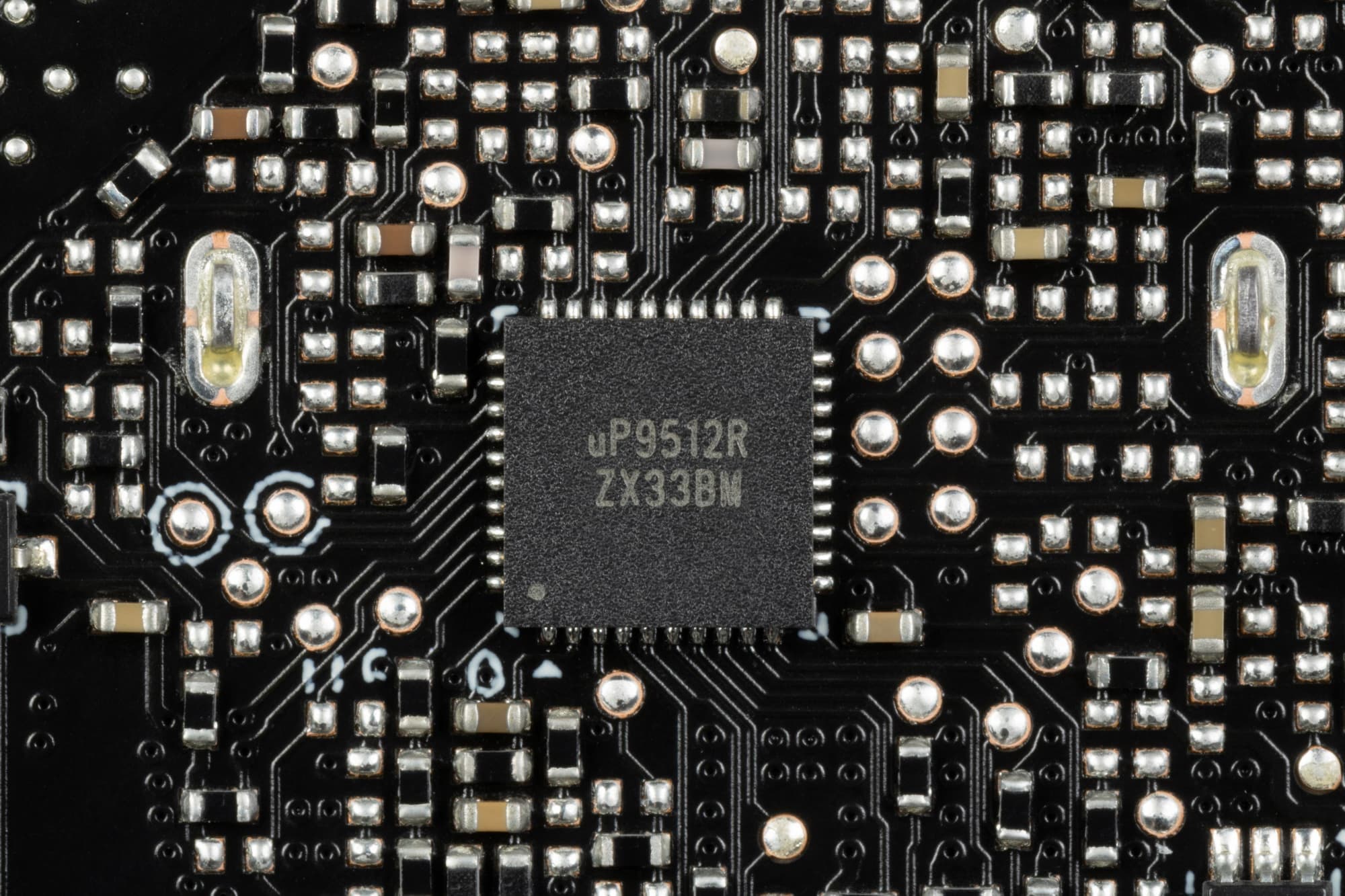 8 фазами питания ядра управляет ШИМ-контроллер uP9512R (uPI Semiconductor) расположенный на оборотной стороне PCB. Он рассчитан максимум на 12 фаз.