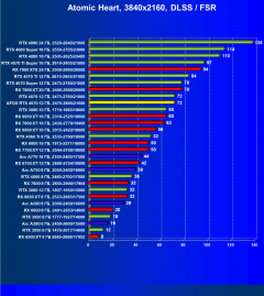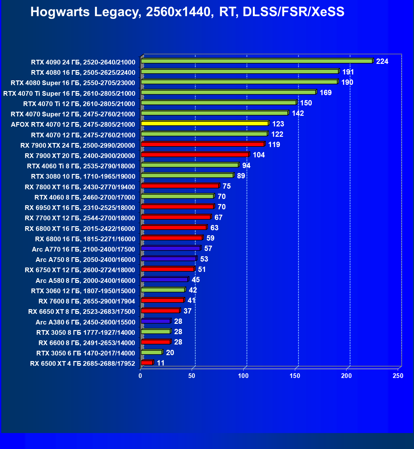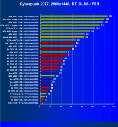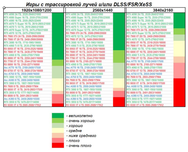 - Результаты тестов со включенной аппаратной трассировкой лучей и/или DLSS/FSR/XeSS в разрешениях 1920×1080, 2560×1440 и 3840×2160