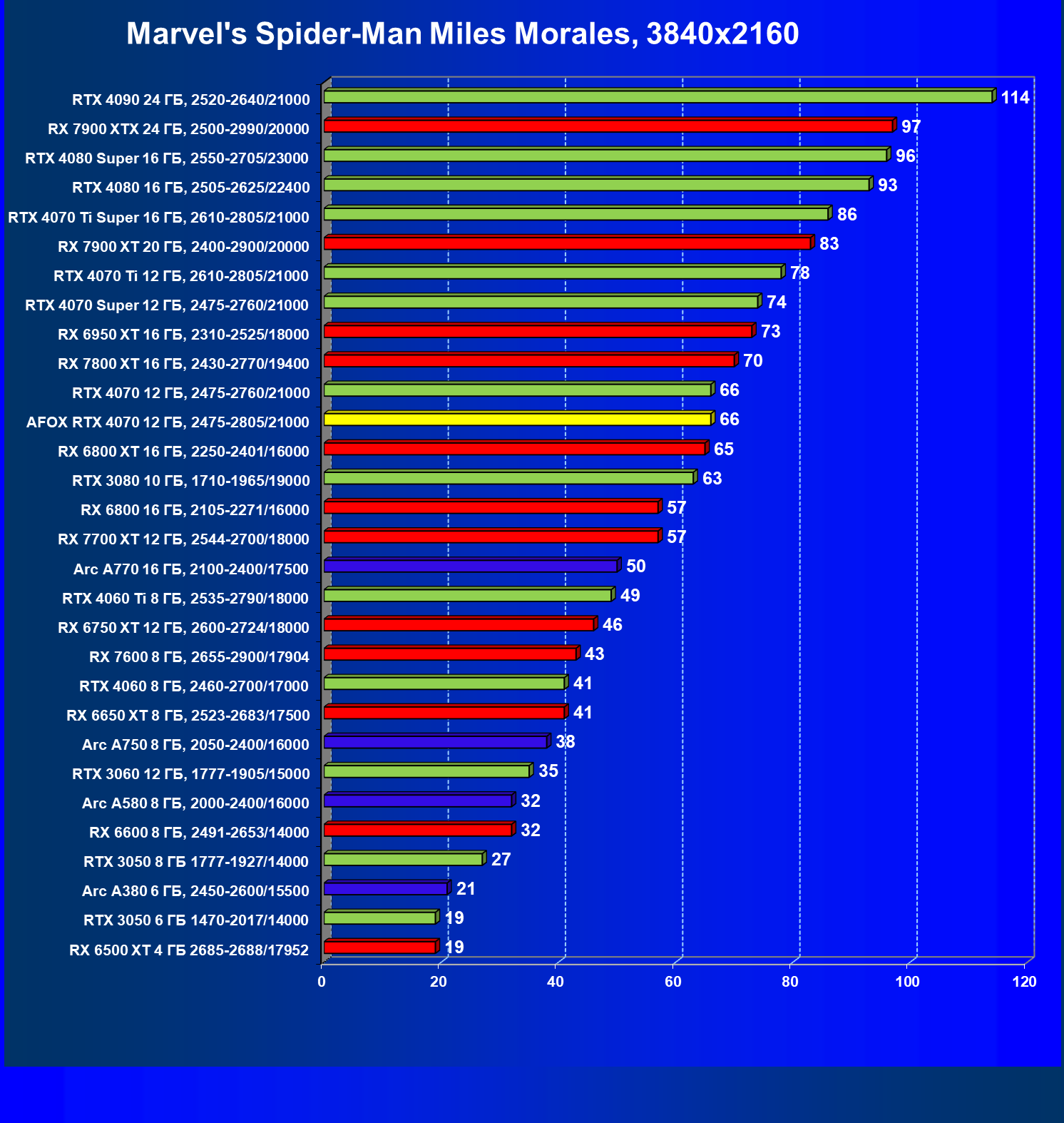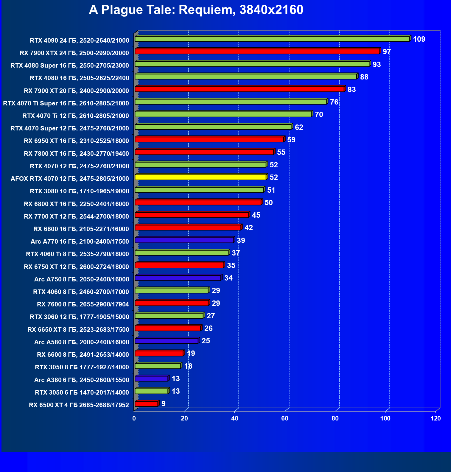 | 16 | RX 7700 XT 12 ГБ, 2544—2700/18000 | 502 | 97 | 52 000 |