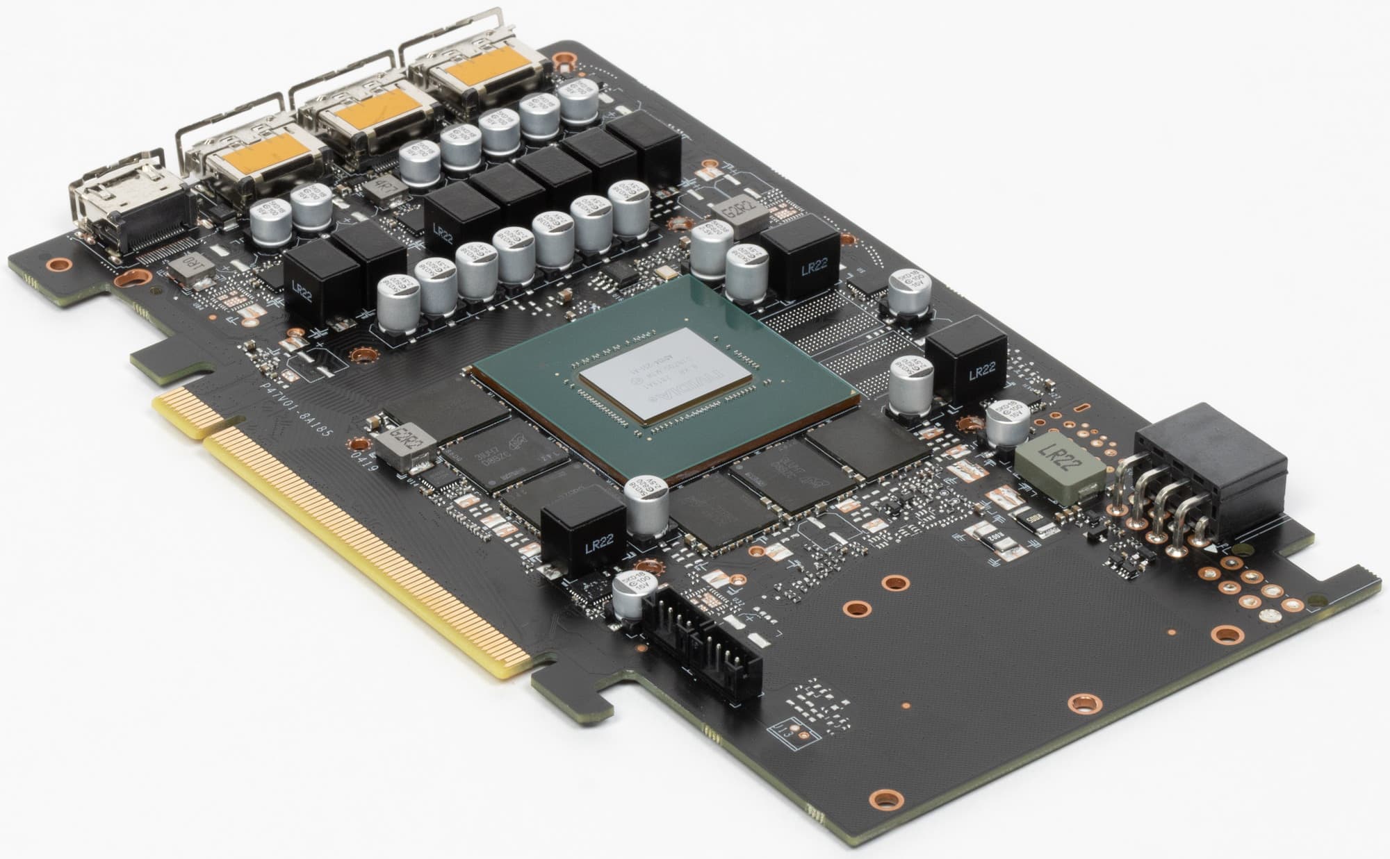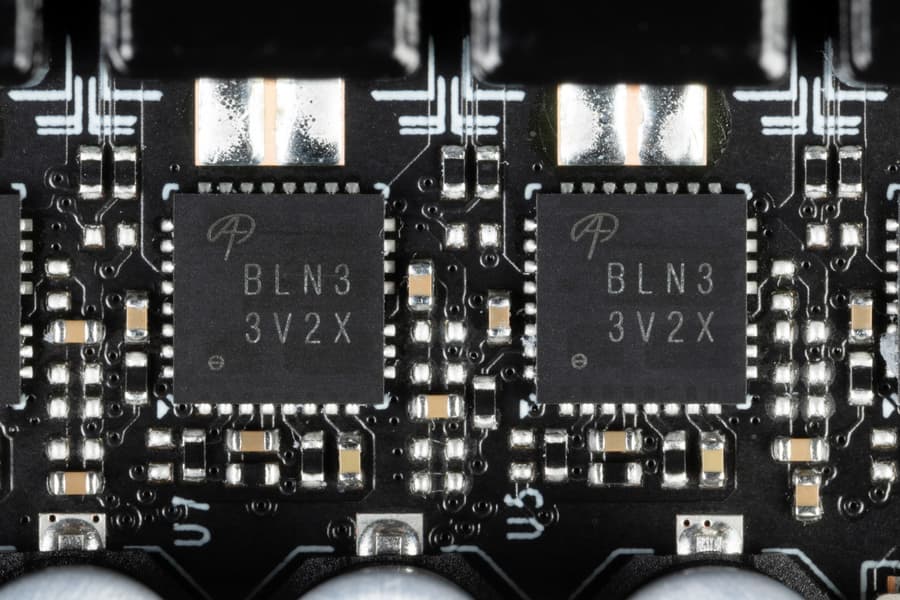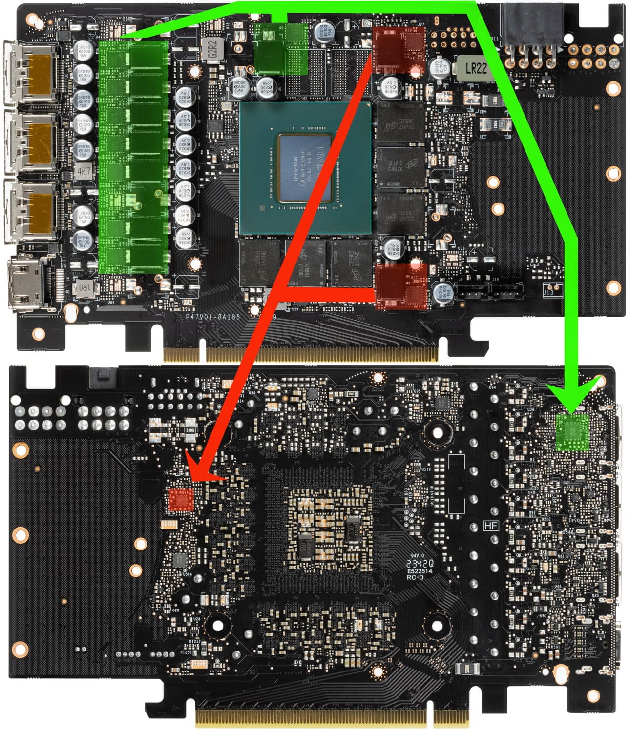 В преобразователе питания, традиционно для всех видеокарт Nvidia, используются транзисторные сборки DrMOS — в данном случае AOZ5311NGI (Alpha&Omega Semi), каждая из которых рассчитана максимально на 55 А.