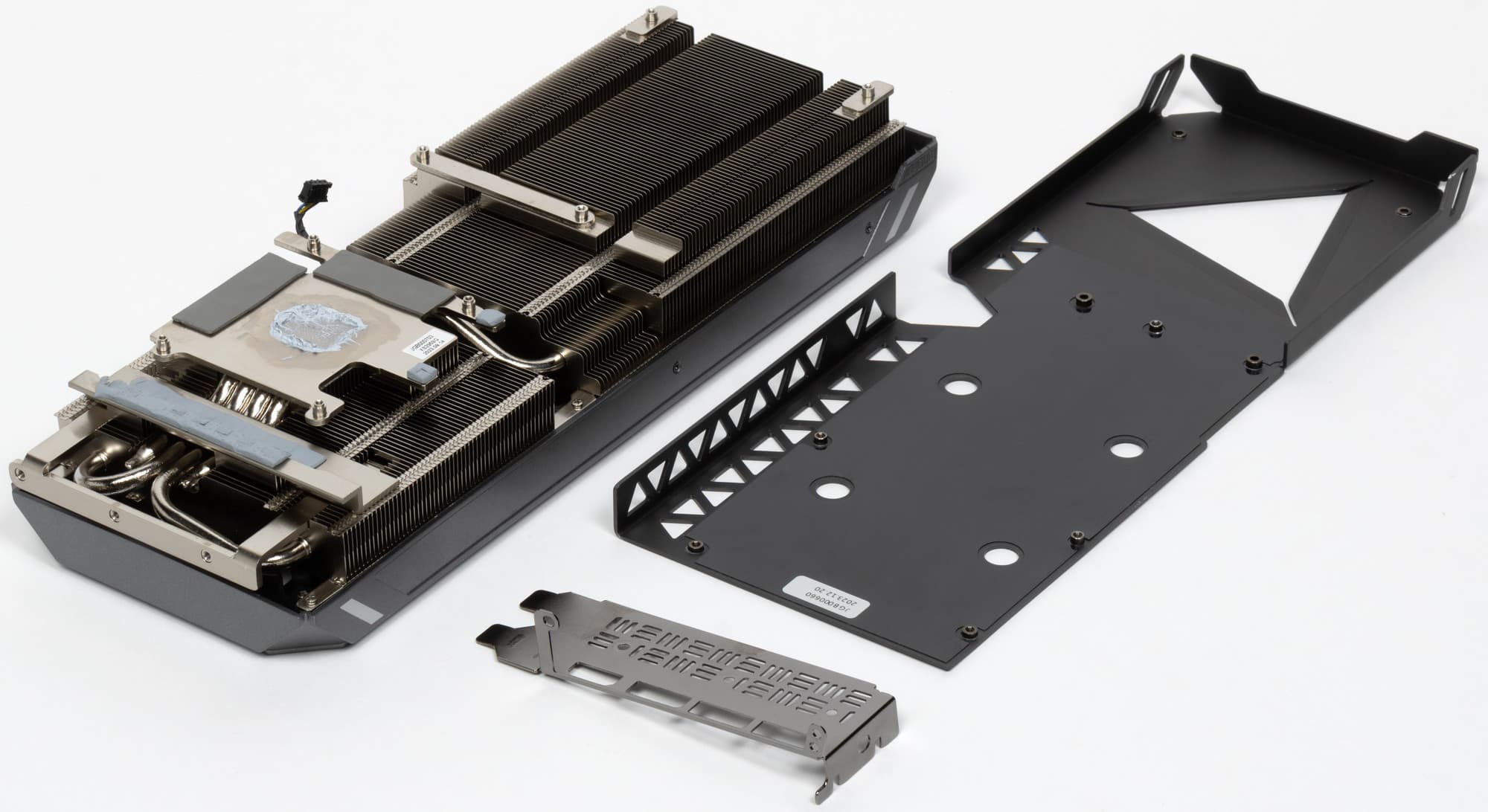 Микросхемы памяти и силовые преобразователи VRM памяти охлаждаются с помощью этого же огромного теплосъемника и термопрокладок. Для охлаждения преобразователей питания VRM ядра имеется отдельная подошва на том же радиаторе.