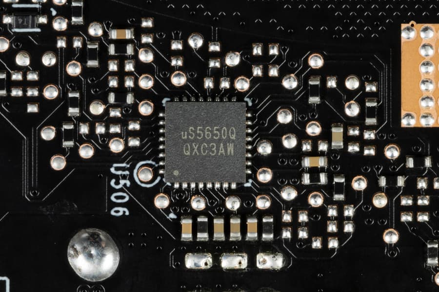 На тыльной стороне платы имеется контроллер uS5650Q (uSI Semiconductor), который отвечает за мониторинг карты (отслеживание напряжений и температуры).