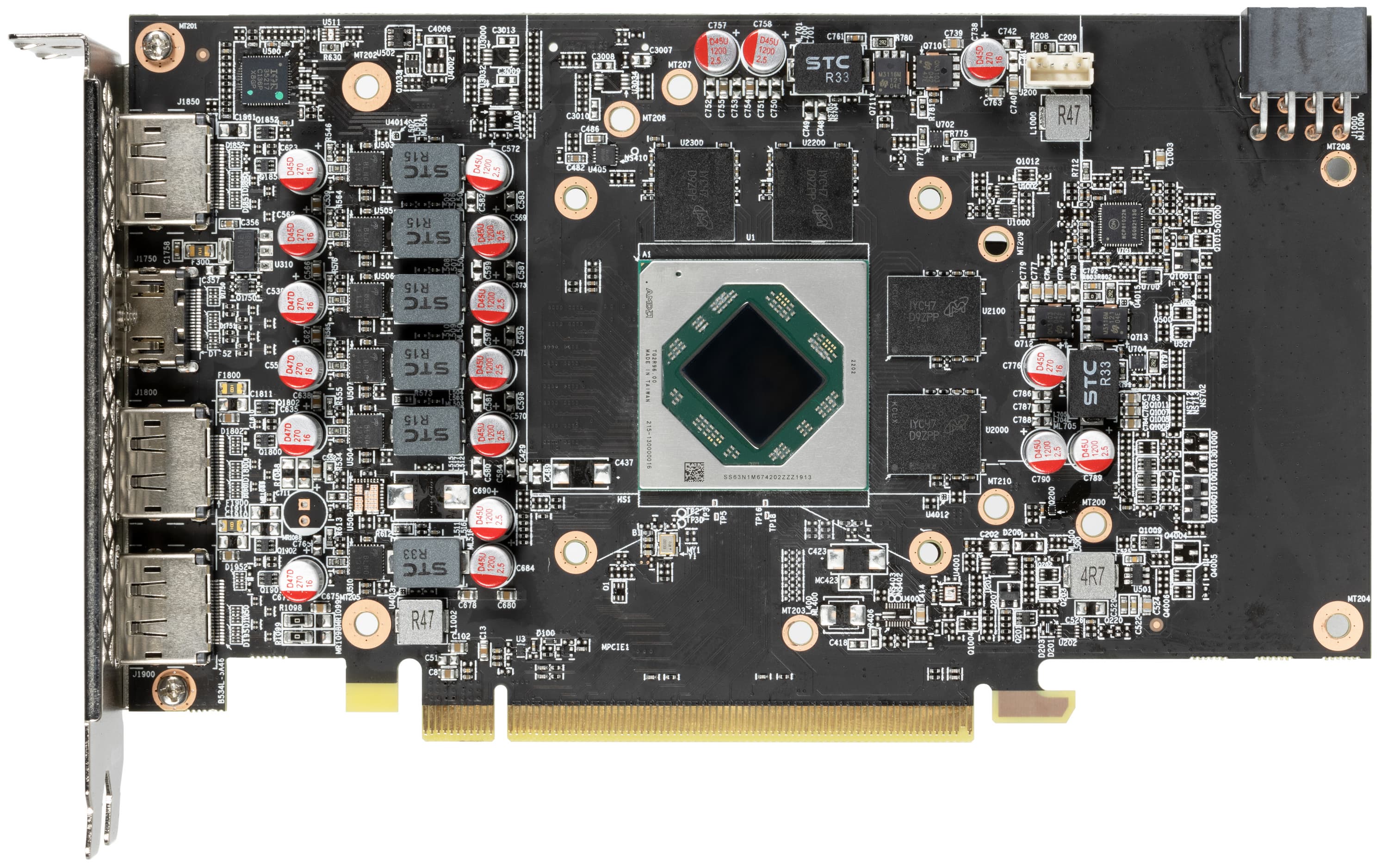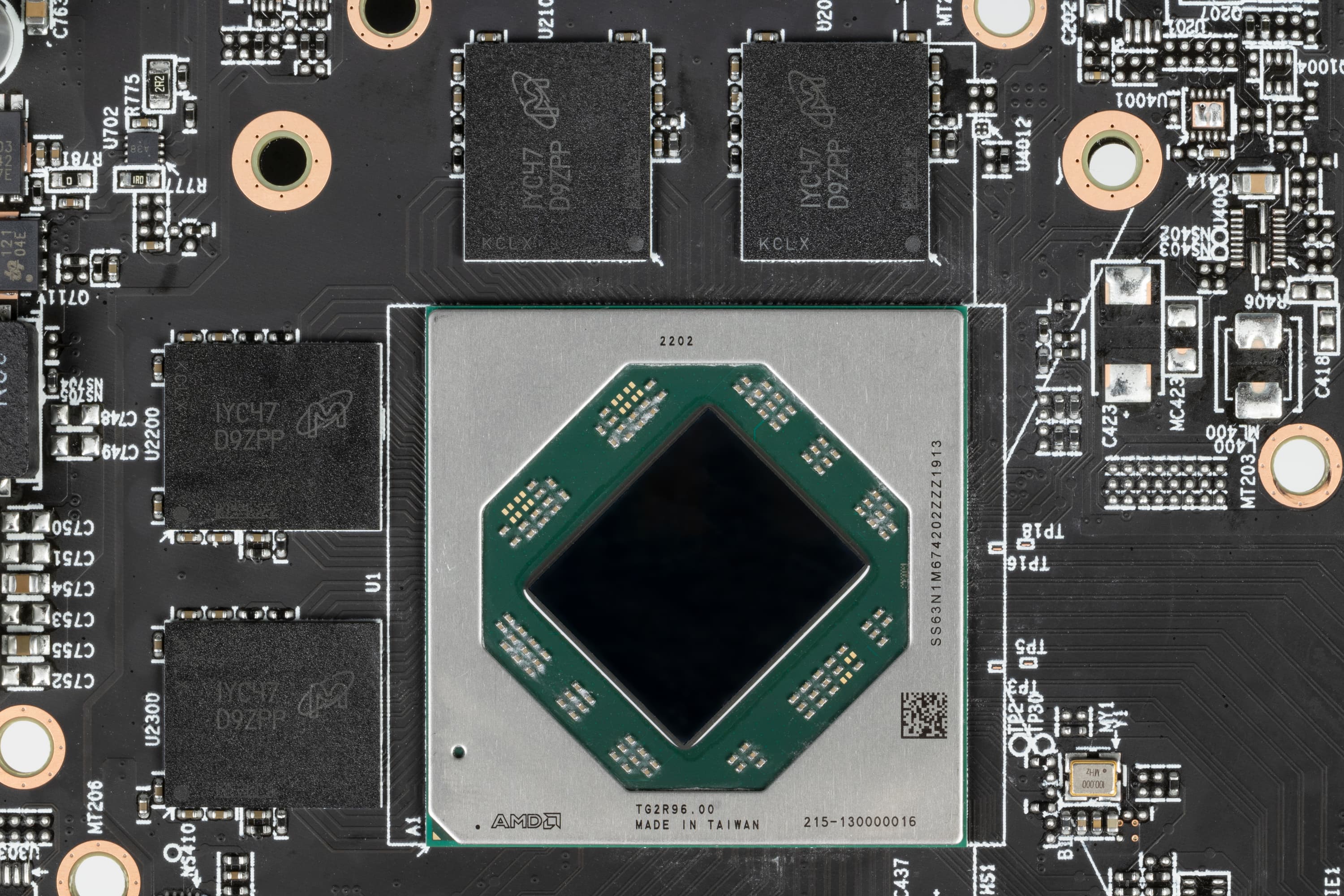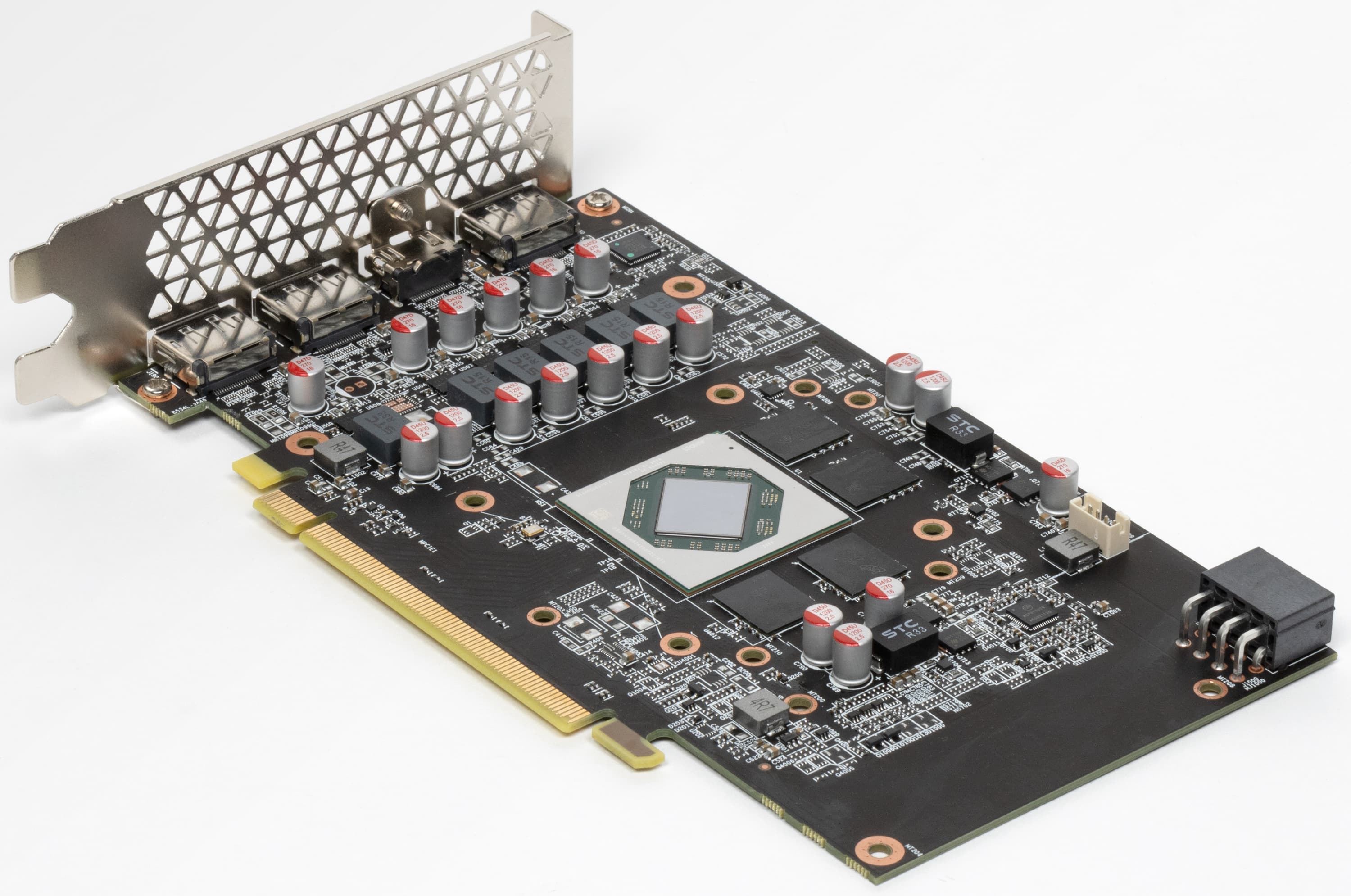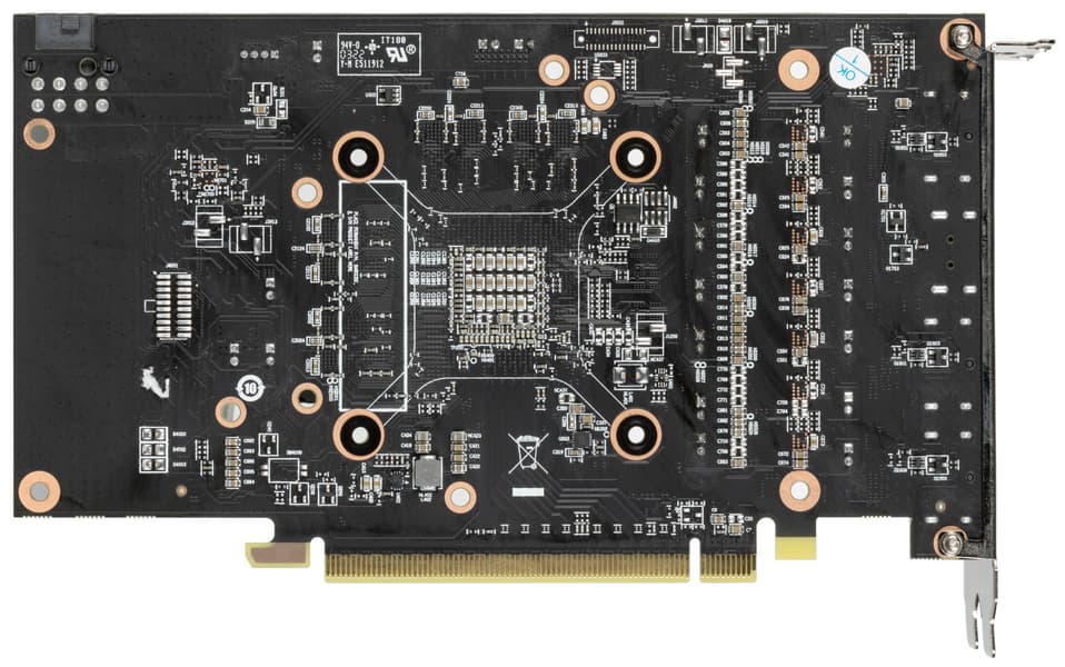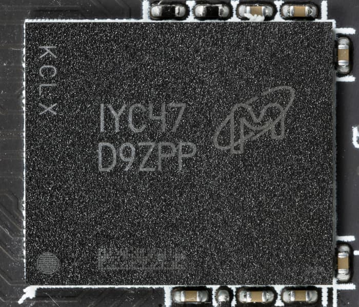 Карта имеет 8 ГБ памяти GDDR6 SDRAM. Микросхемы памяти Micron (GDDR6) размещены в 4 микросхемах по 16 Гбит на лицевой стороне PCB и рассчитаны на условную номинальную частоту работы в 3500 (14000) МГц.