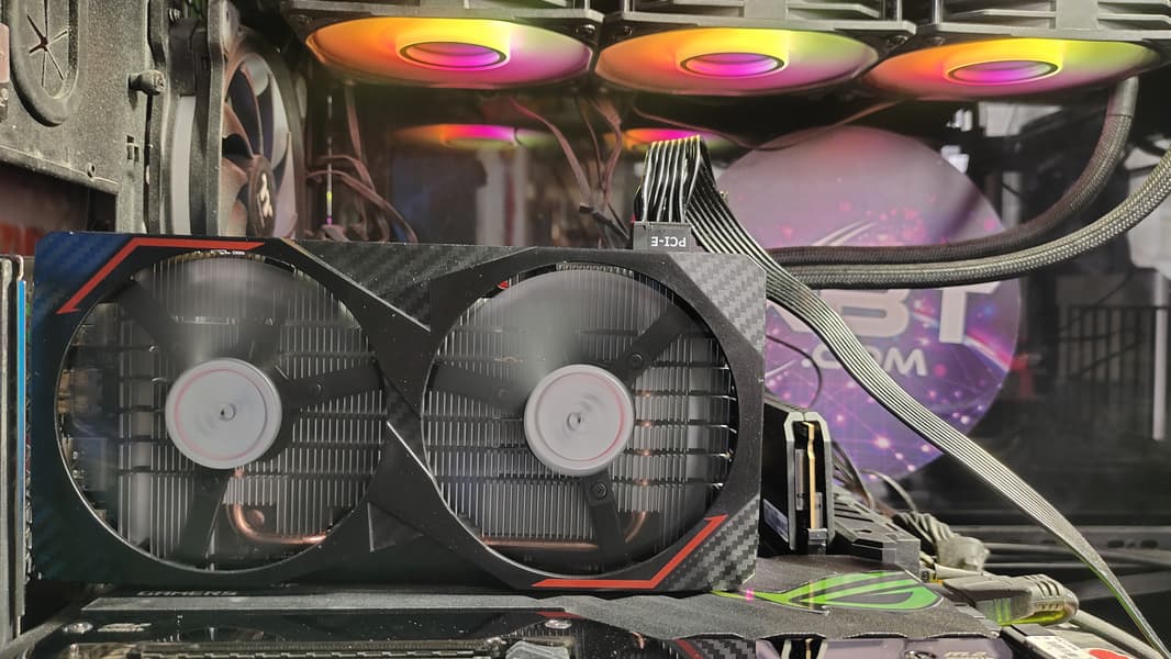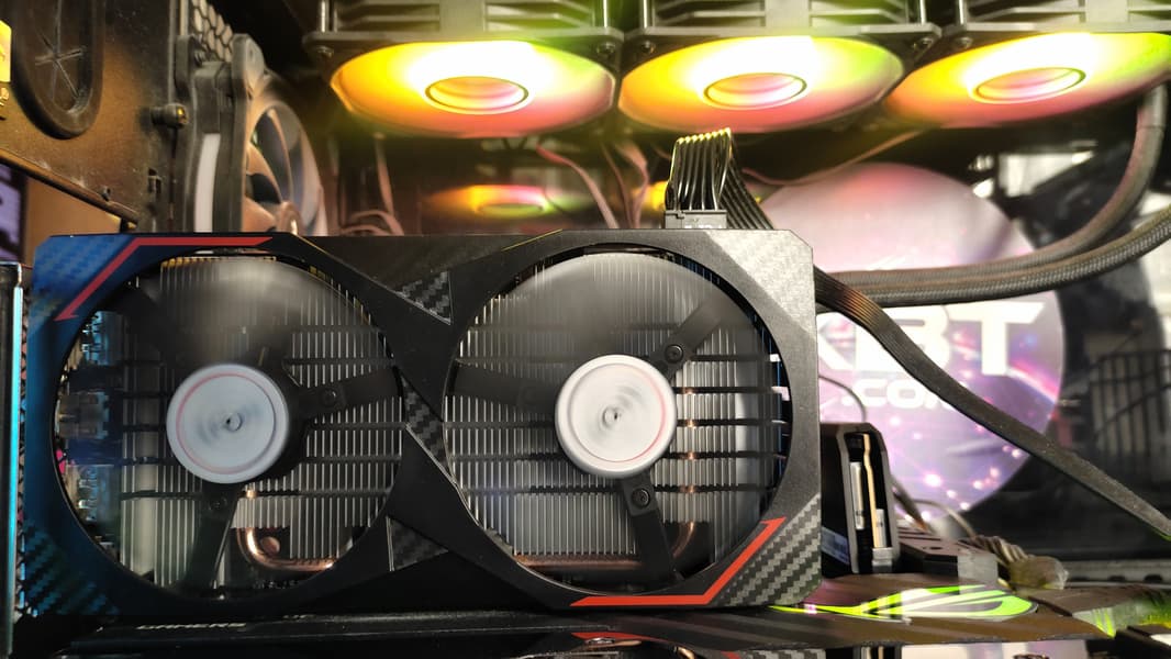 На обороте карты установлена толстая пластиковая пластина, служащая только элементом жесткости, а на лицевой — 2 добротных вентилятора диаметром 85 мм. Оба вращаются в одном направлении.