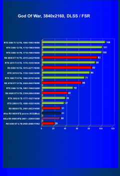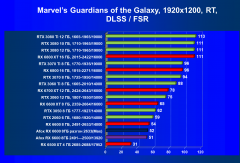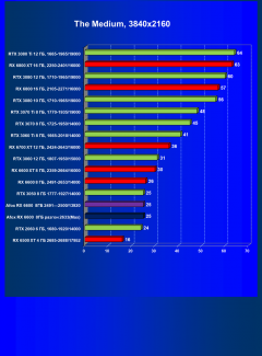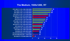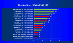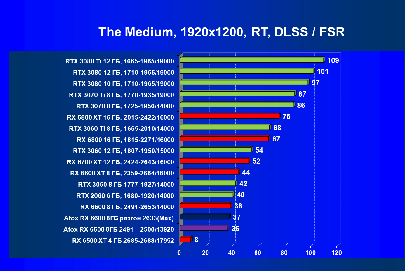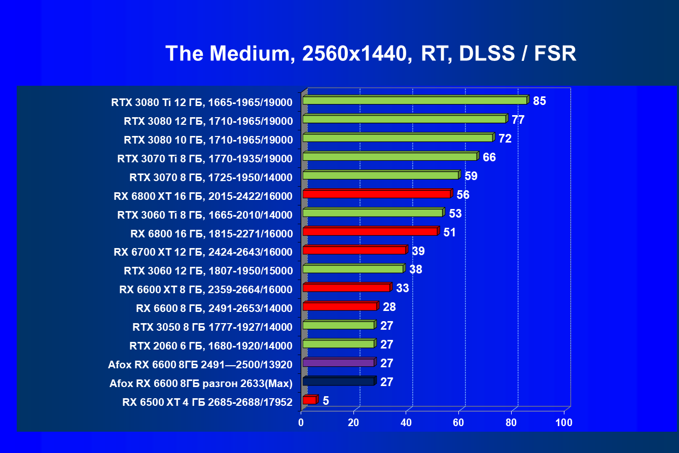 Рейтинг составлен по 9 тестам с применением технологии трассировки лучей (с Nvidia DLSS и с AMD FSR в играх God of War, The Medium и Far Cry 6). Этот рейтинг нормирован по самому слабому ускорителю в данной группе — Radeon RX 6500 XT (то есть сочетание скорости и функций Radeon RX 6500 XT приняты за 100%).