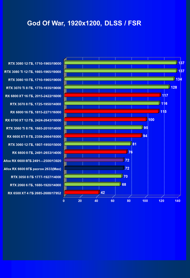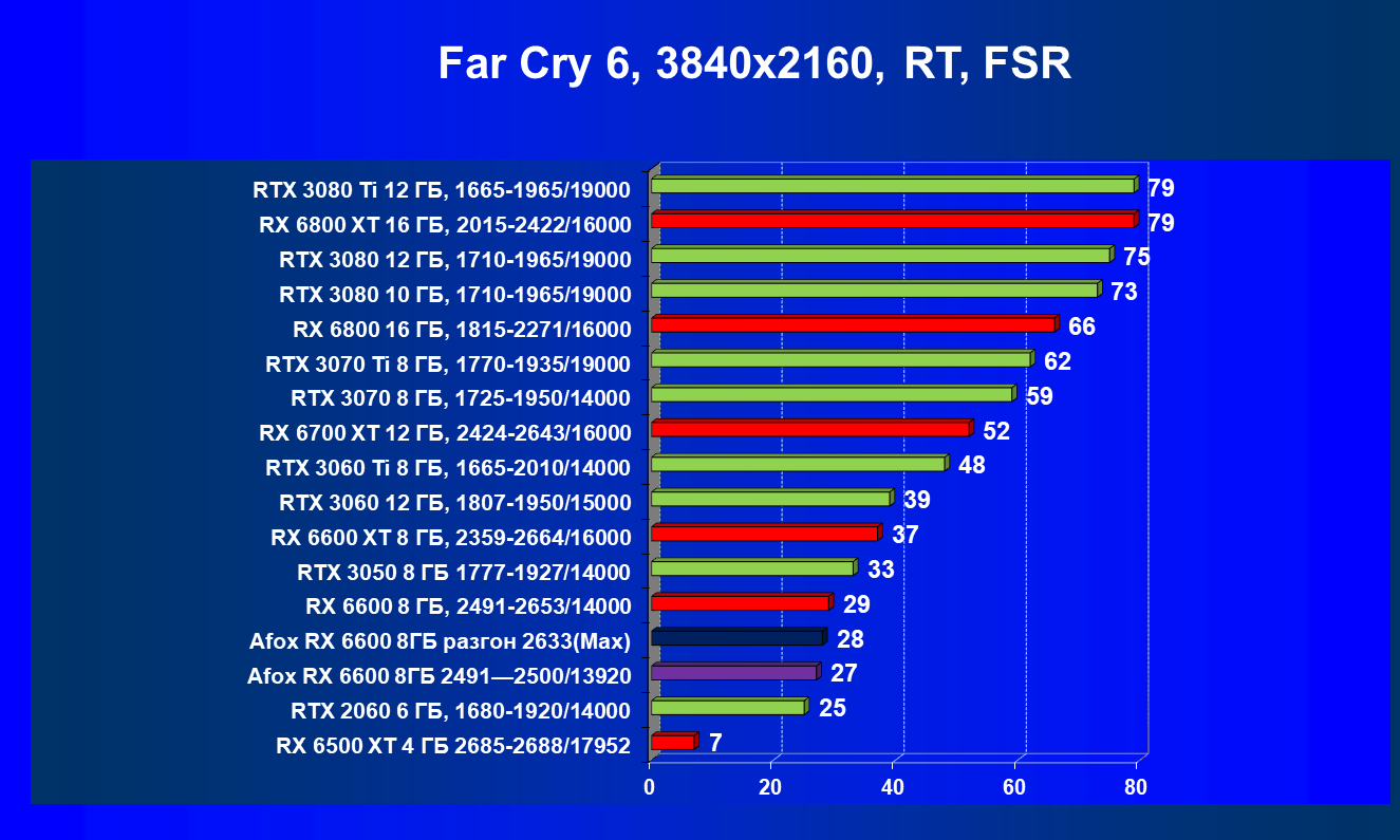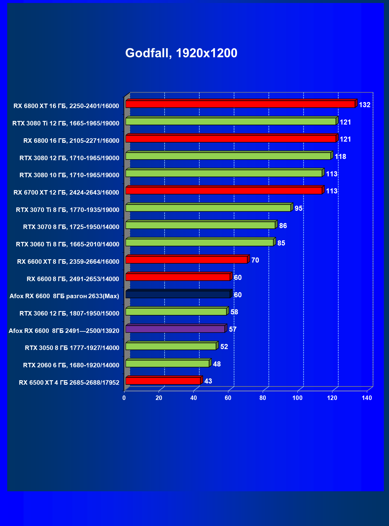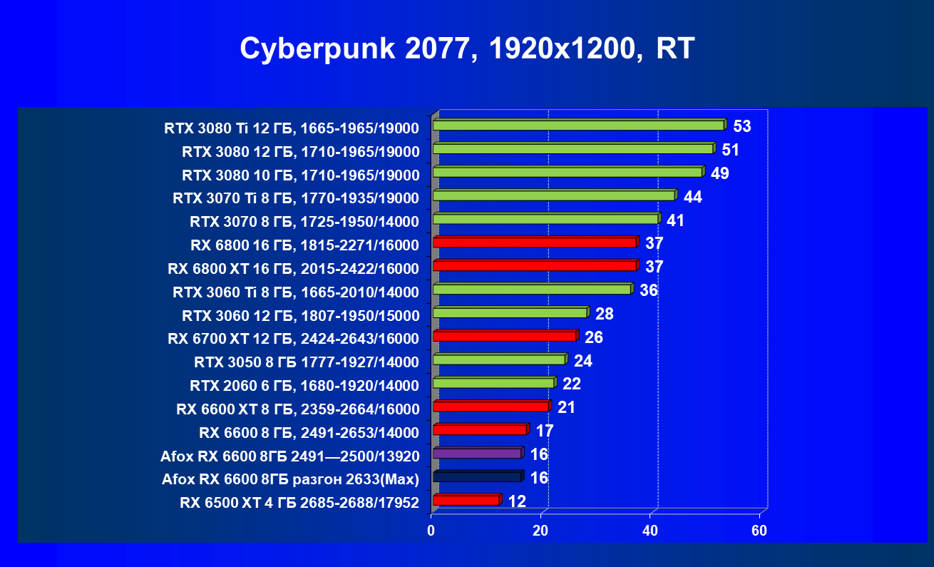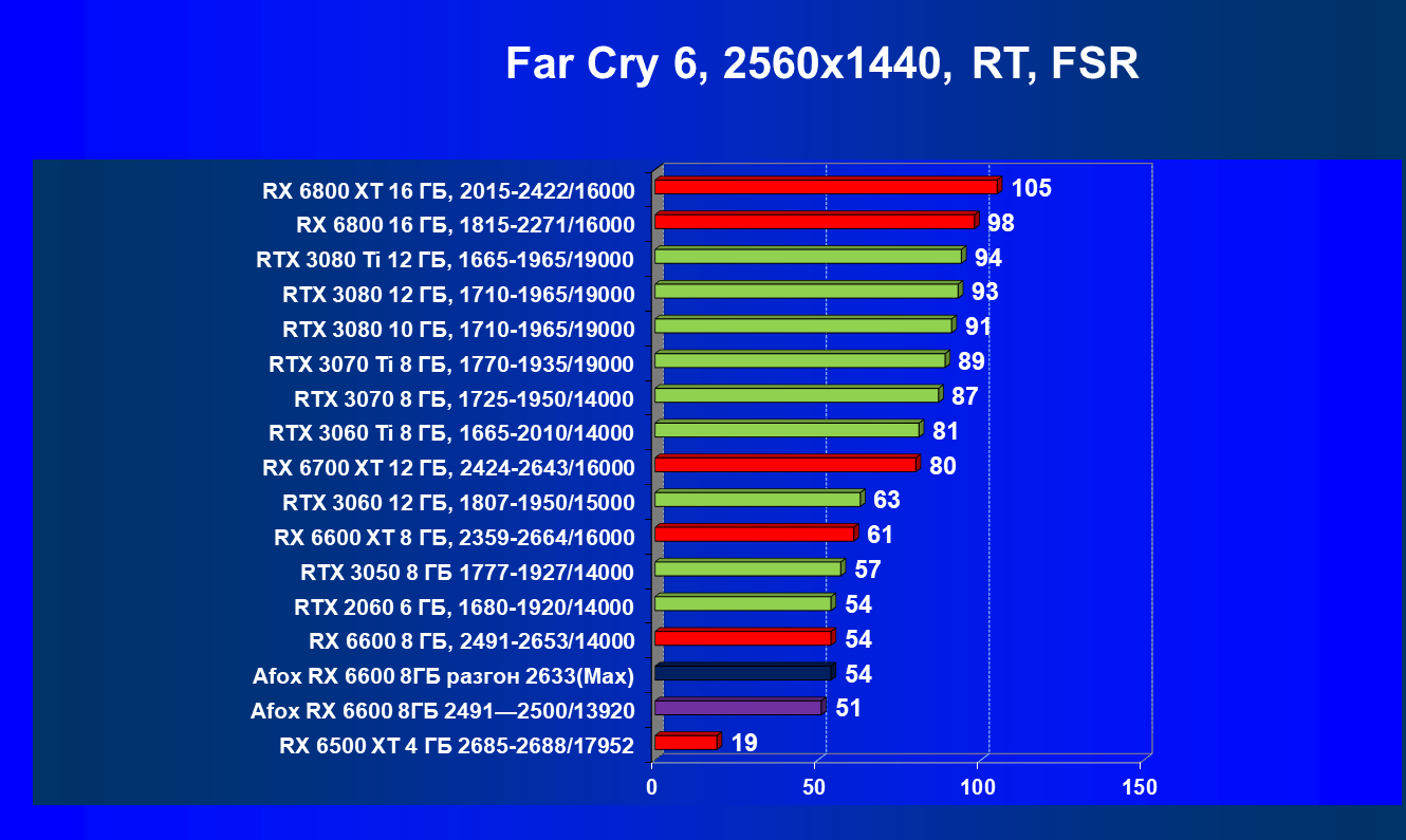 | 12 | Afox RX 6600 8 ГБ, разгон до 2633/14400 | 180 | 55 | 33 000 |