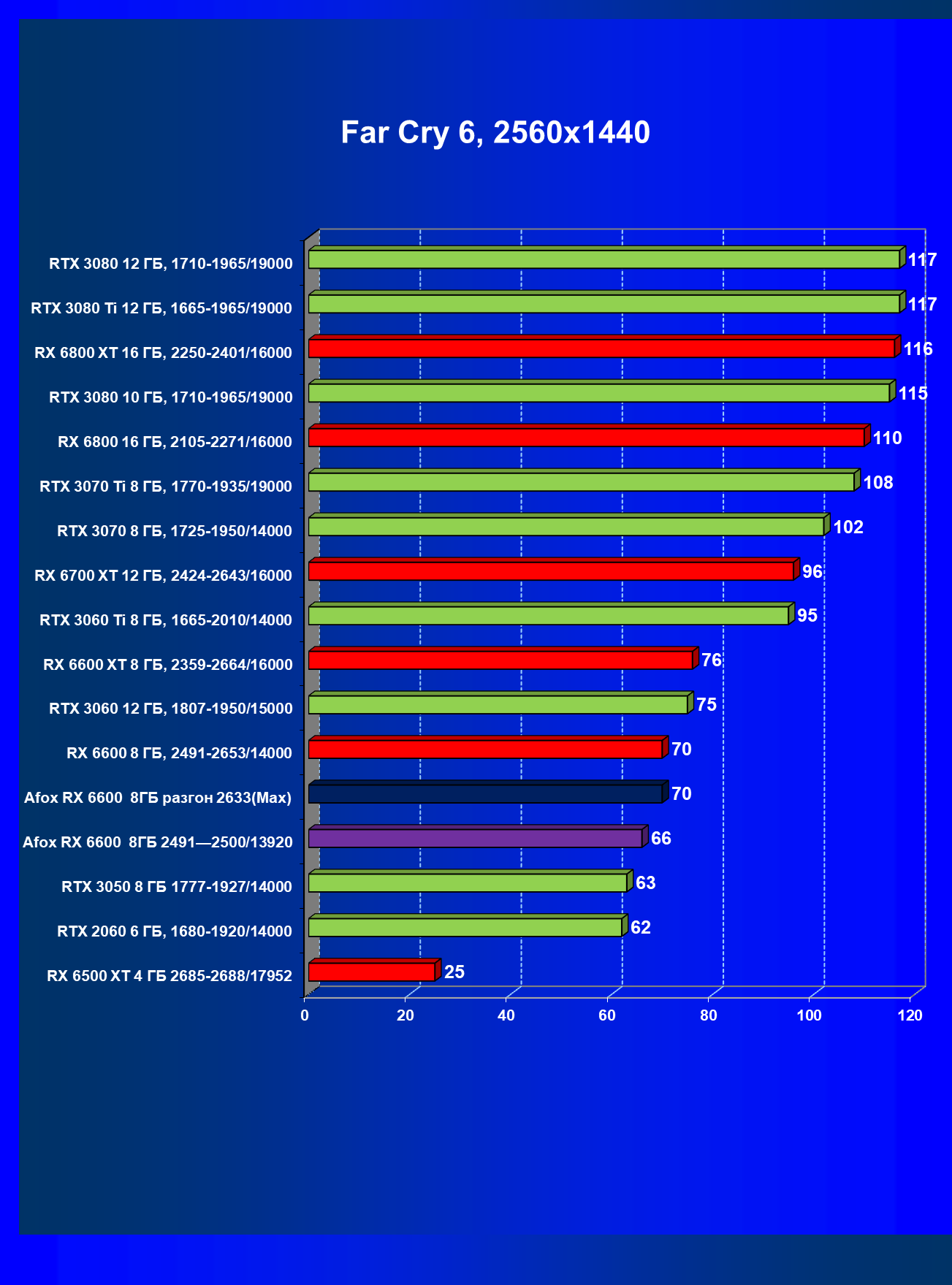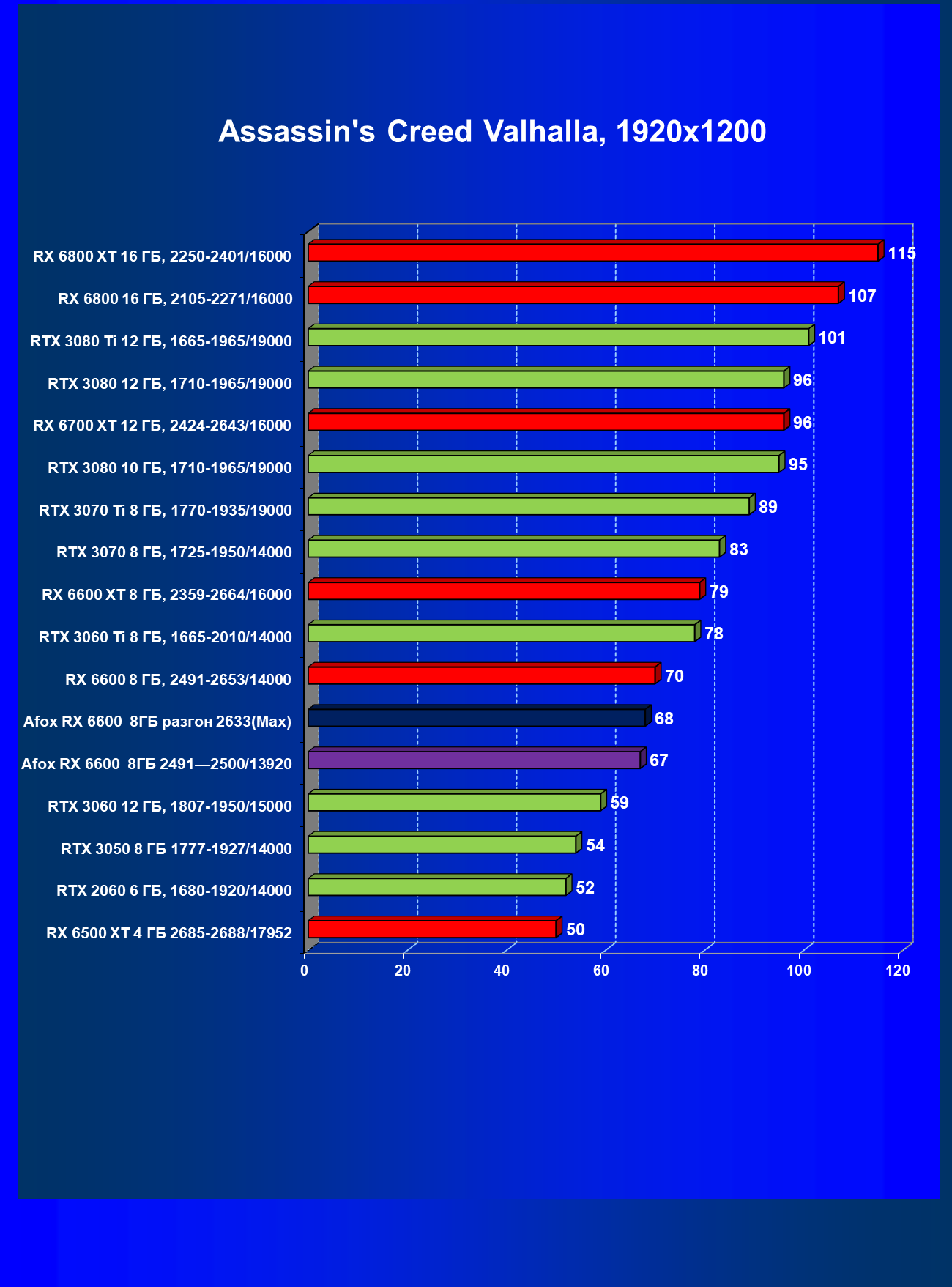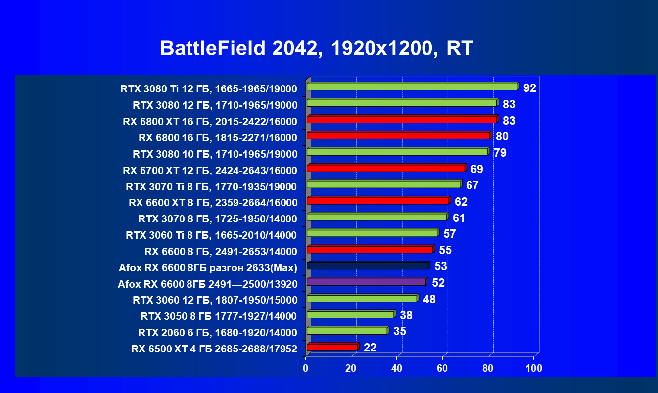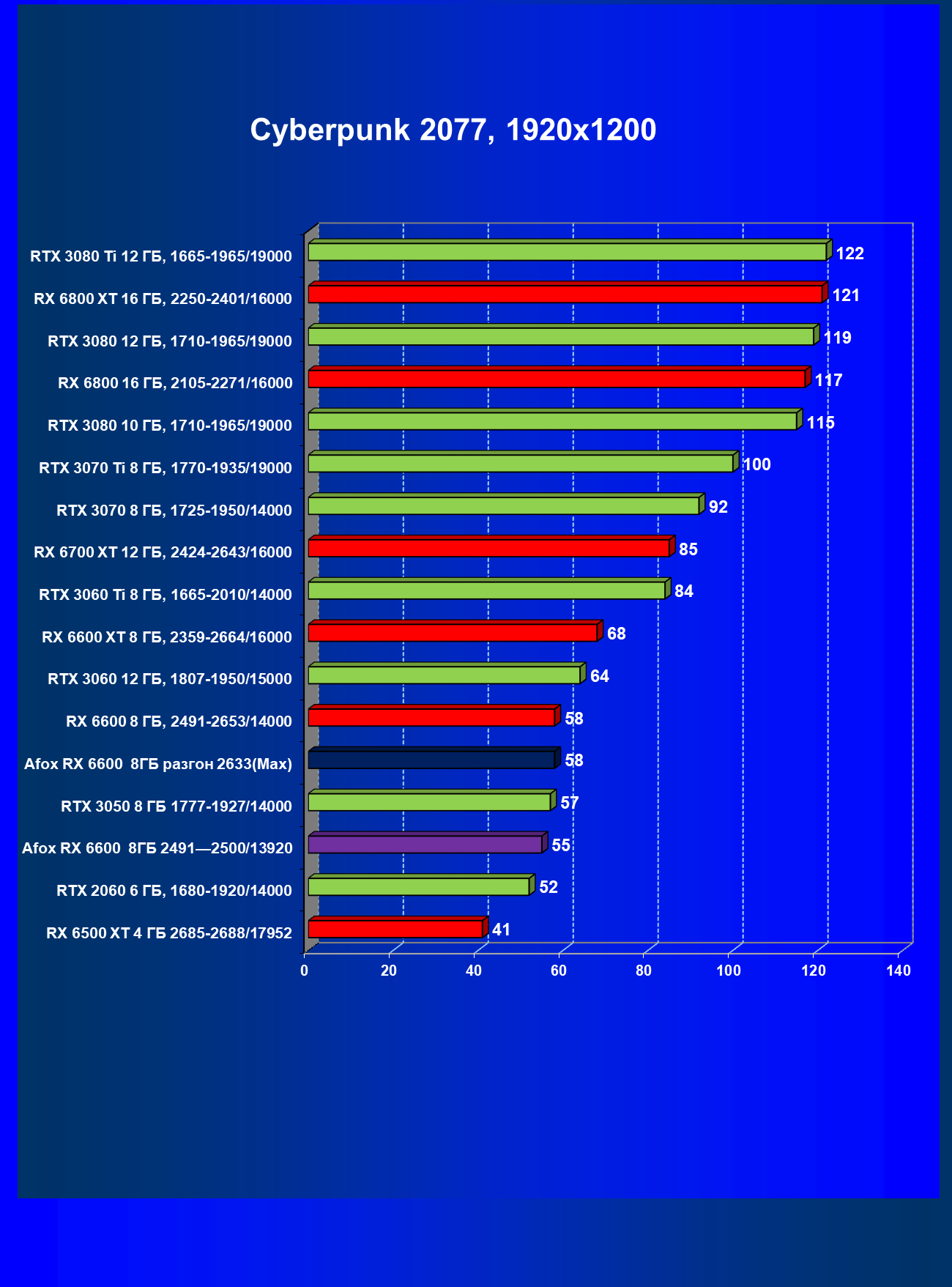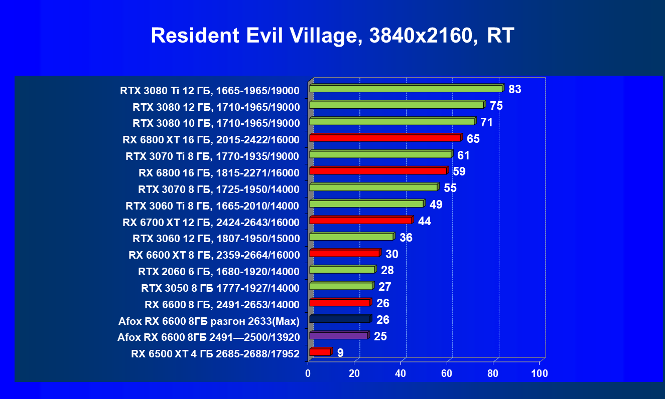 | 12 | Afox RX 6600 8 ГБ, разгон до 2633/14400 | 180 | 55 | 33 000 |