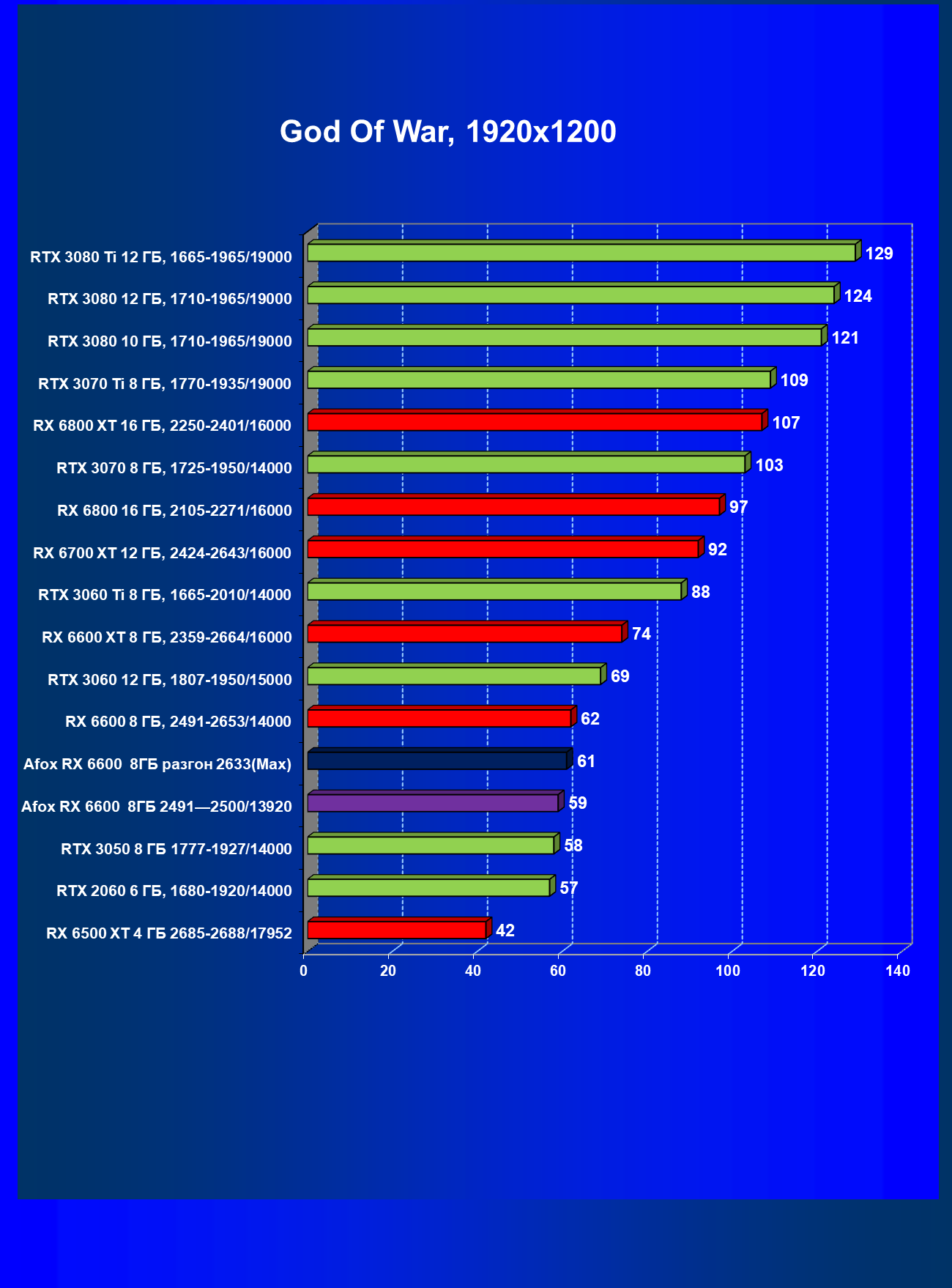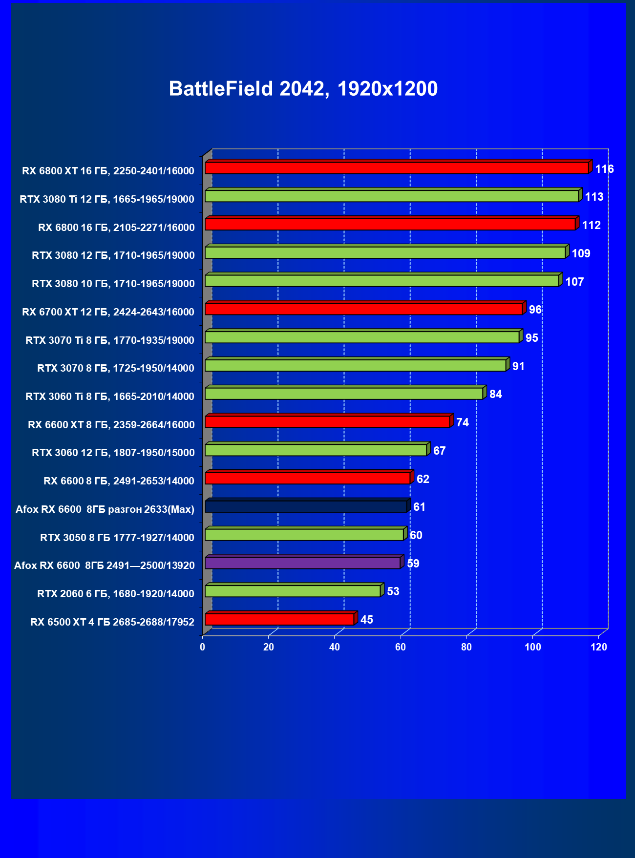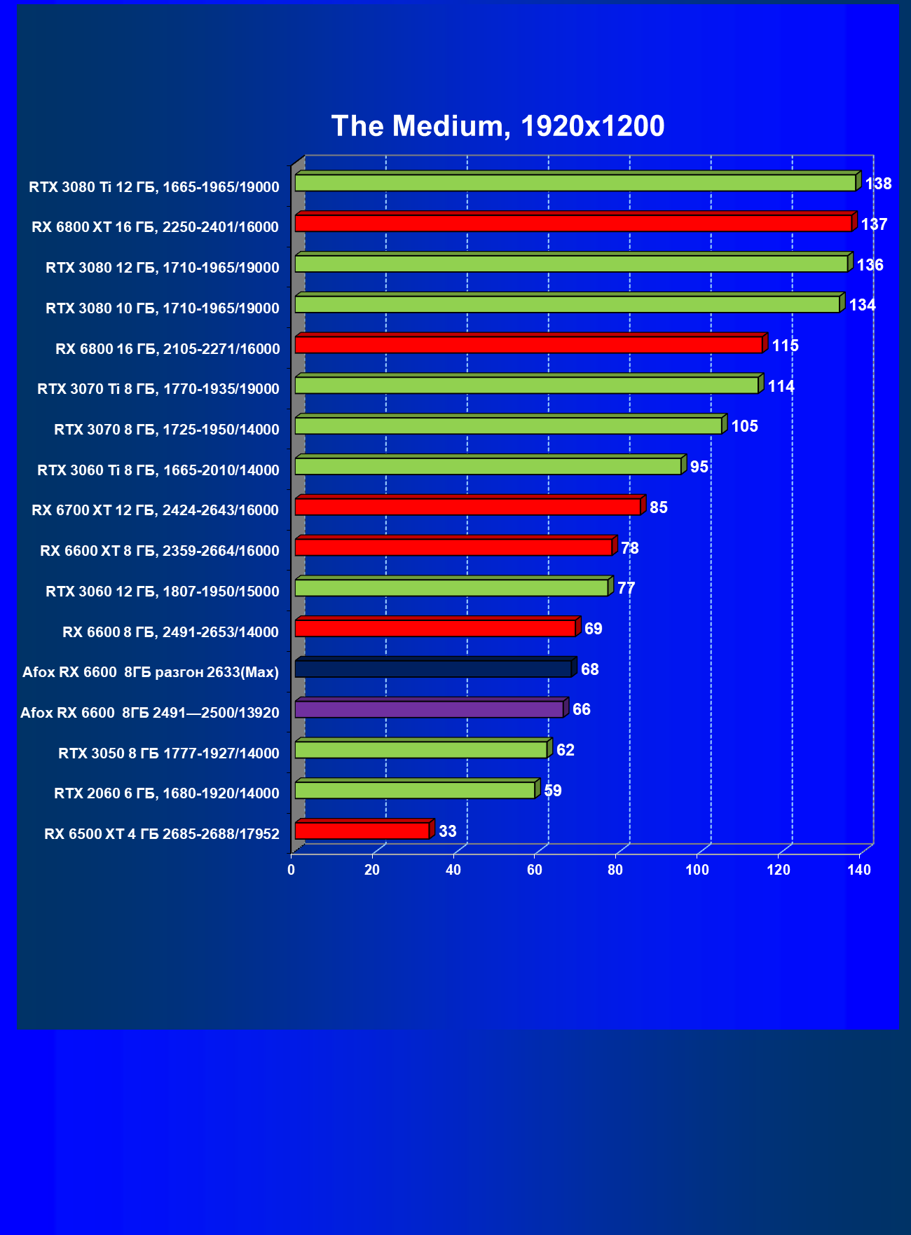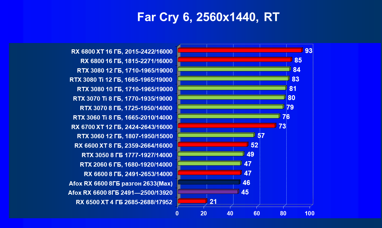 | 12 | Afox RX 6600 8 ГБ, разгон до 2633/14400 | 180 | 55 | 33 000 |