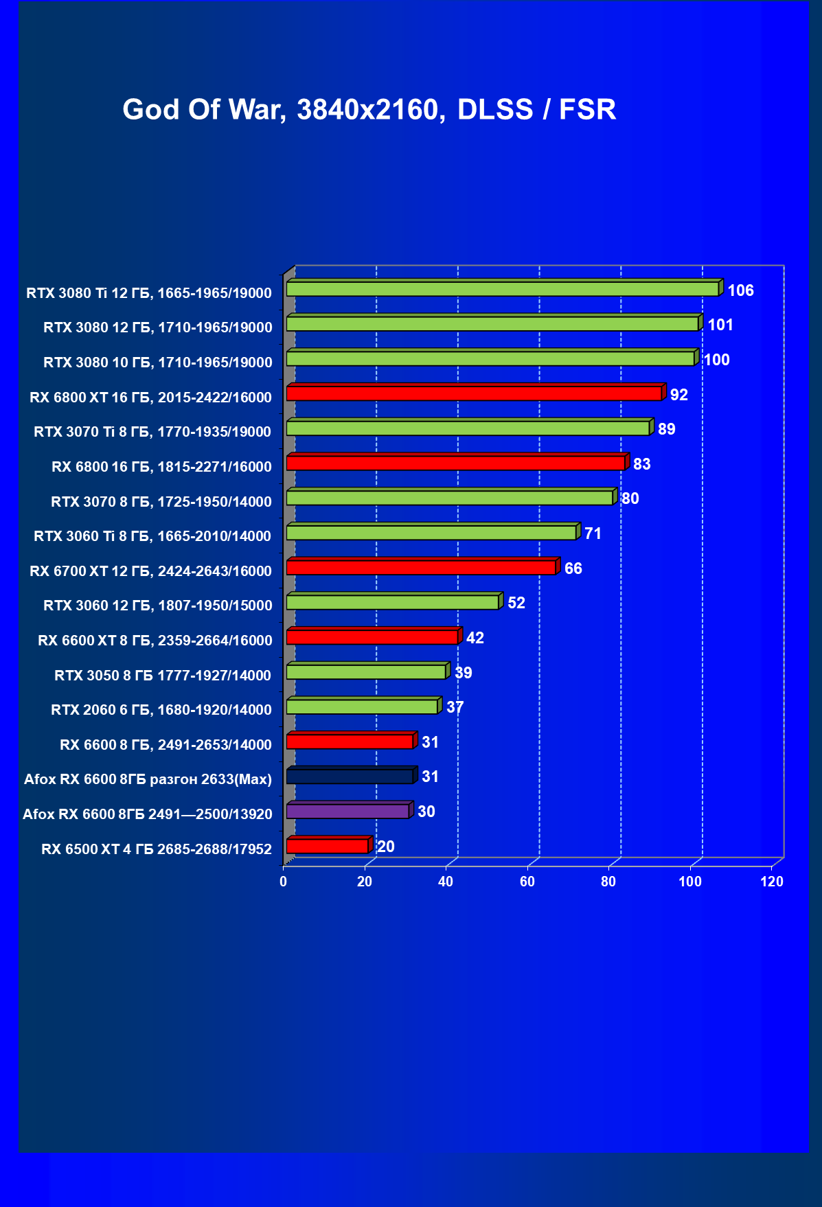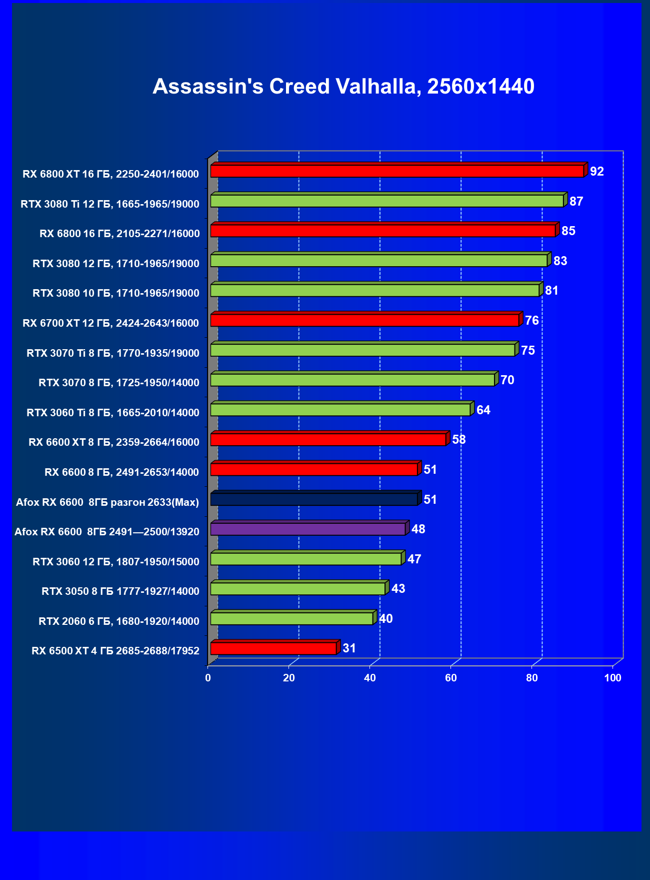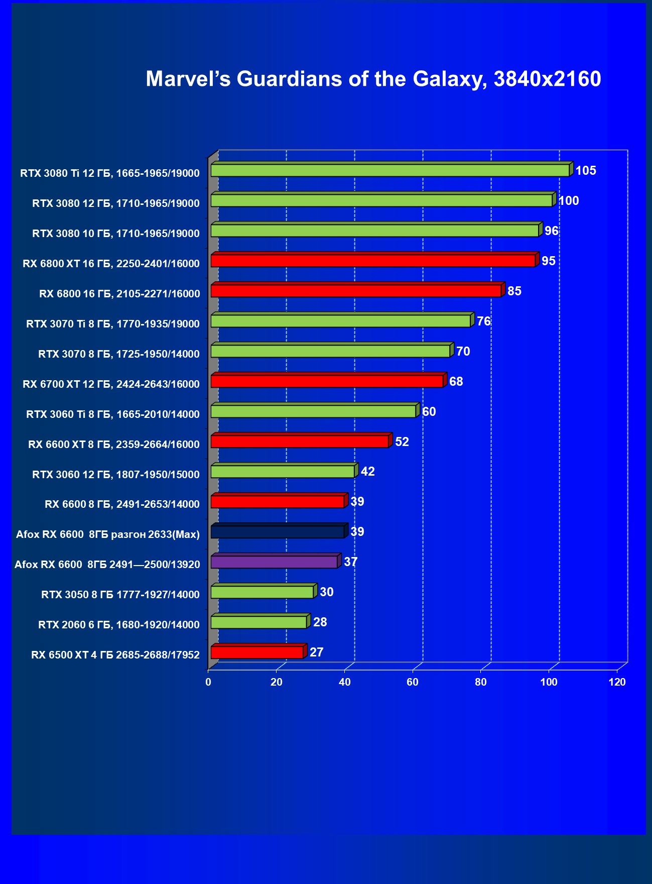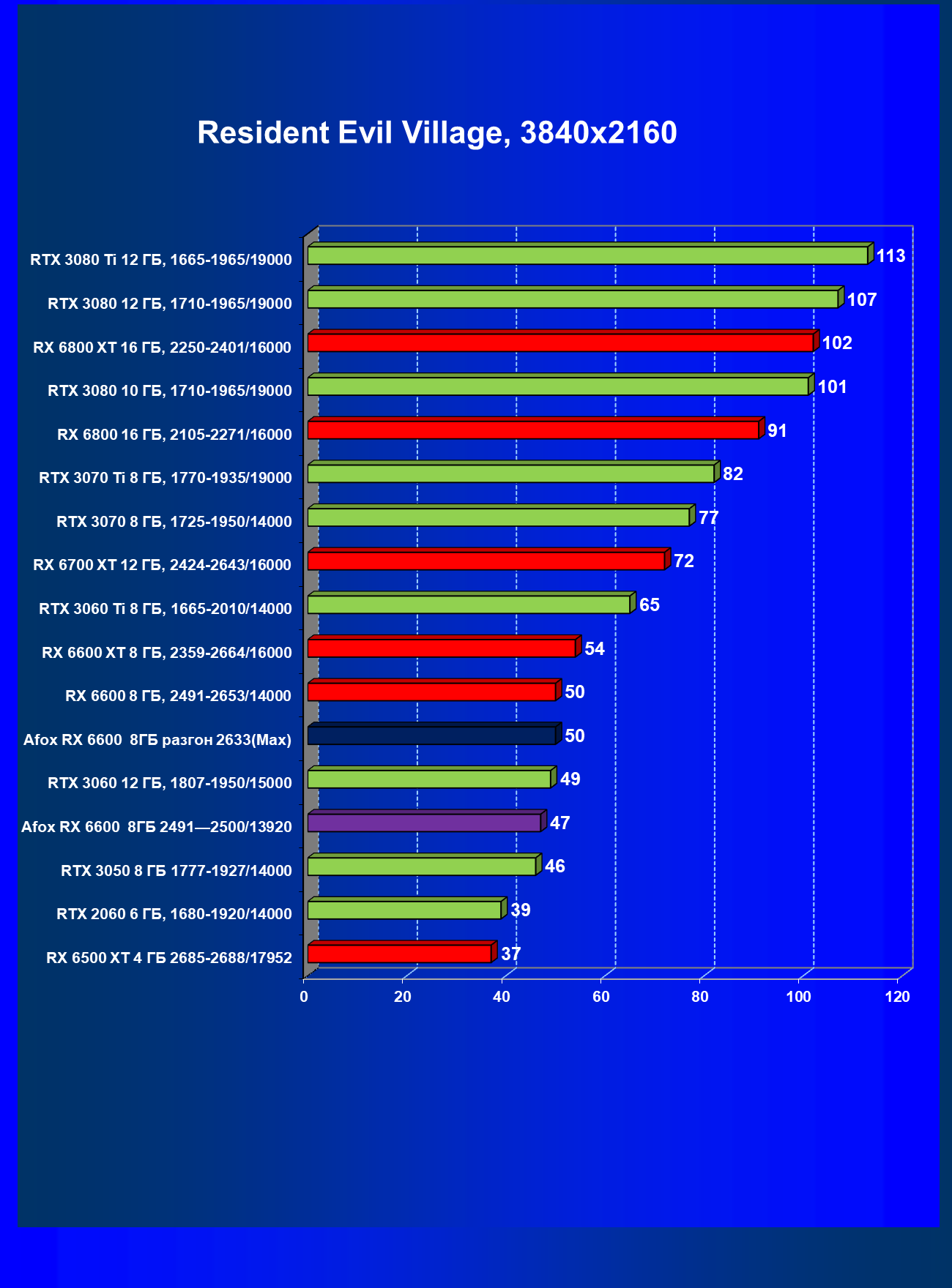 | 12 | Afox RX 6600 8 ГБ, разгон до 2633/14400 | 180 | 55 | 33 000 |