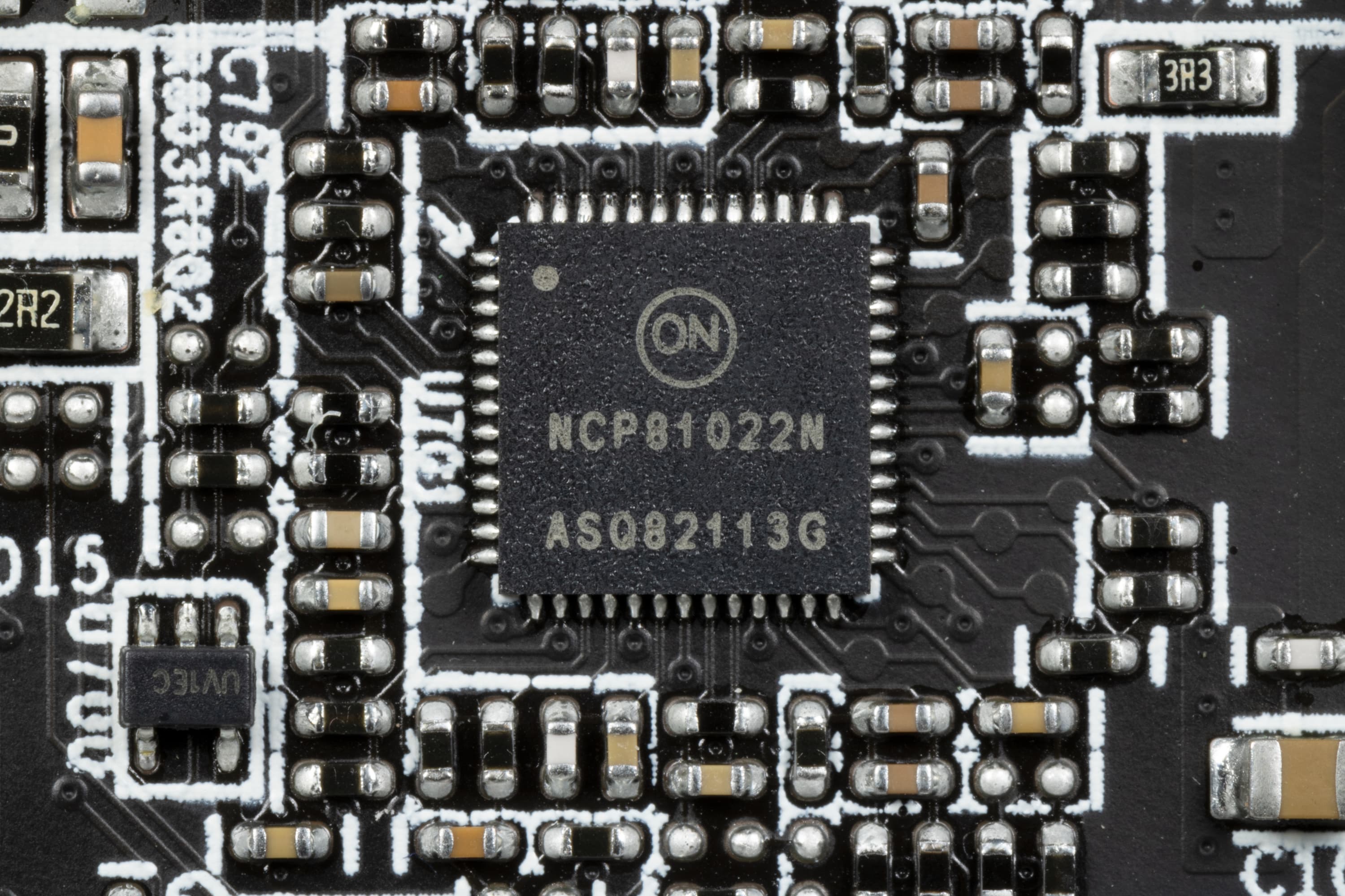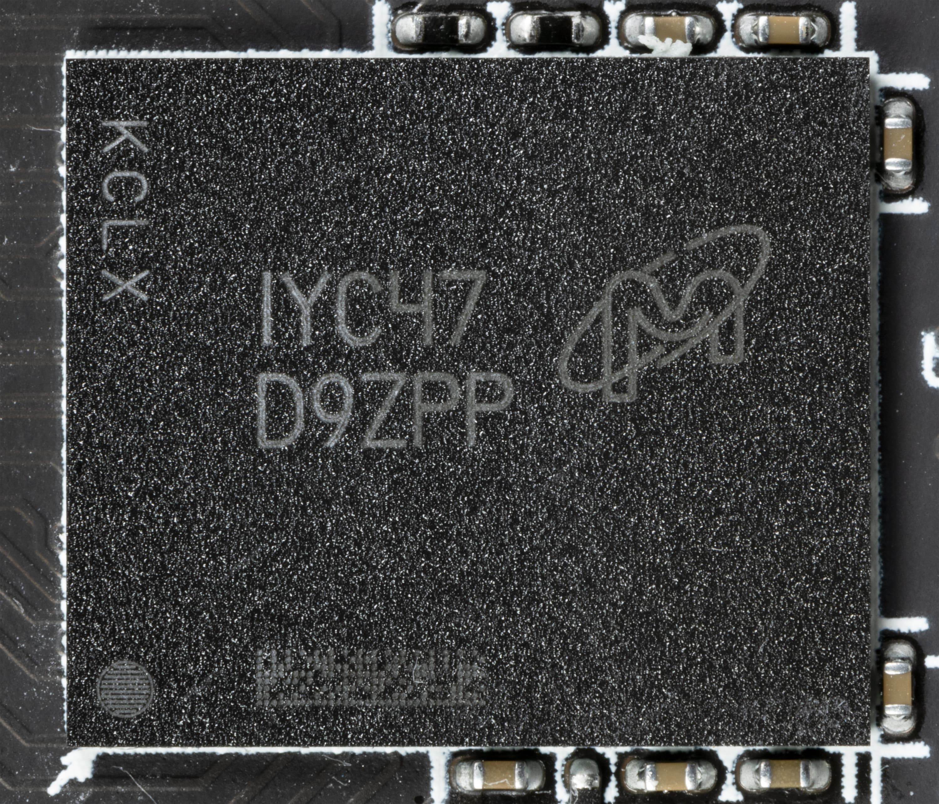 На той же стороне имеется ШИМ-контроллер NCP81022N (On Semiconductor), который управляет двухфазной схемой питания микросхем памяти.