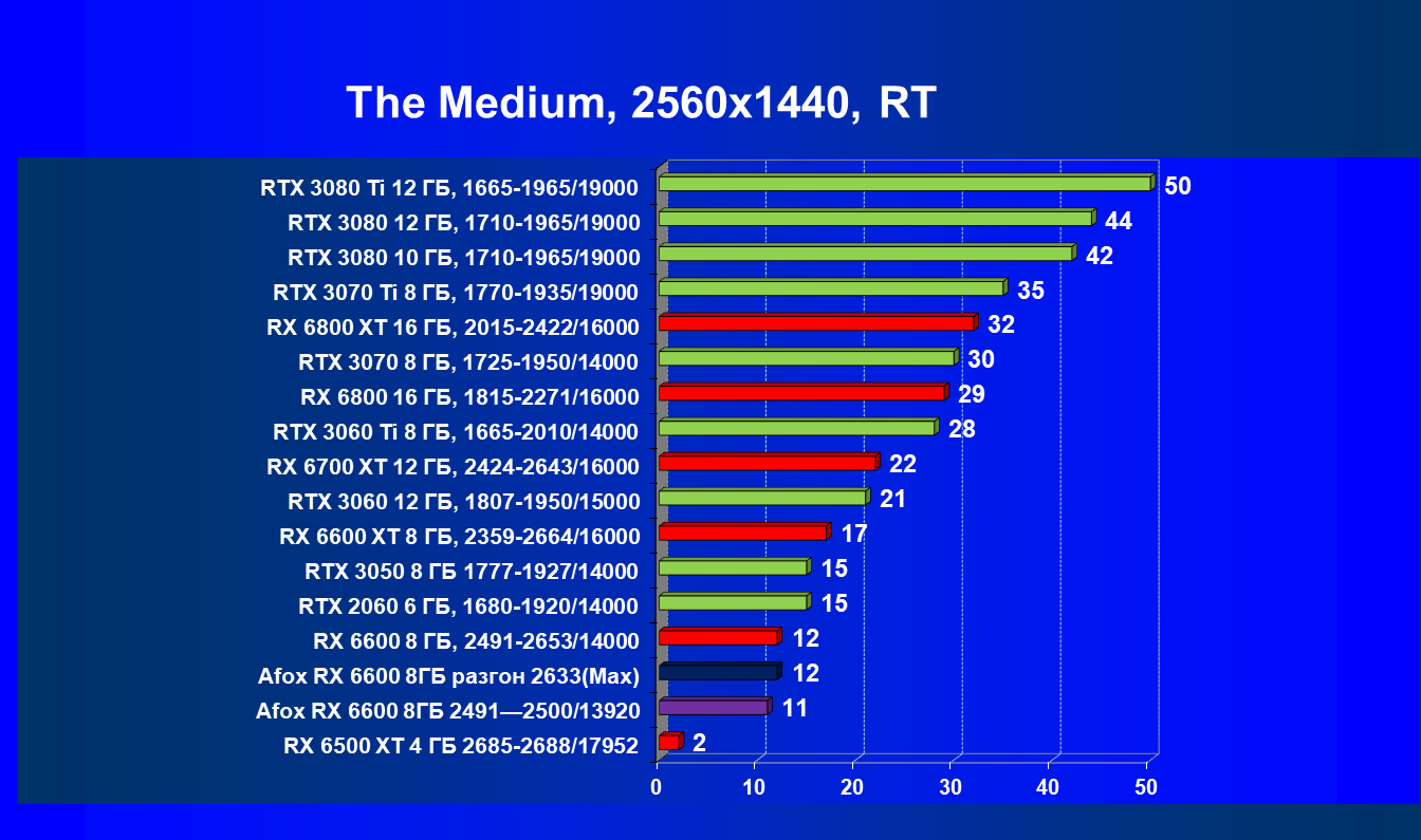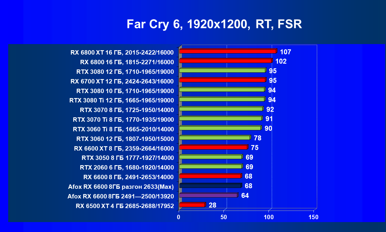 И если сравнивать рассматриваемую нами сегодня модель Radeon RX 6600 с аналогичной по уровню, но чуть более дорогой GeForce RTX 3050, то видеокарта AMD оказывается более производительной, но в некоторых более оптимизированных играх под GeForce RTX обозреваемый нами ускоритель немного уступает по количеству FPS. При этом карта Afox из-за чуть-чуть сниженных максимальных частот работы ядра выступила почти на уровне RTX 3050.
