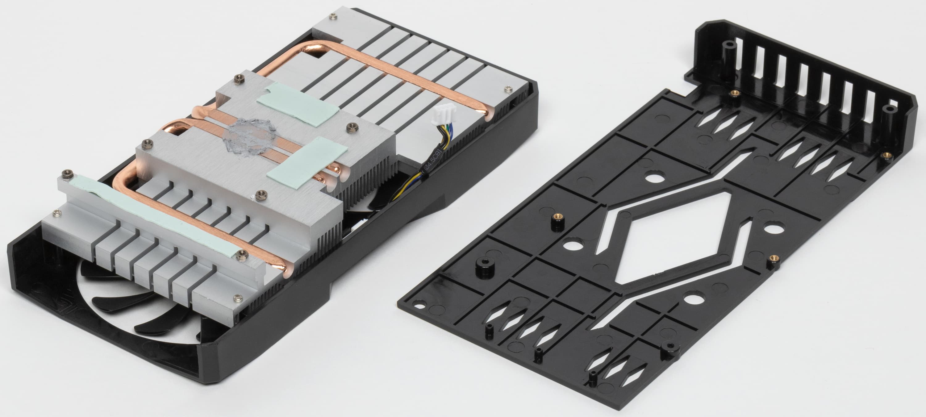 Основной пластинчатый радиатор, выполненный из алюминиевого сплава, имеет две тепловые трубки, впрессованные в подошву, охлаждающую GPU и микросхемы памяти. С помощью дополнительной подошвы на радиаторе через термопрокладки тепло отводится от преобразователей питания ядра и памяти.