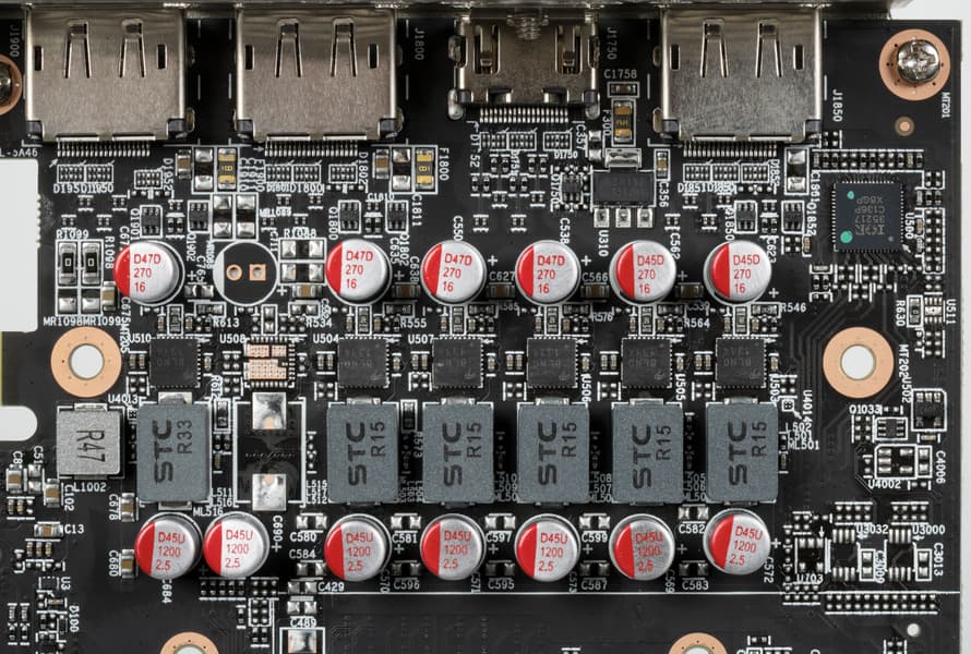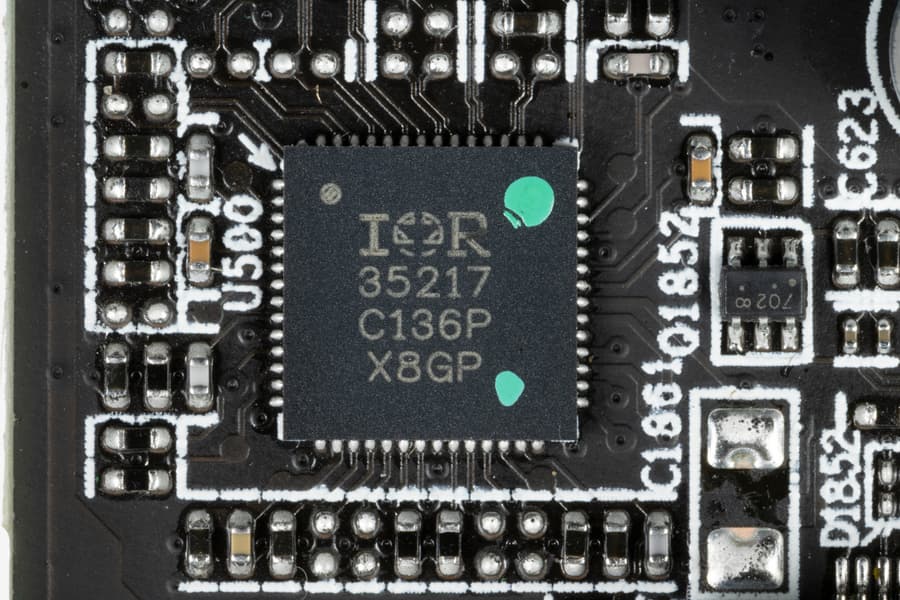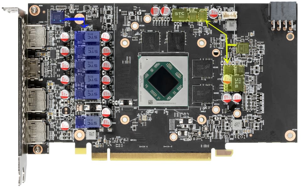 Синим цветом отмечены фазы питания графического процессора (ГП), желтым — памяти. Для управления схемой питания ядра используется ШИМ-контроллер IR 35217 (Infineon), расположенный на лицевой стороне платы.