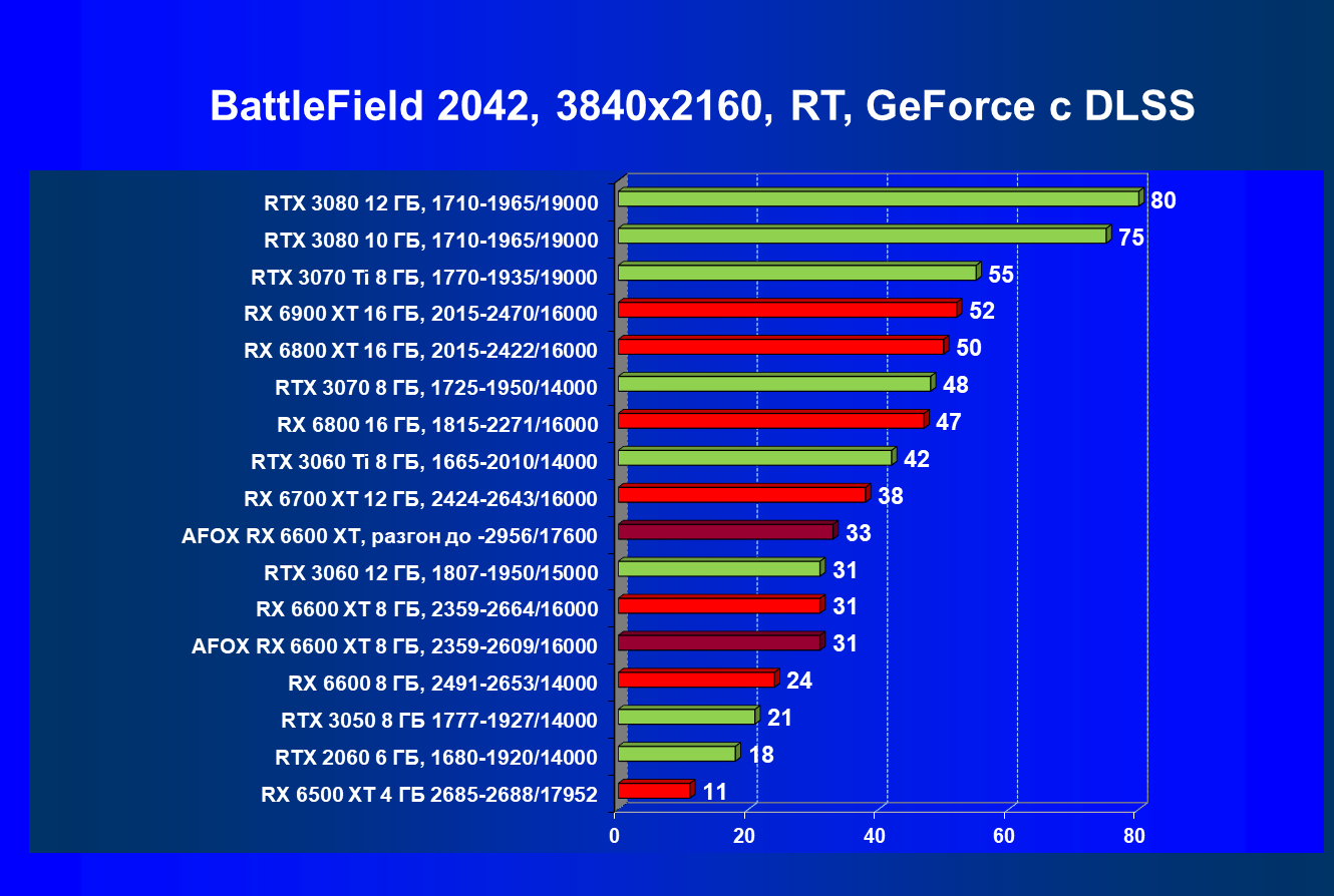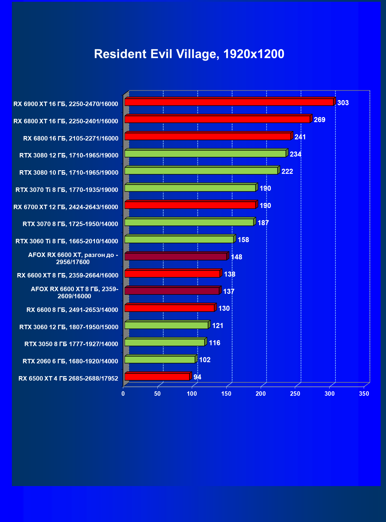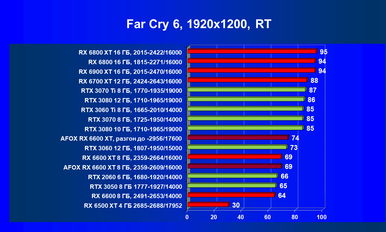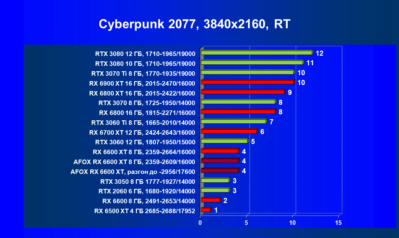 | 12 | Afox RX 6600 XT 8 ГБ, 2359—2609/16000 | 310 | 74 | 42 000 |