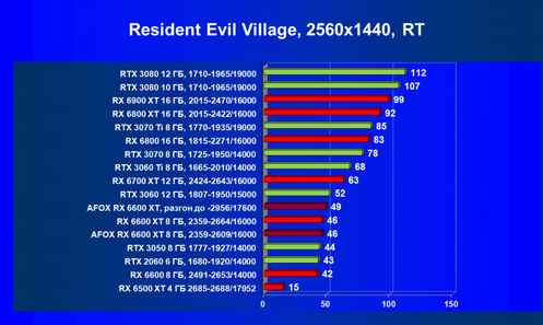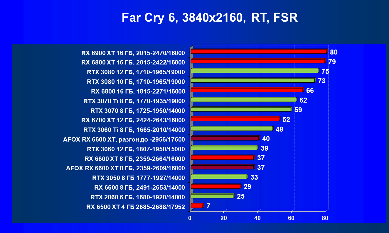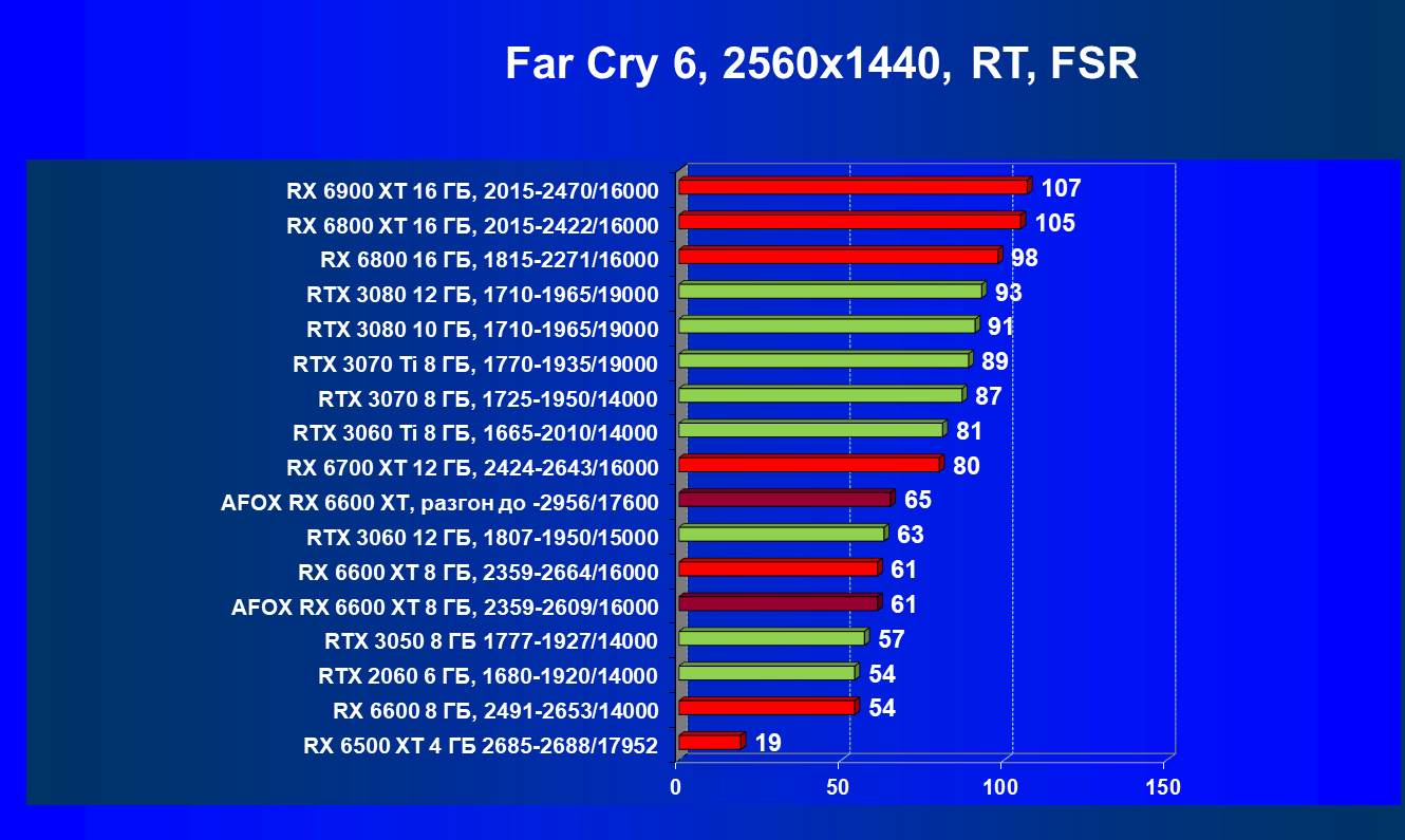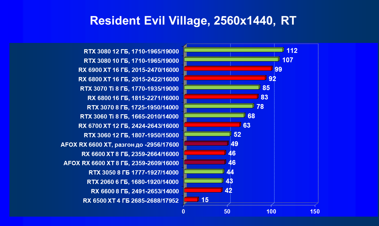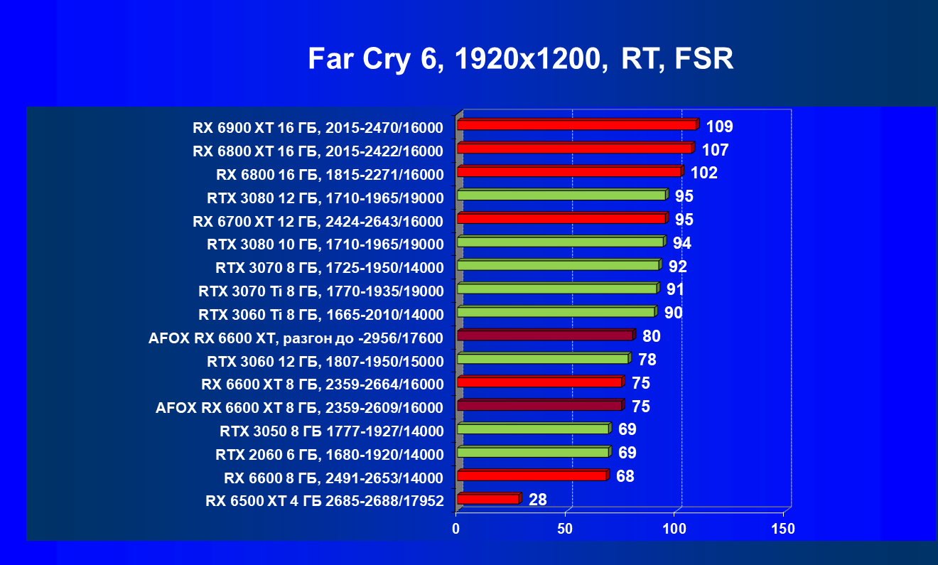 Несмотря на то, что в ряде используемых нами игр уже присутствует технология AMD FSR, помогающая компенсировать падения производительности при включении трассировки лучей, все же у семейства Radeon RX 6xxx степени этого самого падения сильно больше, нежели у RTX 3xxx, и даже FSR не особо помогает, поэтому в таких играх с RT конкурент в лице RTX 3060 уже чуть обходит RX 6600 XT, будучи по стоимости примерно на равных с последним. И только ручной разгон карты Afox помог ей все же остаться выше уровня RTX 3060.