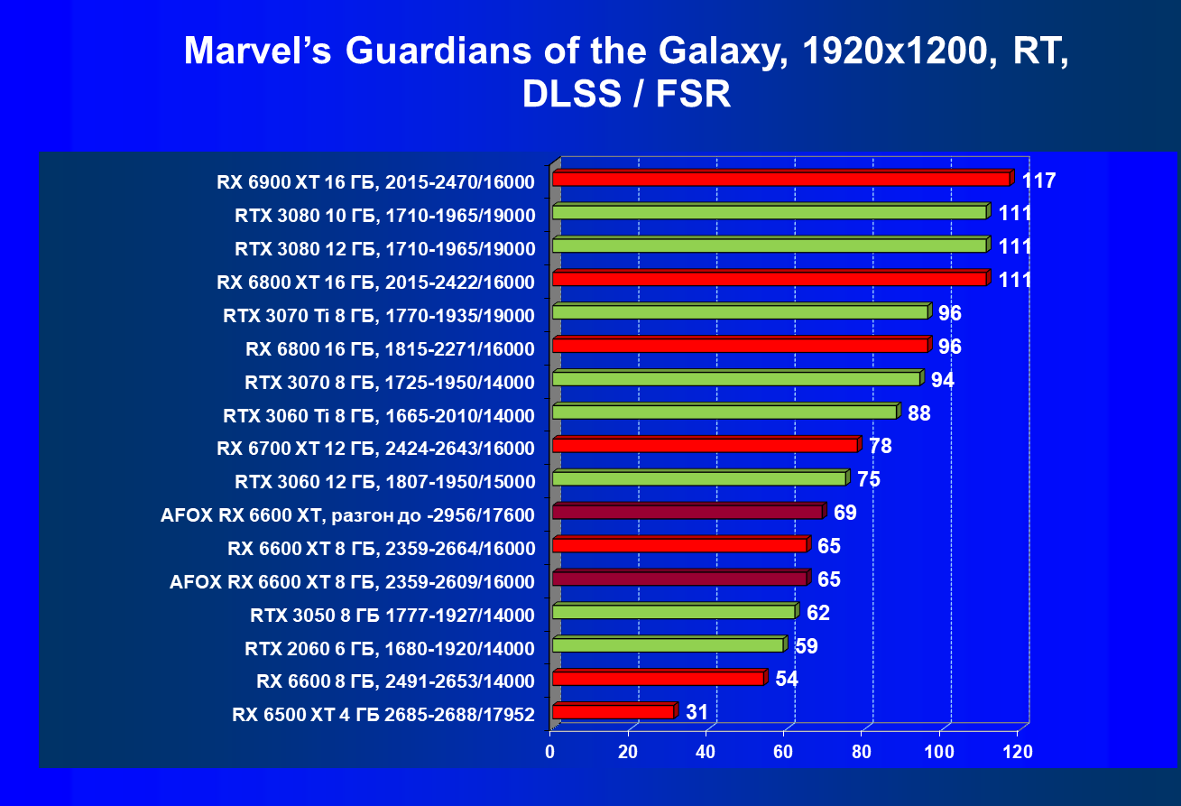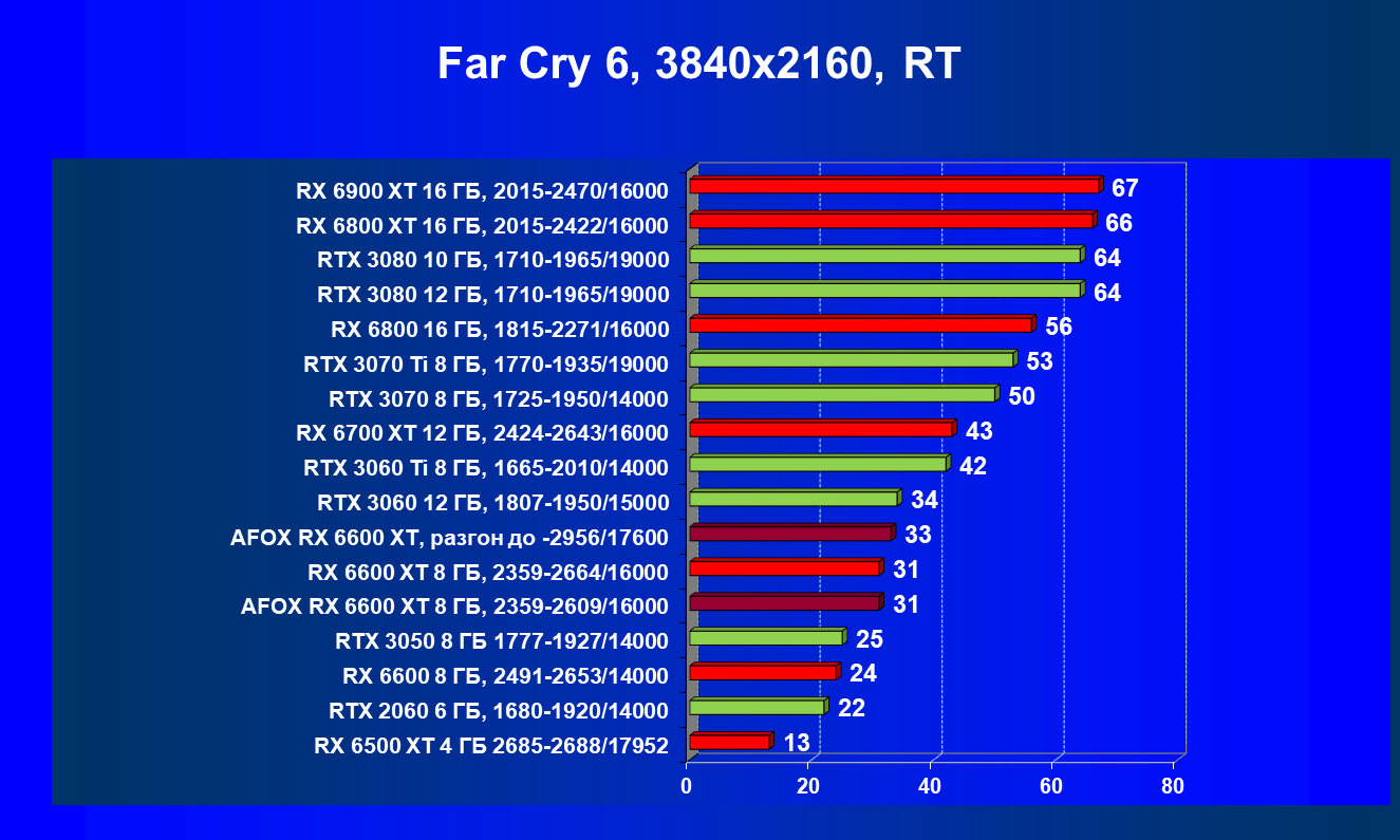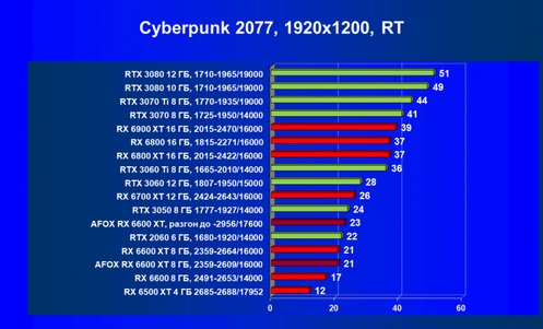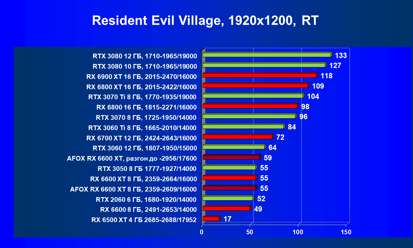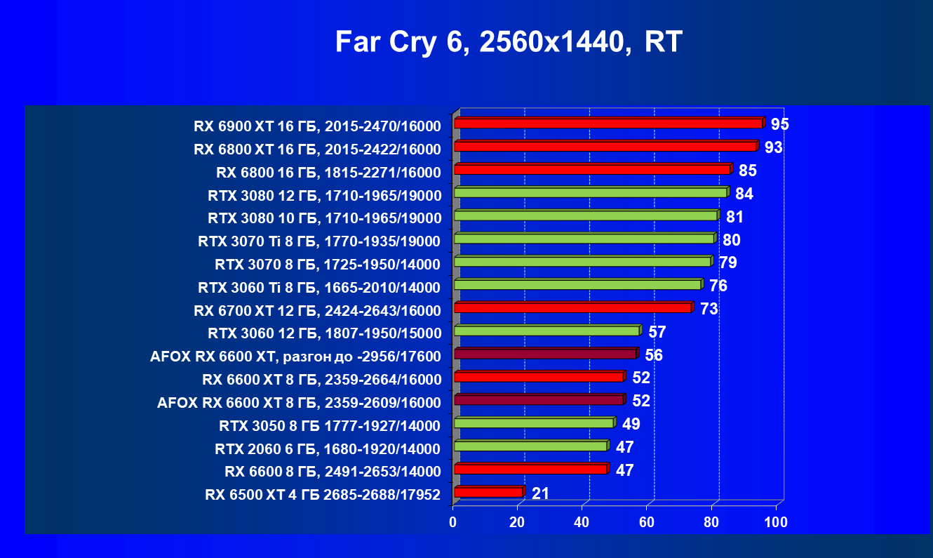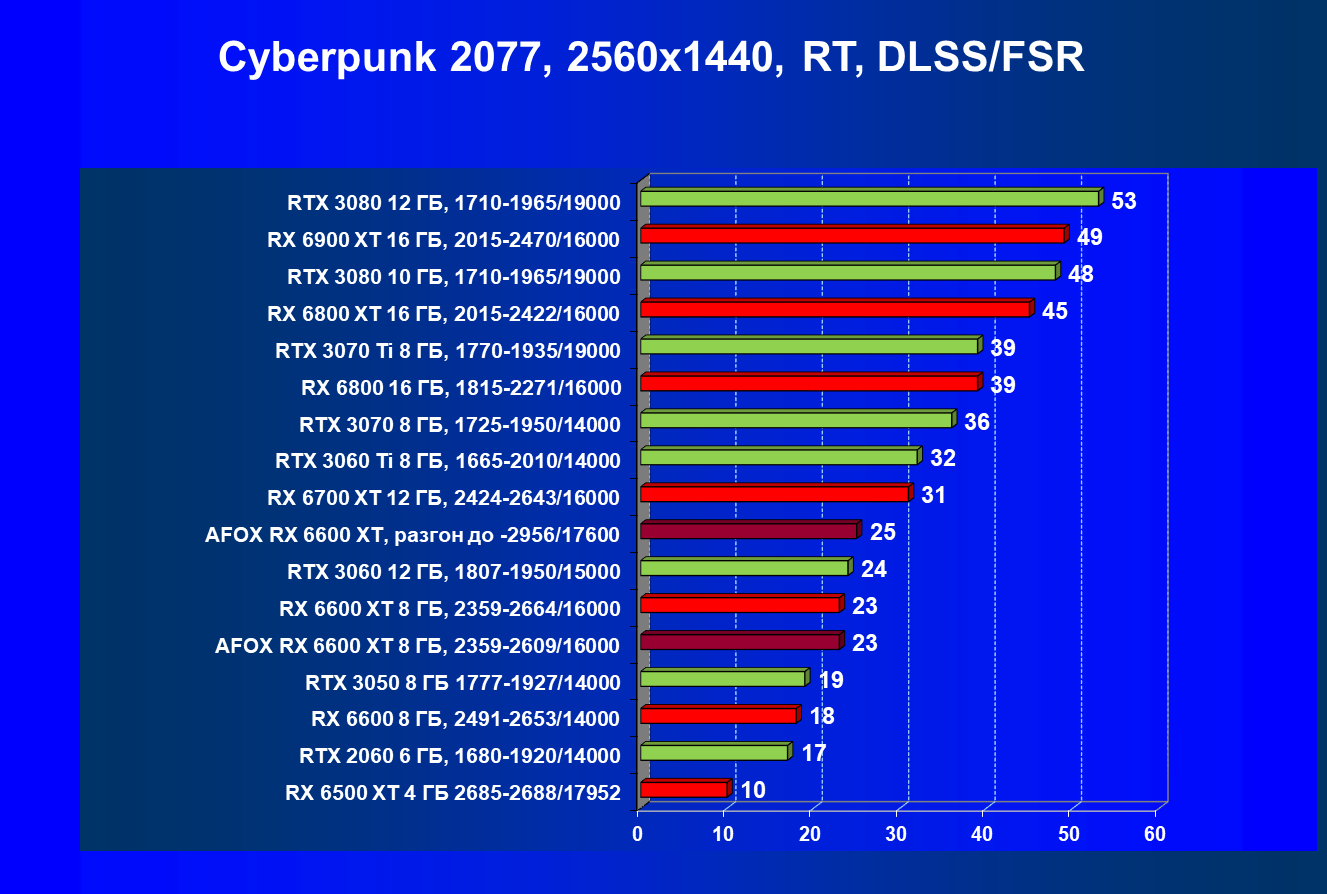 Несмотря на то, что в ряде используемых нами игр уже присутствует технология AMD FSR, помогающая компенсировать падения производительности при включении трассировки лучей, все же у семейства Radeon RX 6xxx степени этого самого падения сильно больше, нежели у RTX 3xxx, и даже FSR не особо помогает, поэтому в таких играх с RT конкурент в лице RTX 3060 уже чуть обходит RX 6600 XT, будучи по стоимости примерно на равных с последним. И только ручной разгон карты Afox помог ей все же остаться выше уровня RTX 3060.