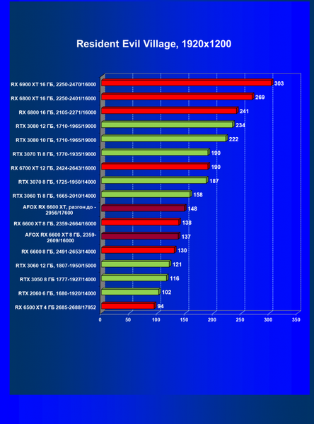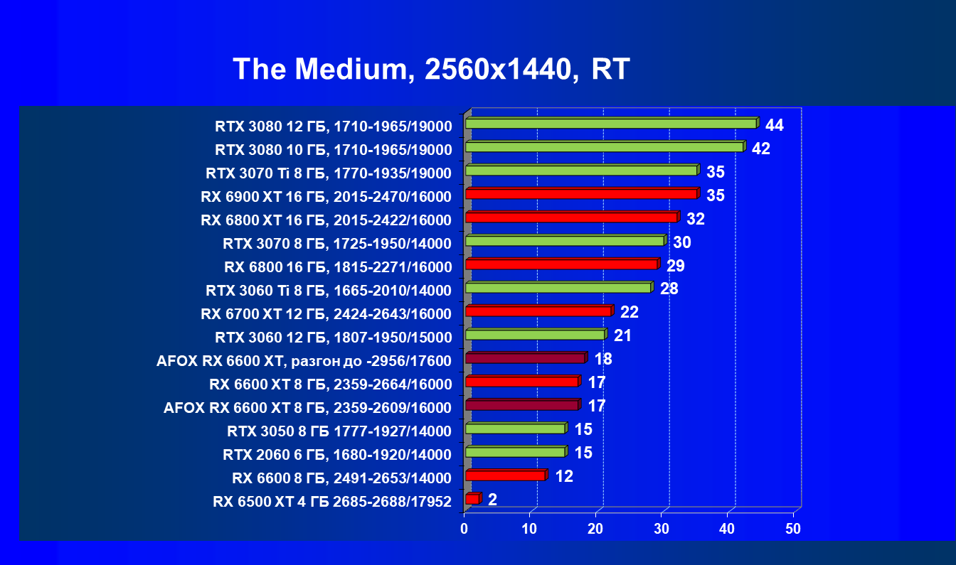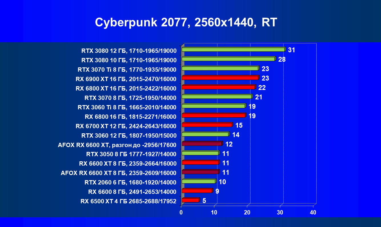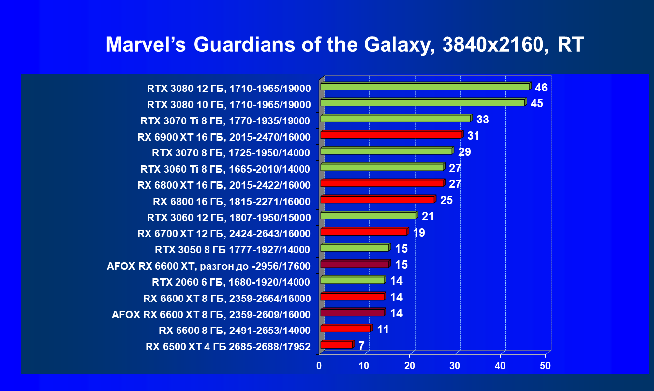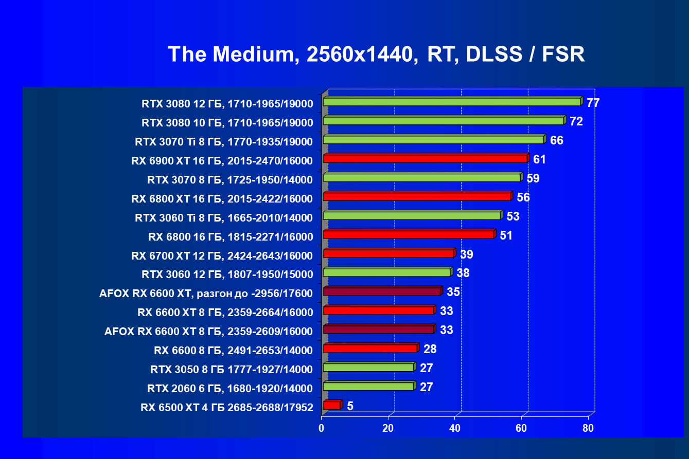 Несмотря на то, что в ряде используемых нами игр уже присутствует технология AMD FSR, помогающая компенсировать падения производительности при включении трассировки лучей, все же у семейства Radeon RX 6xxx степени этого самого падения сильно больше, нежели у RTX 3xxx, и даже FSR не особо помогает, поэтому в таких играх с RT конкурент в лице RTX 3060 уже чуть обходит RX 6600 XT, будучи по стоимости примерно на равных с последним. И только ручной разгон карты Afox помог ей все же остаться выше уровня RTX 3060.