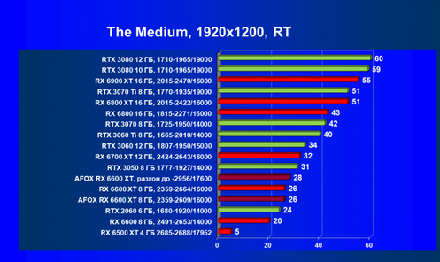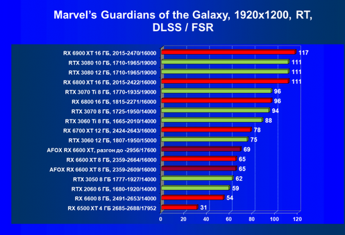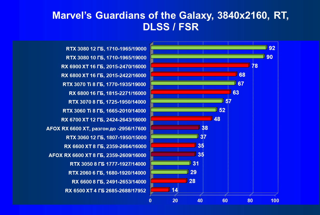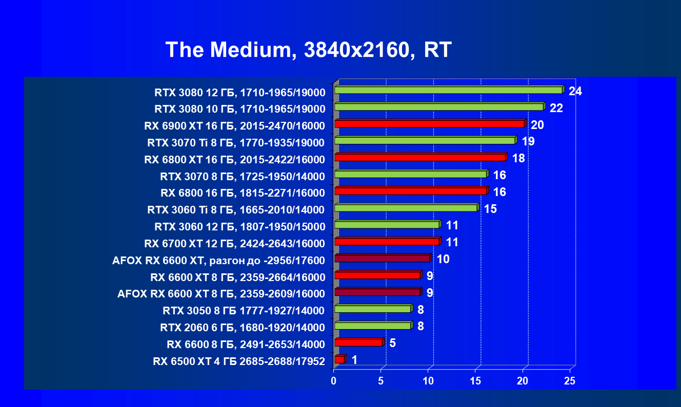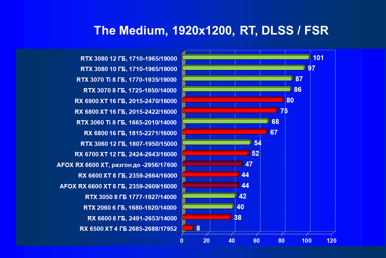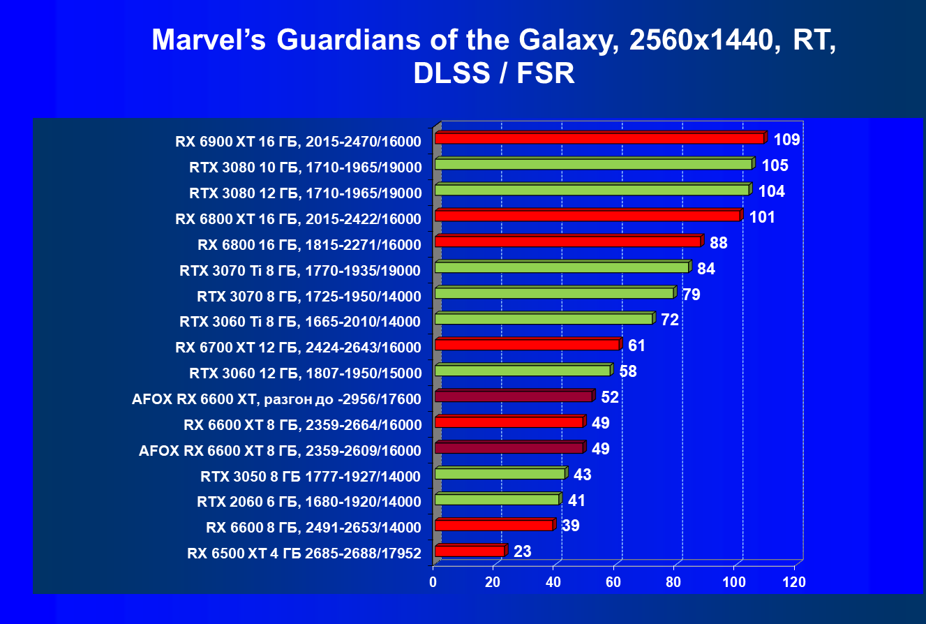 Несмотря на то, что в ряде используемых нами игр уже присутствует технология AMD FSR, помогающая компенсировать падения производительности при включении трассировки лучей, все же у семейства Radeon RX 6xxx степени этого самого падения сильно больше, нежели у RTX 3xxx, и даже FSR не особо помогает, поэтому в таких играх с RT конкурент в лице RTX 3060 уже чуть обходит RX 6600 XT, будучи по стоимости примерно на равных с последним. И только ручной разгон карты Afox помог ей все же остаться выше уровня RTX 3060.