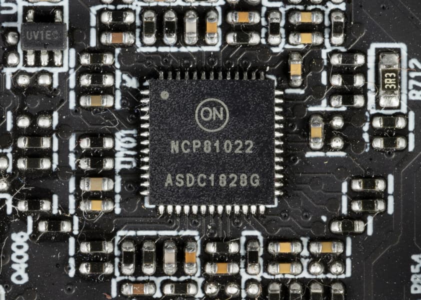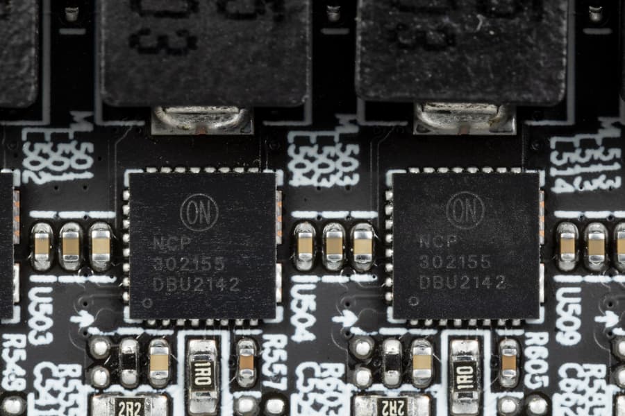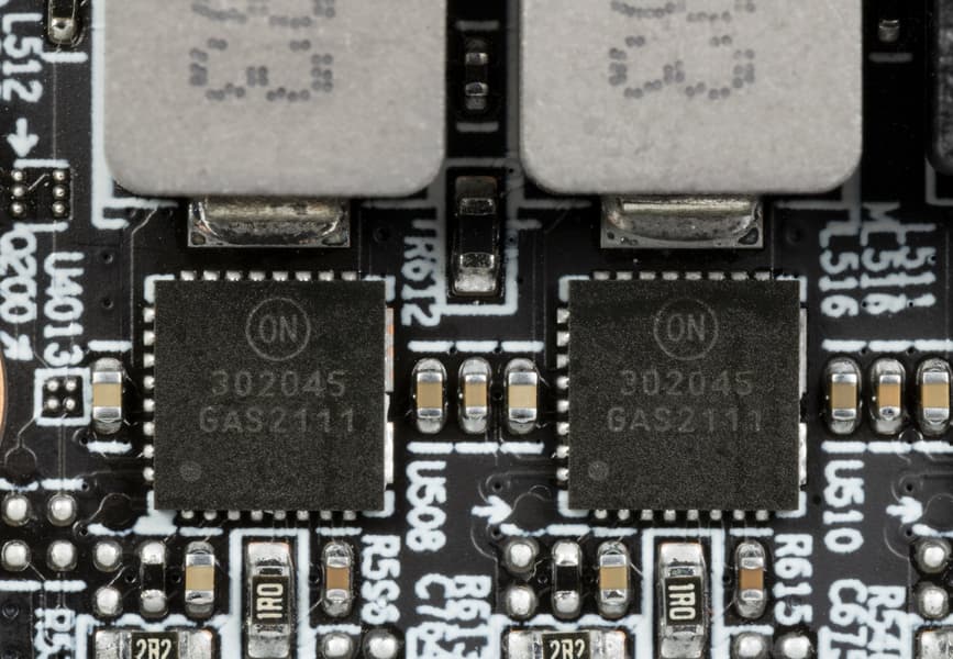 В преобразователе питания GPU использованы транзисторные сборки DrMOS производства On Semiconductor — в данном случае NCP302155, каждая из которых рассчитана на максимальный ток в 55 А.