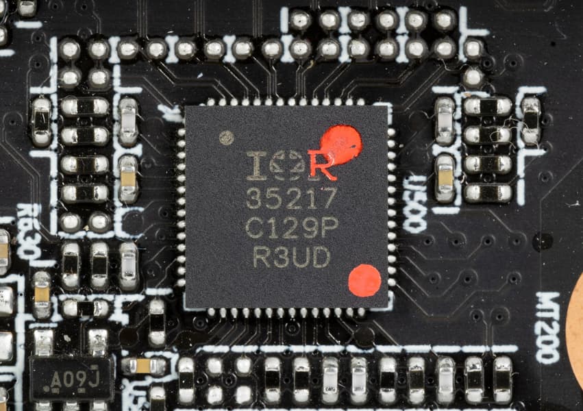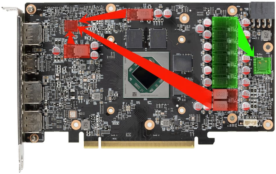 Зеленым цветом отмечена схема питания ядра, красным — памяти. ШИМ-контроллер IR35217 (IOR/Infineon) управляет 6 фазами питания GPU.