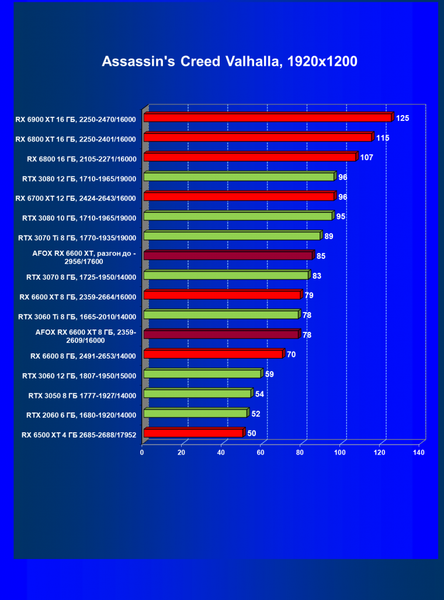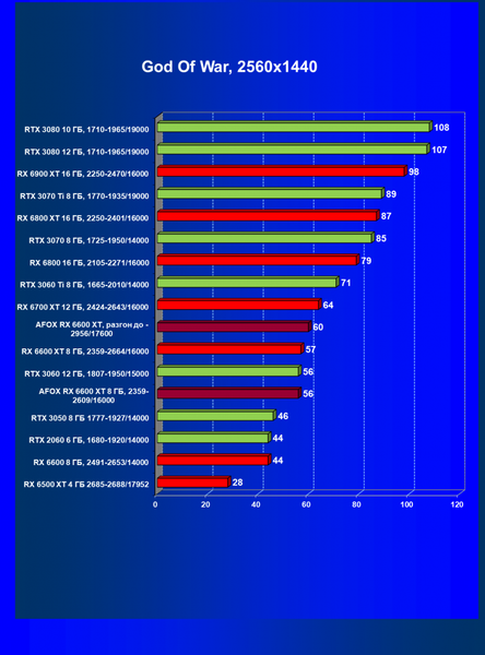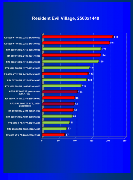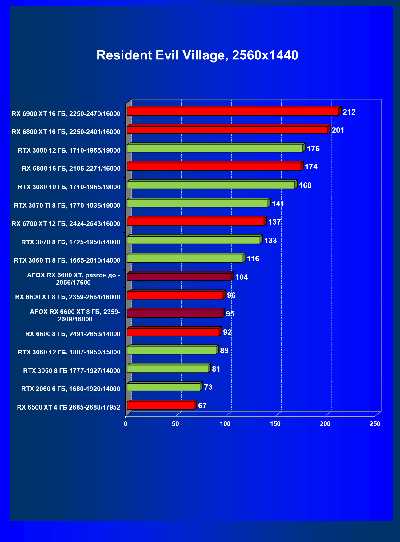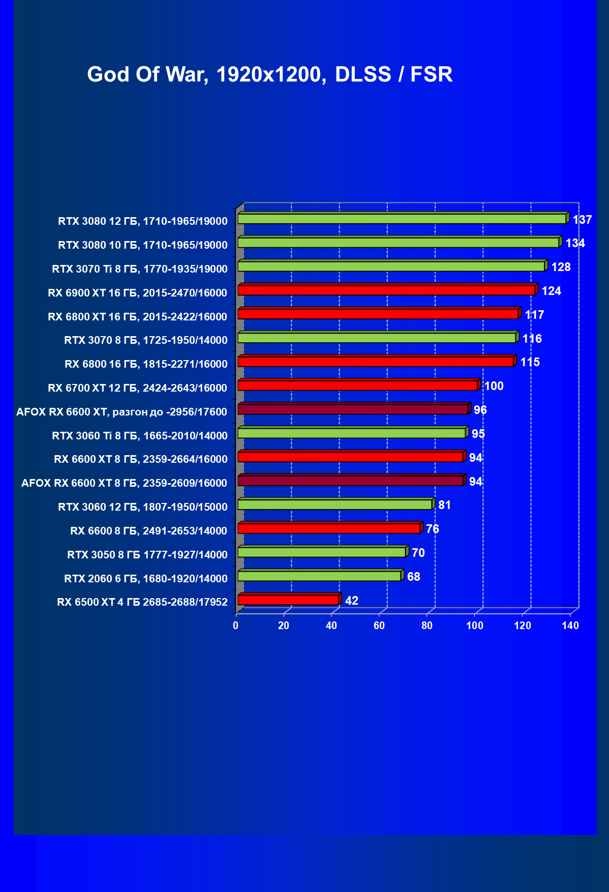 | 11 | Afox RX 6600 XT 8 ГБ, 2359—2609/16000 | 210 | 50 | 42 000 |