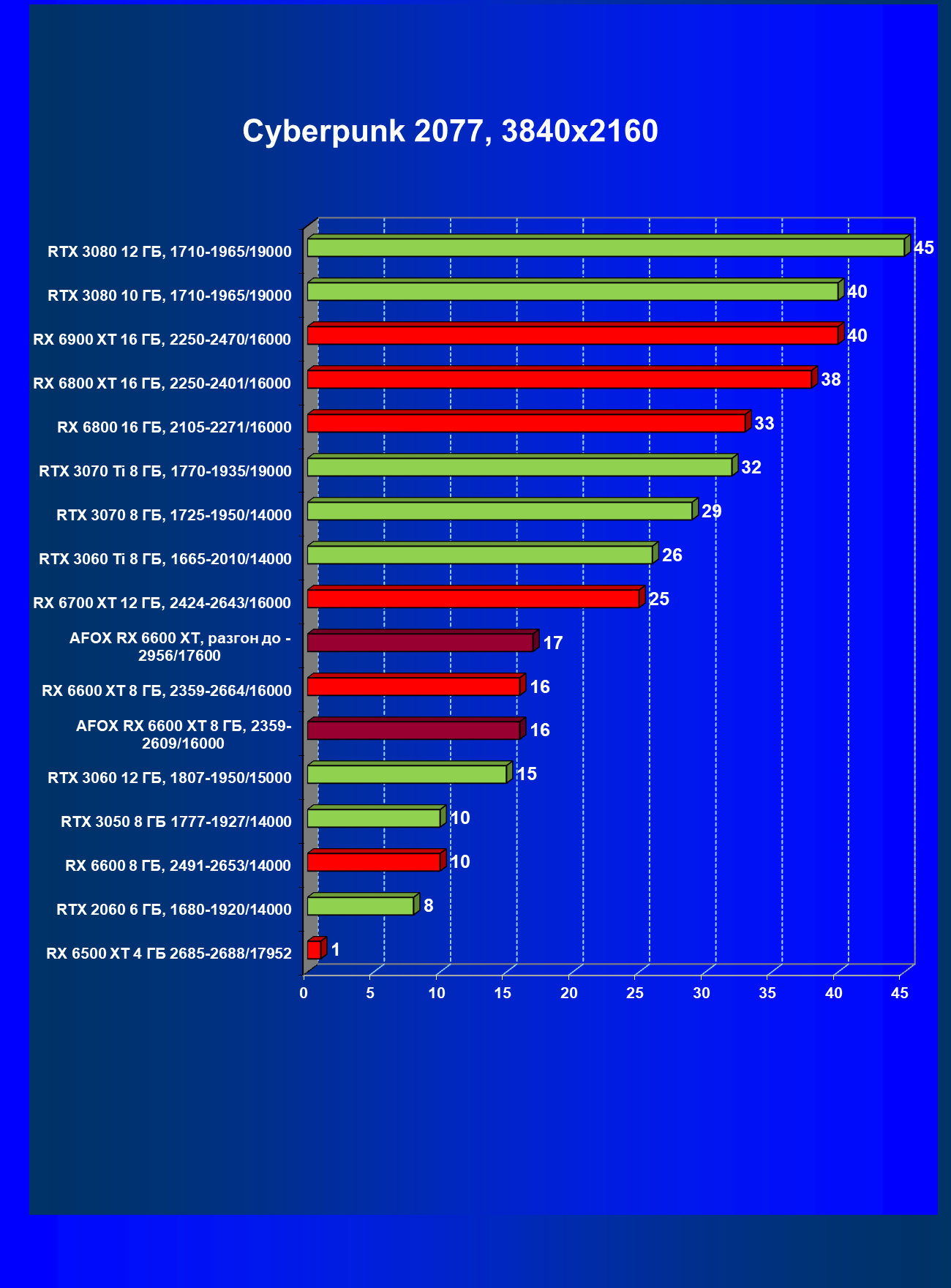 | 10 | Afox RX 6600 XT, разгон до 2956/17600 | 230 | 55 | 42 000 |