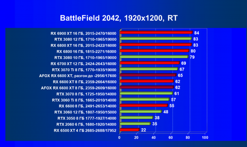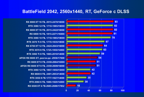 Рейтинг составлен по 9 тестам, где используется технология трассировки лучей и где одновременно присутствуют Nvidia DLSS и AMD FSR. Этот рейтинг нормирован по самому слабому ускорителю в данной группе — Radeon RX 6500 XT (то есть сочетание скорости и функций Radeon RX 6500 XT приняты за 100%).