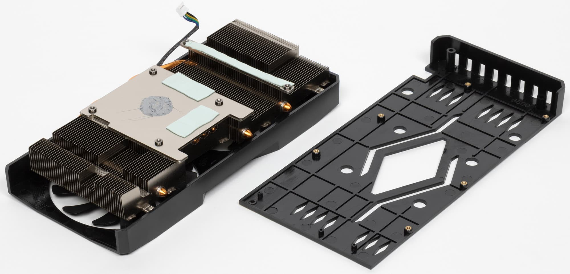Основой СО является небольшой пластинчатый никелированный радиатор из медного сплава с тремя тепловыми трубками, припаянными к подошве прямого контакта с GPU и микросхемами памяти (с помощью термоинтерфейса). Для охлаждения компонентов преобразователей питания VRM GPU на радиаторе имеется своя небольшая подошва. Для мосфетов VRM памяти охлаждение не предусмотрено.