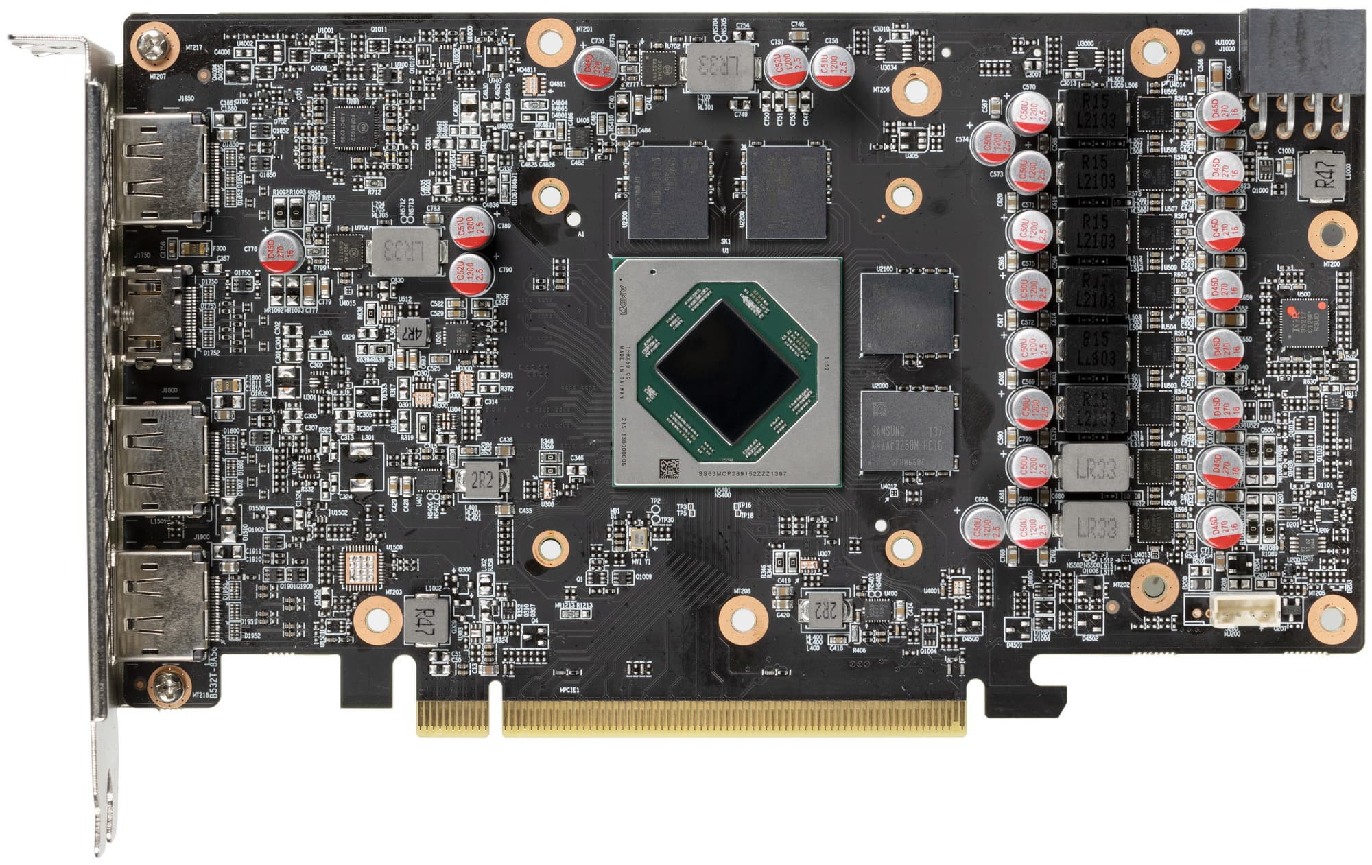 У платы привычное количество видеовыходов (4), да и набор не менее привычен: 3 DP 1.4 и 1 HDMI 2.1.