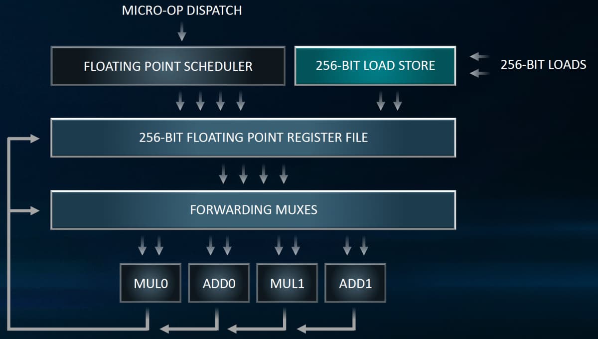 Также специалисты AMD не обошли вниманием и один из главных недостатков Zen — производительность вычислений с плавающей запятой. Во втором поколении микроархитектуры они удвоили емкость и увеличили пропускную способность загрузки и хранения для операций с плавающей запятой до 256-бит, а также увеличили пропускную способность внутренних потоков данных во всех режимах работы CPU.