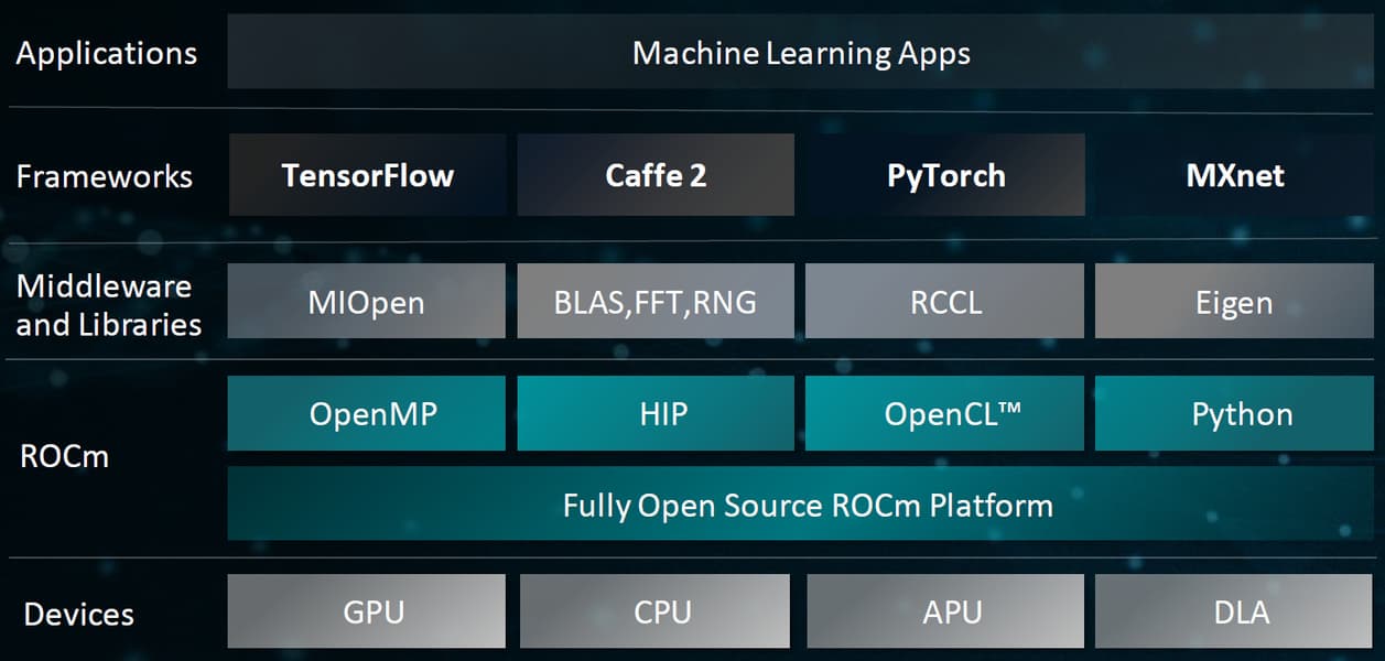 Кроме аппаратной части, всегда очень важна и программная поддержка — особенно в сфере применения GPU в неграфических вычислениях. Вместе с двумя новыми Radeon Instinct, компания AMD также представила и вторую версию своей открытой программной платформы ROCm для ускоренных вычислений, разработанной для создания высокопроизводительных гетерогенных компьютерных систем.