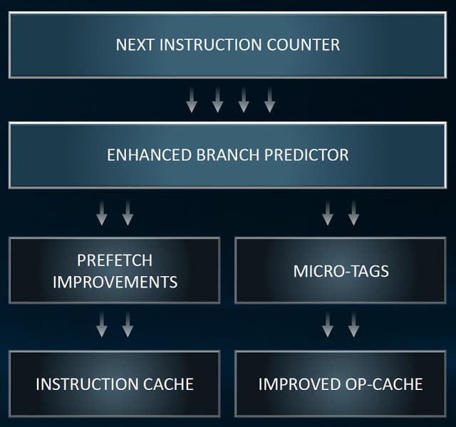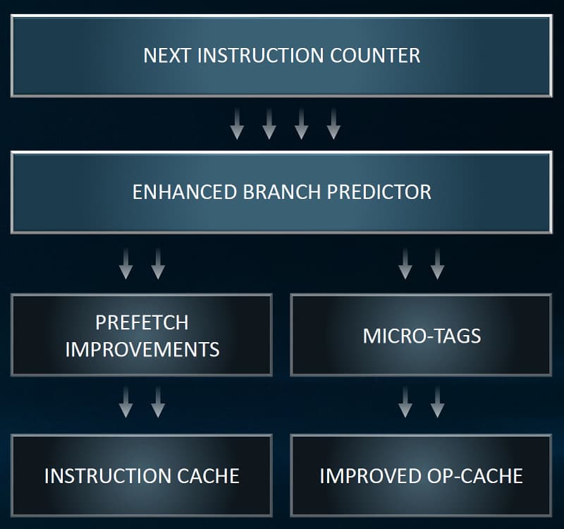 В числе других преимуществ Zen 2, по сравнению с архитектурой первого поколения, можно отметить: улучшенный конвейер, эффективнее поставляющий данные вычислительным движкам, усовершенствования по предсказанию ветвлений и предварительной выборке данных, оптимизированный кэш инструкций и увеличенный объем кэш-памяти.