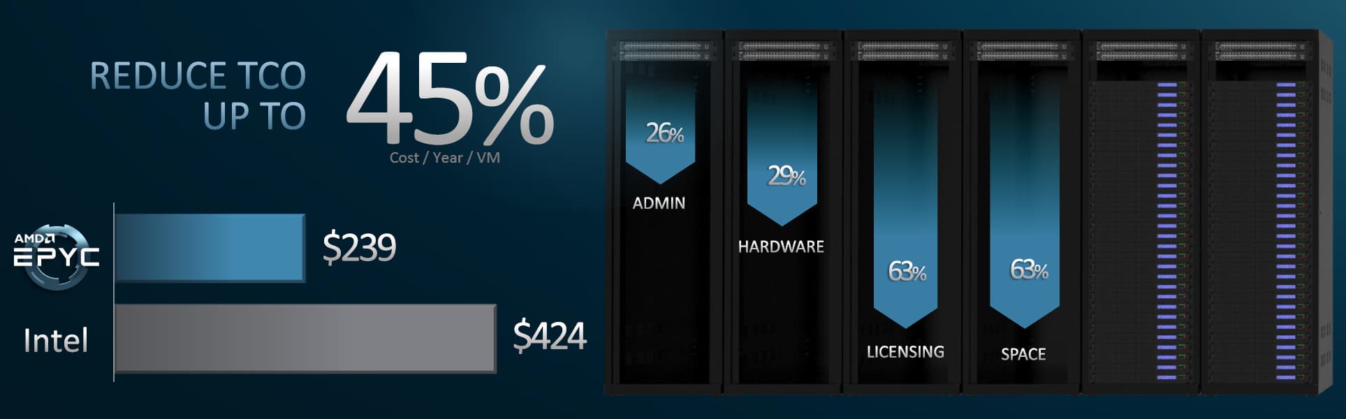 Еще в прошлом году компания AMD ворвалась на рынок ЦОД со своими серверными решениями семейства EPYC, которые оказались весьма конкурентоспособными в различных ценовых сегментах, предлагая большее количество вычислительных ядер, поддержку большего объема памяти и межузловых соединений, и особенно — уникальные ценовые предложения, позволяющие снизить как начальные затраты на оборудование, так и совокупную стоимость владения (Total Cost of Ownership — TCO).