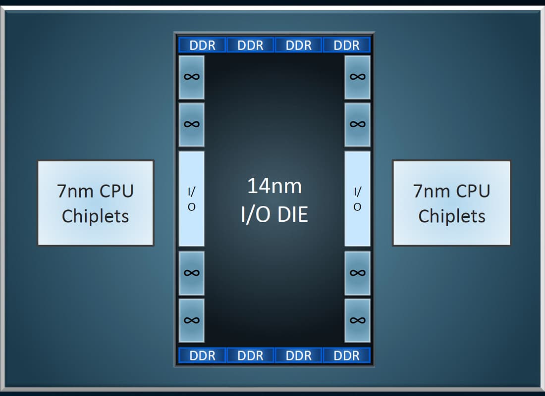 Каждая часть CPU использует наиболее подходящую технологию производства — высокопроизводительные ядра хорошо масштабируются и требуют максимально «тонкого» техпроцесса, а ядру ввода-вывода будет вполне достаточно и менее продвинутого 14 нм — но с улучшенными характеристиками по потреблению и задержкам. И если сами высокопроизводительные ядра Zen 2 получают преимущества использования новой технологии 7 нм TSMC, то для части процессора, отвечающей за ввод-вывод данных, используется куда более простой техпроцесс 14 нм GlobalFoundries.