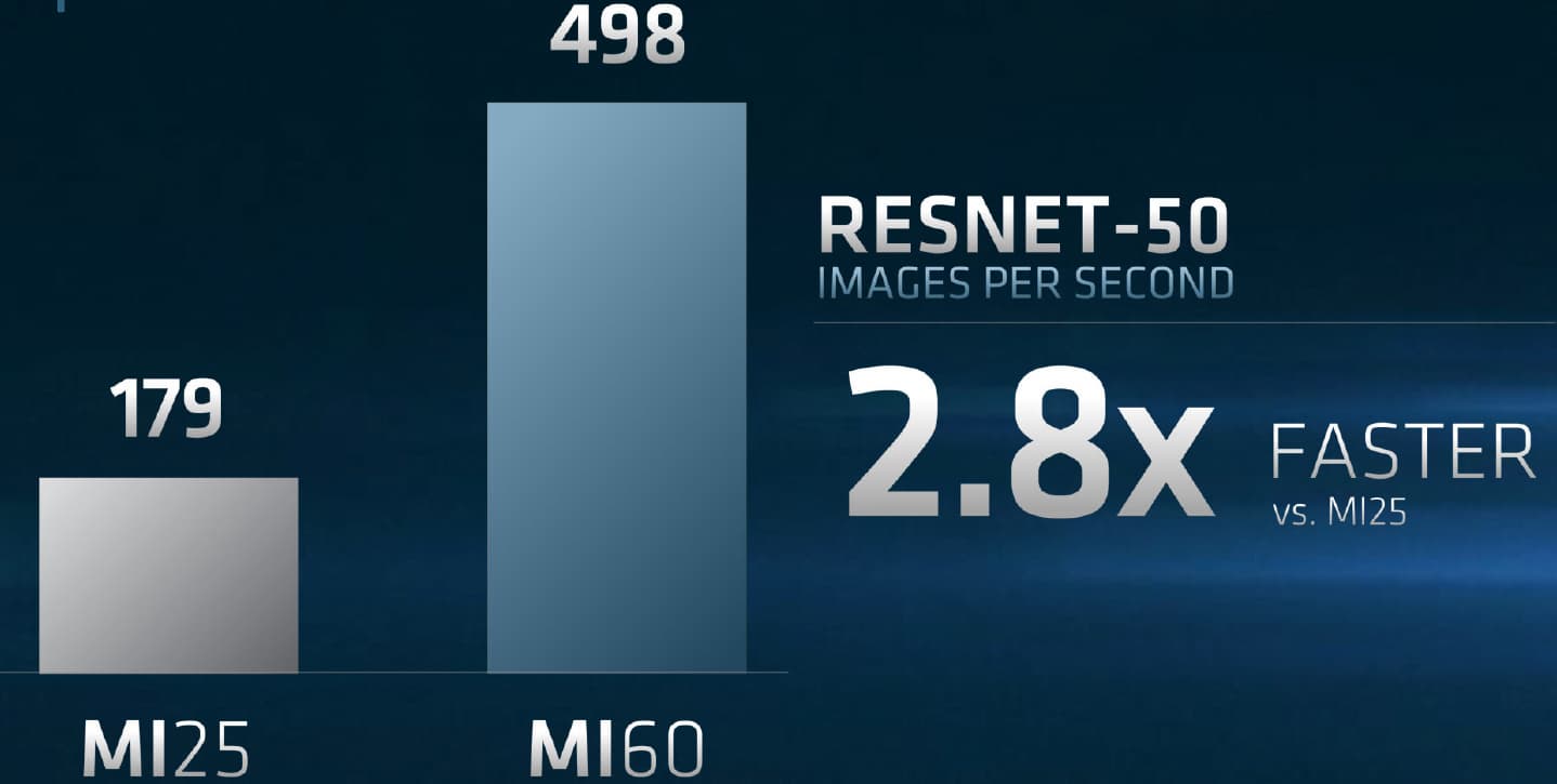 Вроде бы неплохо — лишь чуть ниже, но ведь если использовать возможности тензорных ядер на GV100, то результат конкурента превысит 1000 изображений/сек. Да, представители AMD уточняют, что они рассматривали в данном случае только FP32-операции для достижения более высокой точности, но ведь на практике для подобной обработки изображений вполне хватает и FP16 — в очень большом количестве случаев. Более того — чуть выше они же сравнивали MI25 и MI60 именно при такой точности!