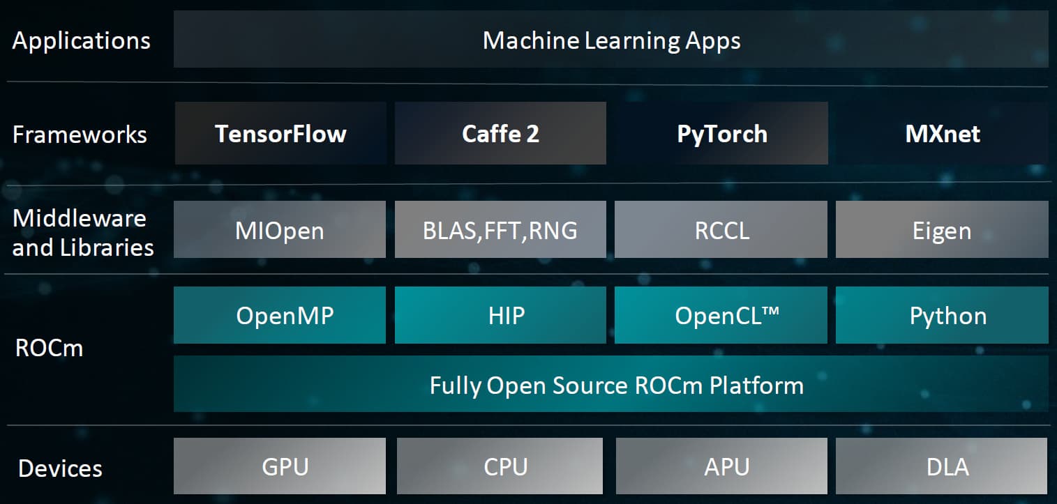 Аппаратная часть новых Radeon Instinct дополнена обновленной открытой программной платформой ROCm 2.0, и все это вместе обеспечивает поддержку самых требовательных приложений в сфере глубинного обучения и высокопроизводительных вычислений. Но так ли все прекрасно, как выглядит на слайдах компании?