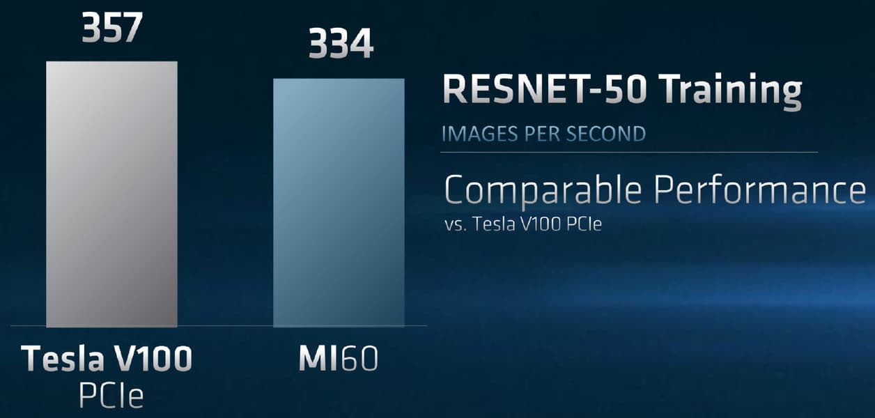 Вроде бы все хорошо — значительно менее сложный чип Vega 7 нм показывает почти такую же скорость, что и топовый GV100, да еще на поле последнего — в задаче глубокого обучения. На слайде AMD указано, что производительность Tesla V100 в этой задаче составляет 350 изображений в секунду при тренировке ResNet-50. А у MI60 лишь чуть меньше — 334 изображения/сек.