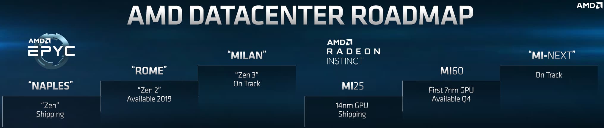 На прошедшем в ноябре мероприятии Next Horizon, компания AMD продемонстрировала свое стремление к тому, чтобы урвать максимально возможный кусок рынка ЦОД. Ими были представлены различные вычислительные продукты, разработанные для расширения возможностей современных ЦОД: следующее поколение серверных процессоров EPYC с революционной компоновкой и новые решения для параллельных вычислений серии Radeon Instinct, основанные на улучшенном графическом процессоре, произведенном по самому совершенному техпроцессу.