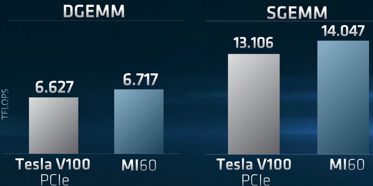 Но в чисто FP32/FP64-вычислениях, Vega действительно выглядит очень сильно. Правда, выходит этот GPU где-то через полтора года после конкурента, для достижения паритета понадобилась крупная смена техпроцесса, а потребление энергии у конкурирующих решений практически одинаковое — порядка 300 Вт. При этом, у Tesla есть свои преимущества в виде тензорных ядер, обеспечивающих более высокую скорость в задачах глубокого обучения с пониженной точностью. И эту возможность конкурента в AMD забыли упомянуть при сравнении, так как точности FP16 якобы недостаточно, не забыв рассказать про ускорение INT8-операций при глубоком обучении для Vega. Да и при сравнении новинки с MI25 в AMD не гнушались FP16-точностью (иначе новая Vega просто не обошла бы старую аж в 2,8 раза).