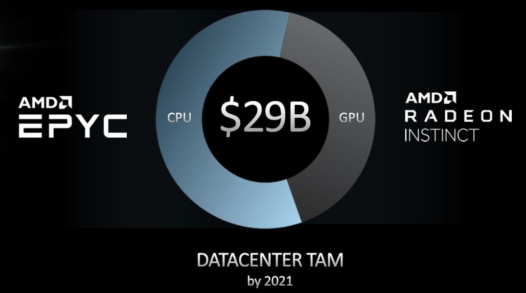 Рынок ЦОД сейчас особенно активно развивается и способен еще сильнее повлиять на то, как все устроено в нашем мире. А главное для коммерческих компаний — он имеет довольно большой объем, выраженный в денежных знаках и суммами со многими нулями. Это очень привлекательный рынок как для традиционных систем AMD на основе CPU (серверные процессоры EPYC), так и ускорителей параллельных вычислений на GPU — семейство Radeon Instinct.