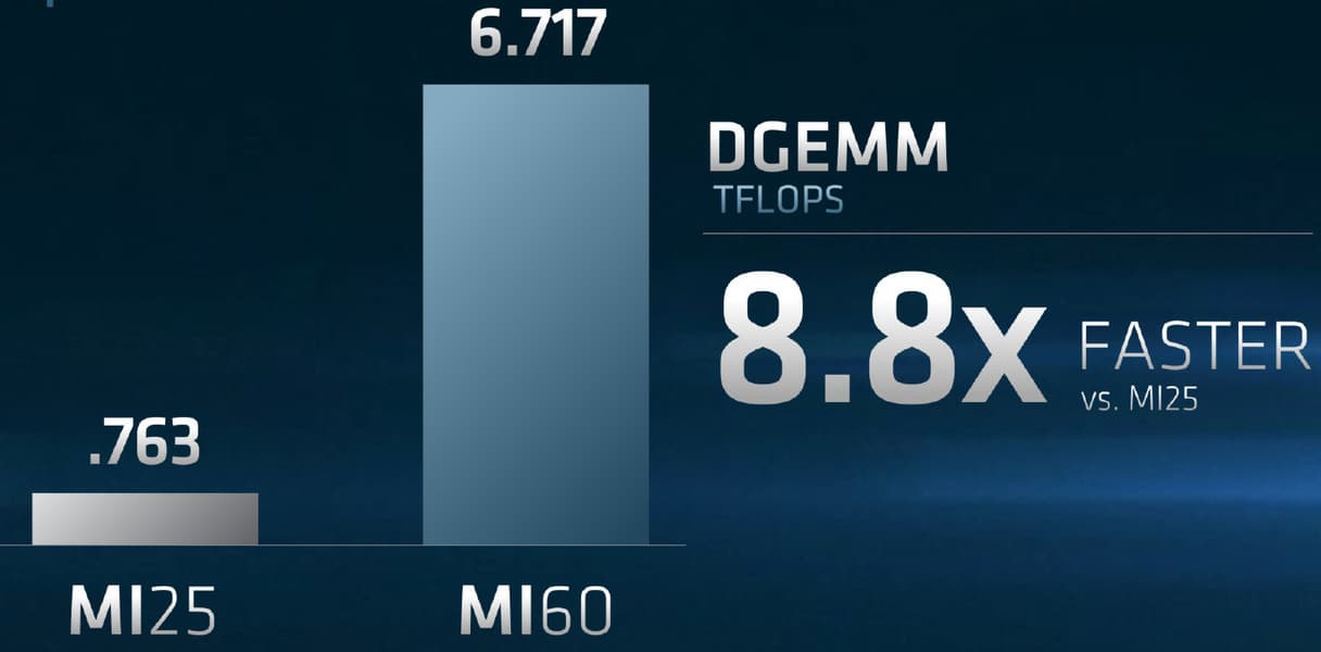 Все, что известно на данный момент, это пиковые значения производительности: 7,4 терафлопс для FP64, 14,7 терафлопс для FP32 и 118 TOPS для INT4. В итоге, MI60 стал самыми быстрым в мире ускорителем при вычислениях с двойной точностью, и эти возможности позволят исследователям более эффективно работать в приложениях HPC широкого спектра, включая энергетику, финансы, автомобилестроение, аэрокосмическую отрасль и т. д.