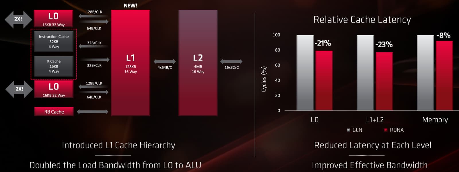Кроме того, что был повышен темп исполнения инструкций вычислительными процессорами, также увеличили и эффективность кэширования. Была изменена иерархия уровней кэш-памяти, добавлена кэш-память первого уровня общим объемом в 512 КБ, удвоена пропускная способность между вычислительными блоками и L0-кэшем, а объем L2-кэша стал больше — 4 МБ на чип (как у конкурирующей GeForce RTX 2060).