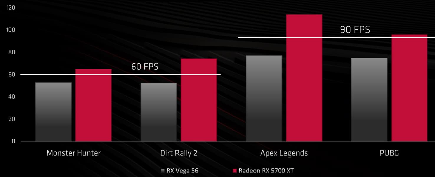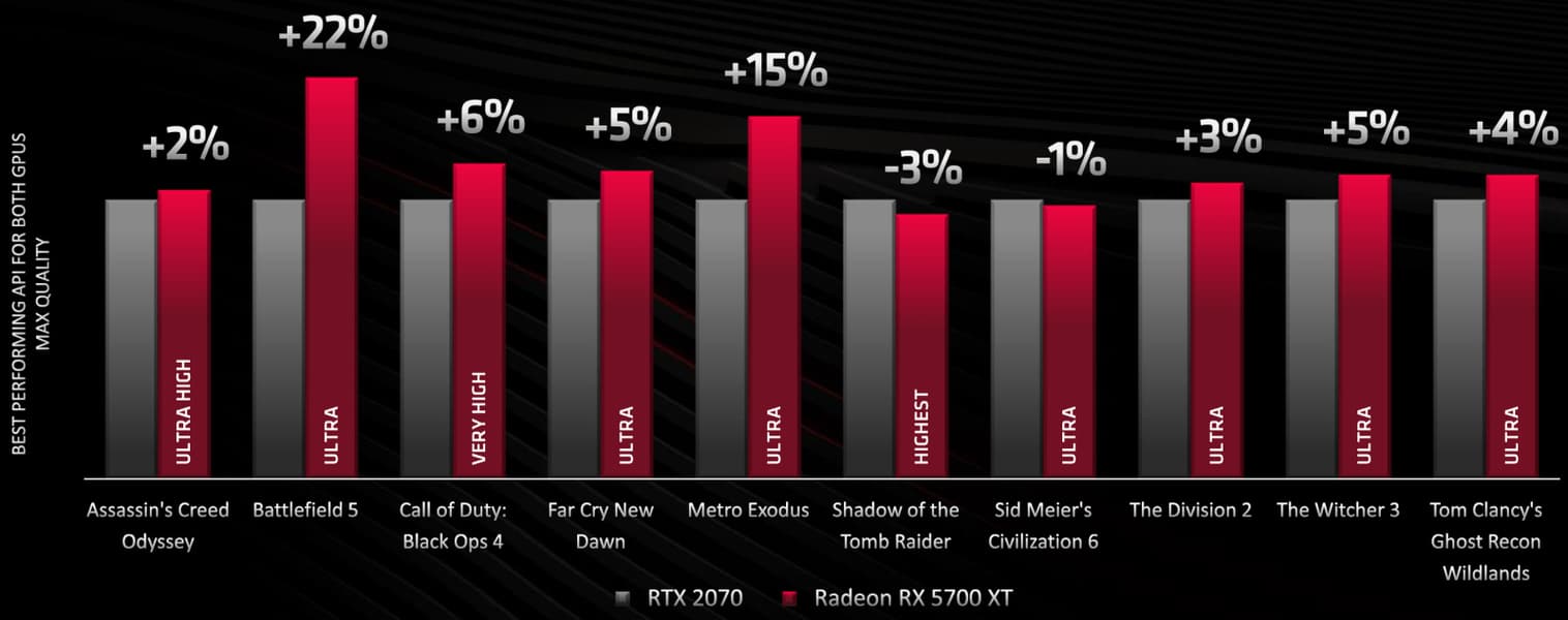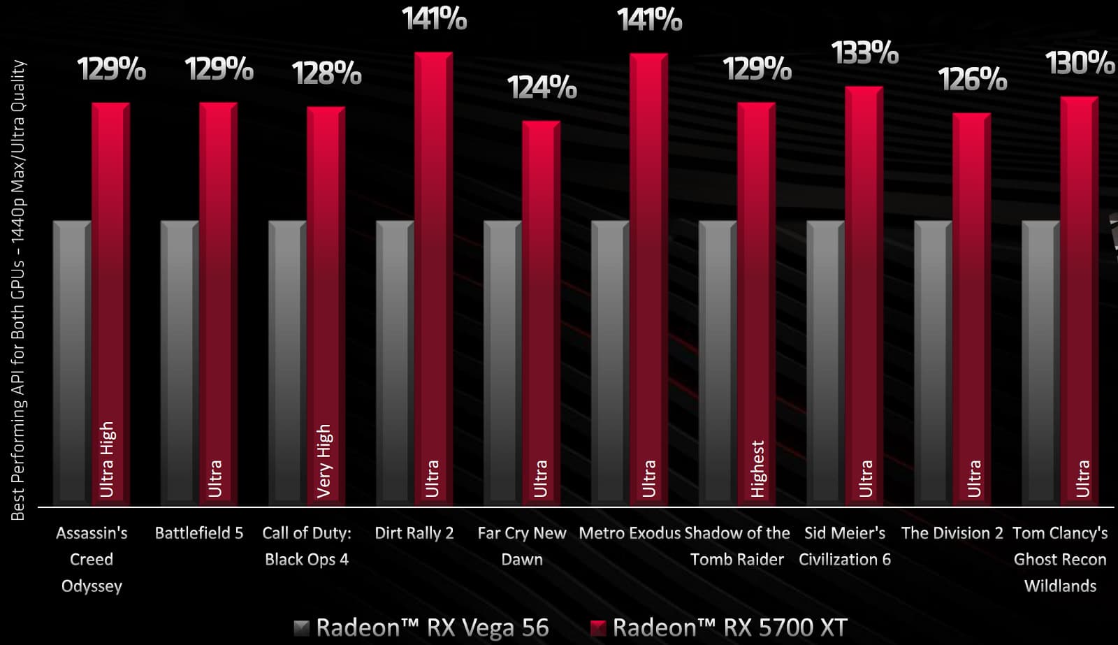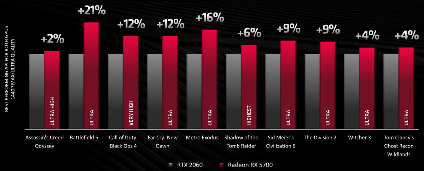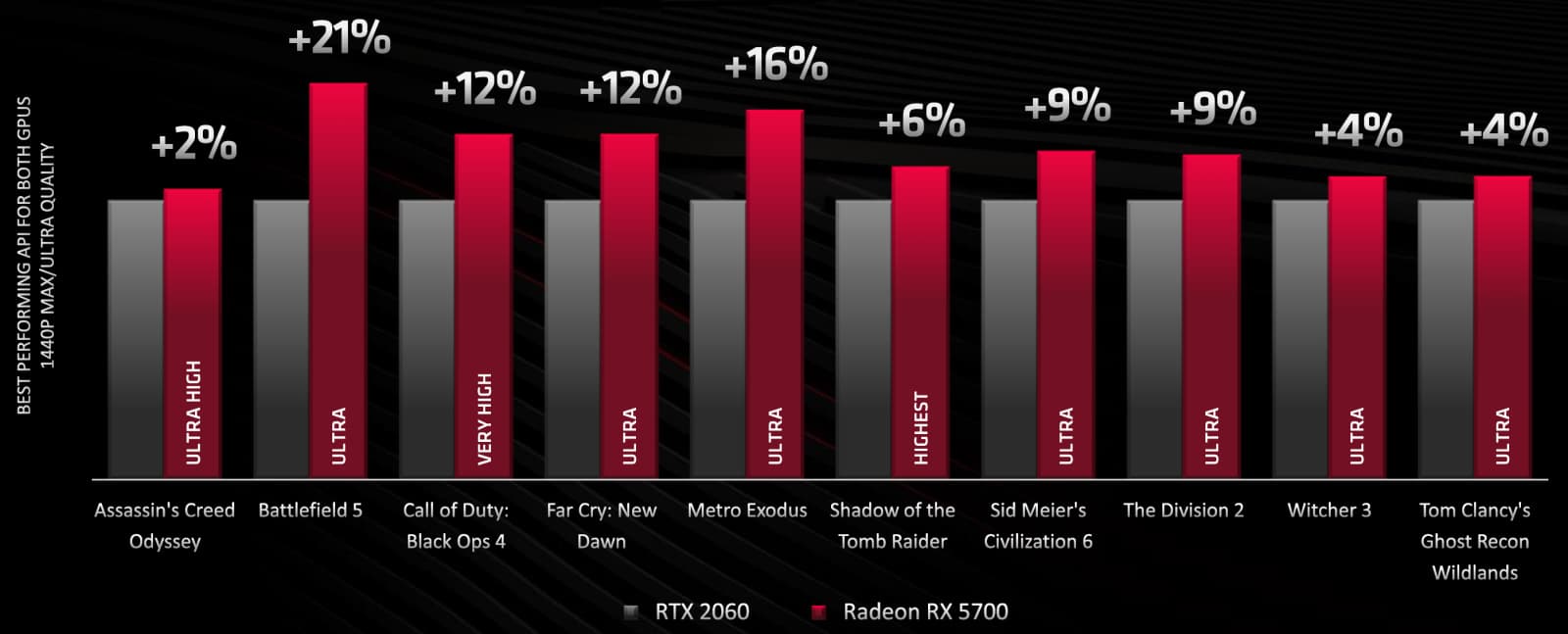 Radeon RX 5700 XT позиционируется в качестве конкурента для GeForce RTX 2070, и по тестам компании AMD в разрешении 1440p в среднем превосходит его по производительности на несколько процентов. Разница в скорости рендеринга достигает 22% для популярной игры Battlefield V, но иногда бывает и отрицательной — для некоторых игр из тех, с разработчиками которых сотрудничал конкурент. Если сравнивать старшую версию с RX Vega 56, то преимущество новой видеокарты Radeon RX 5700 XT над ней составляет уже более чем 25%.