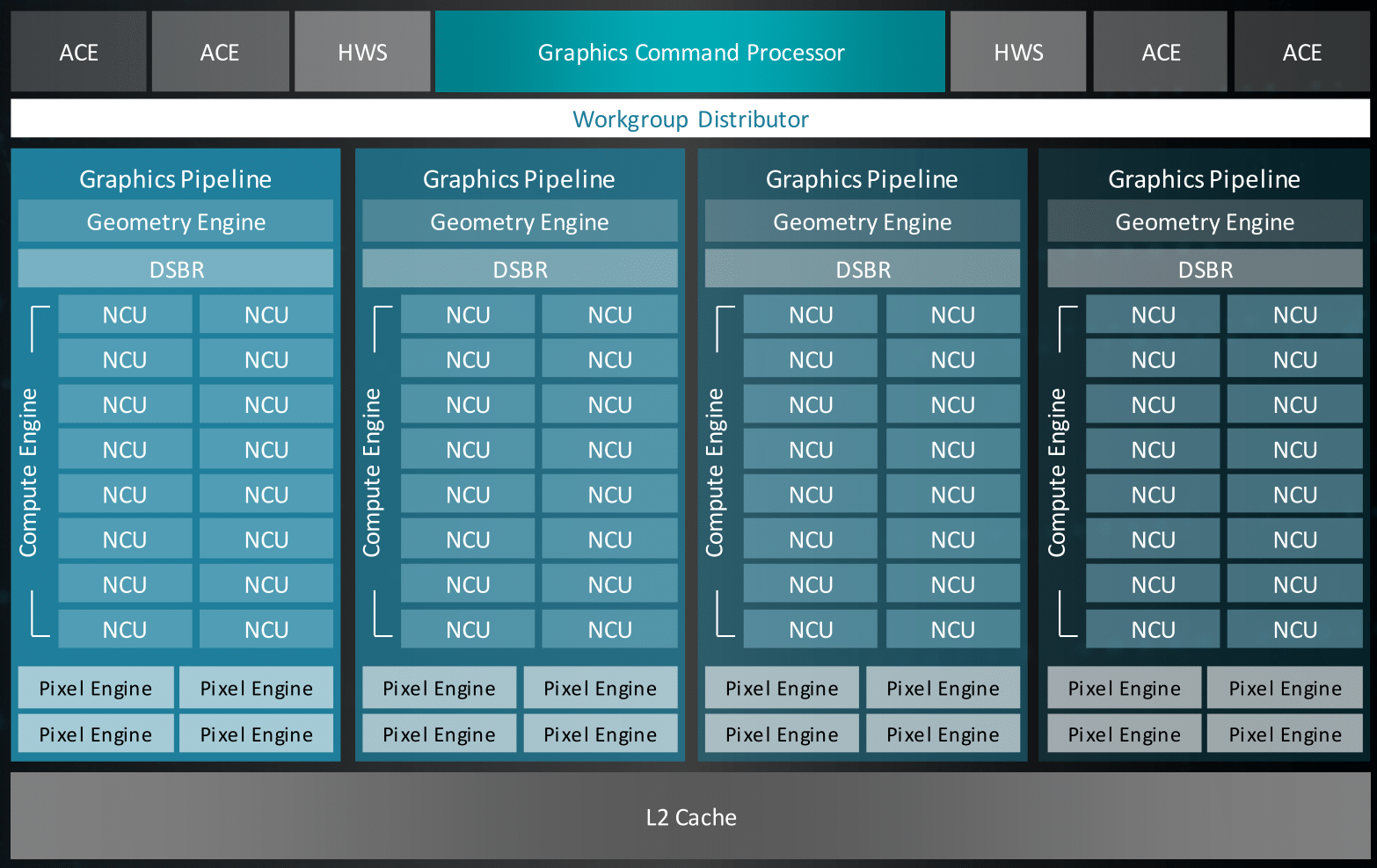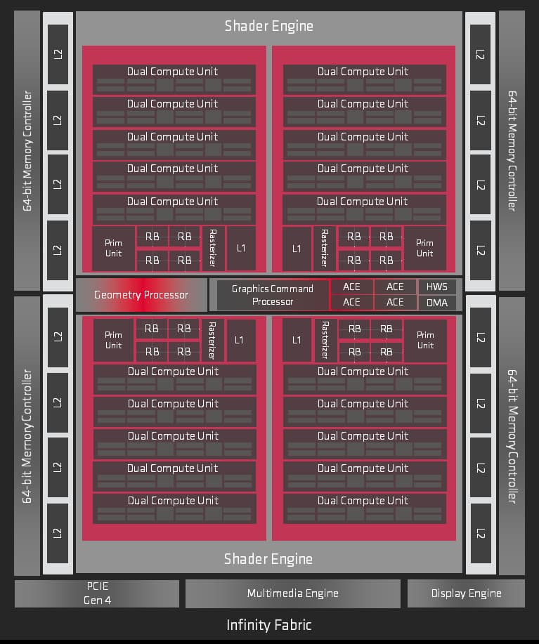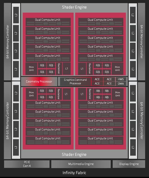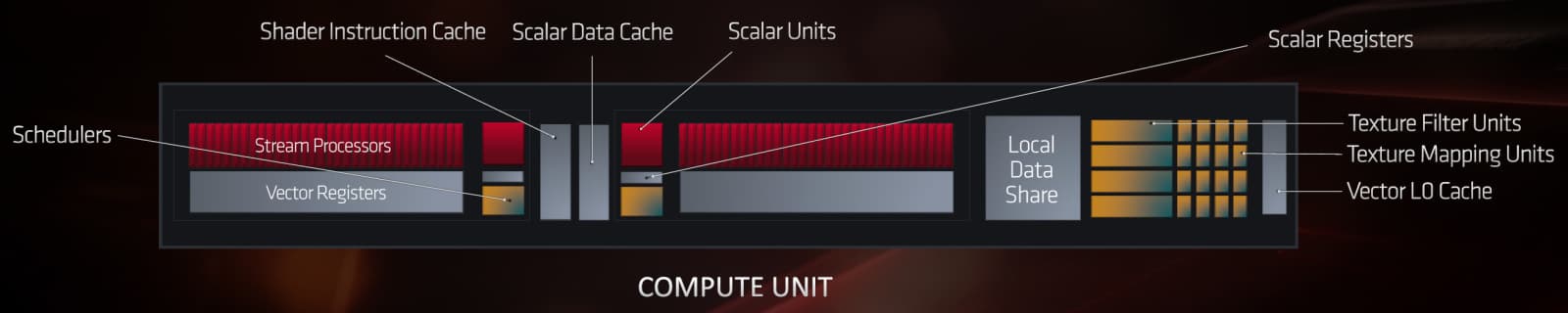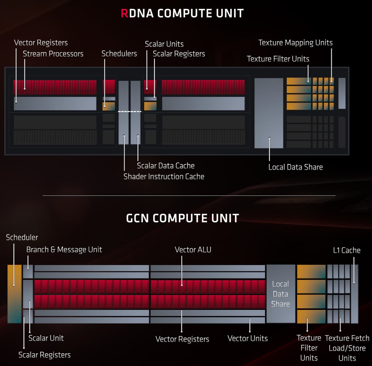 Также претерпел довольно большие изменения и общий дизайн вычислительных блоков, хотя в общих чертах он и схож с тем, что было в GCN. По сравнению с предыдущими GPU, в Navi было удвоено количество скалярных блоков и блоков управления, скалярные инструкции могут исполняться каждый цикл, а не раз в четыре. Появился выделенный скалярный блок и выделенный блок выдачи инструкций, улучшена предвыборка.
